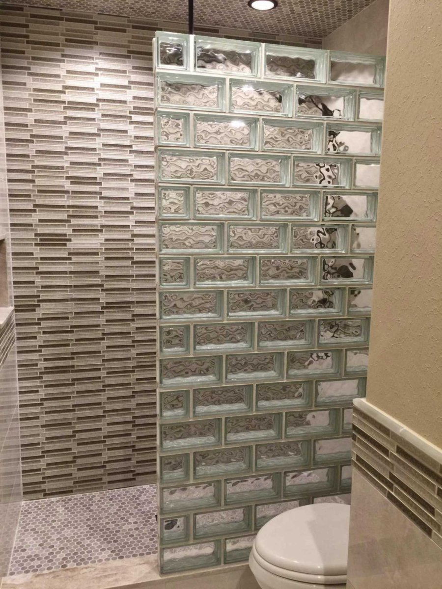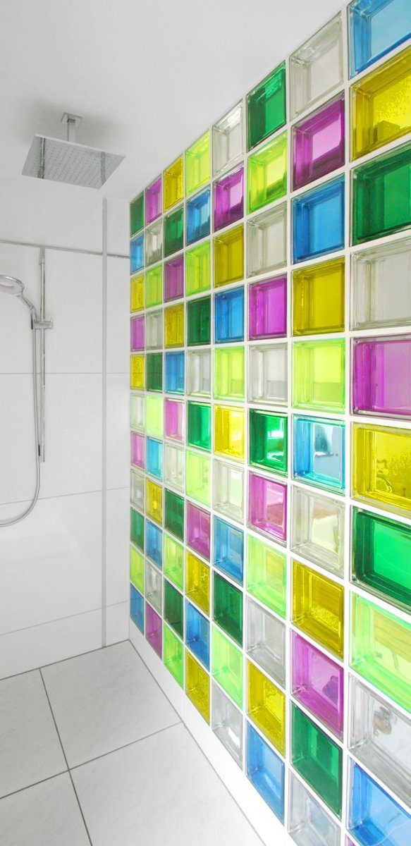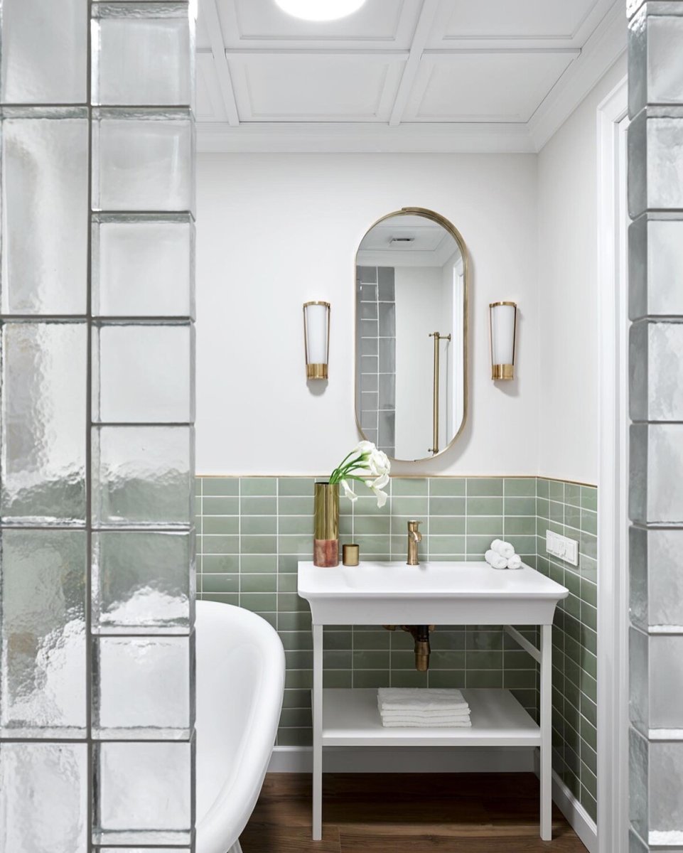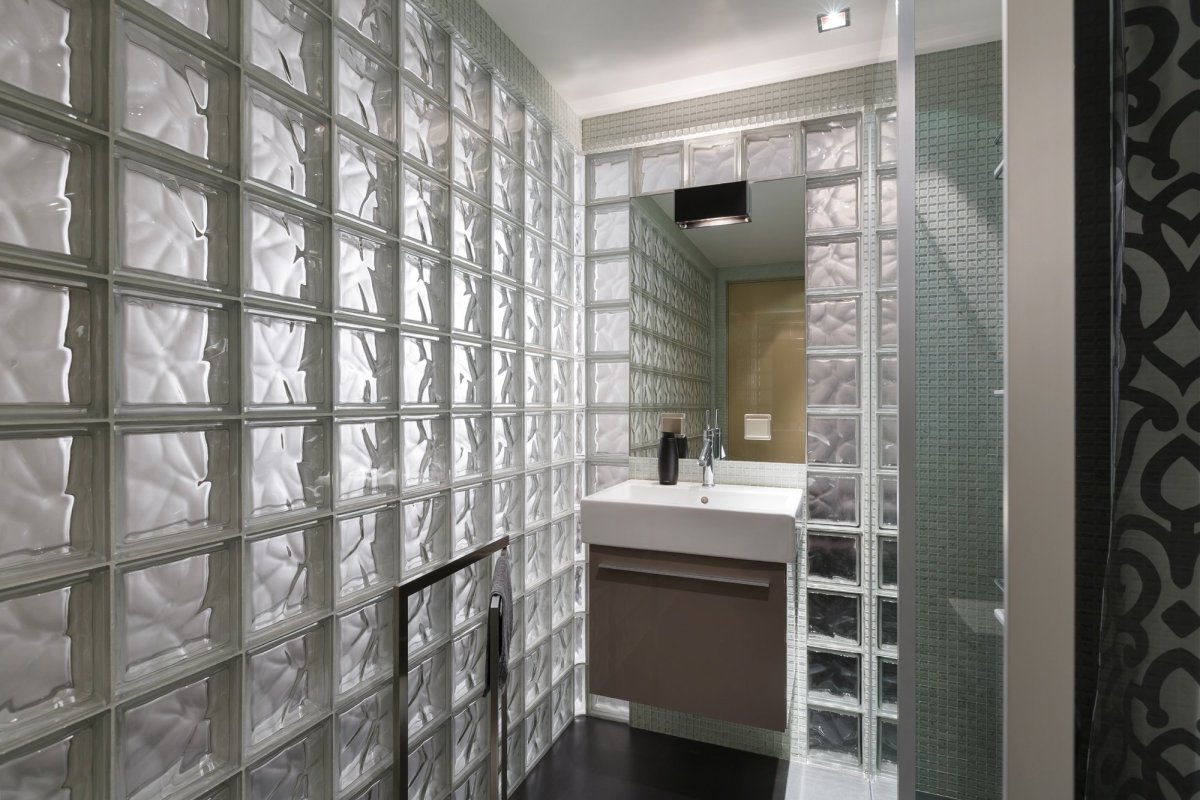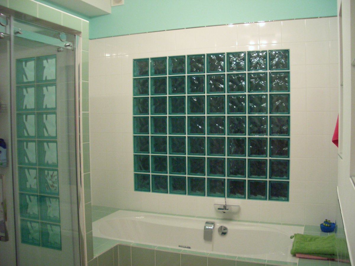 Ванная с зеленой стеной стеклянными БЛОКАМИ