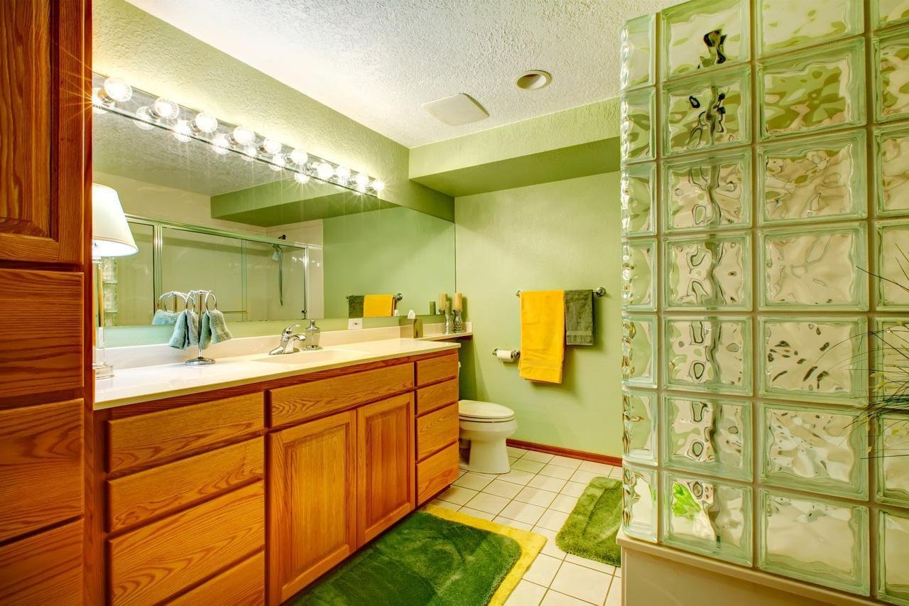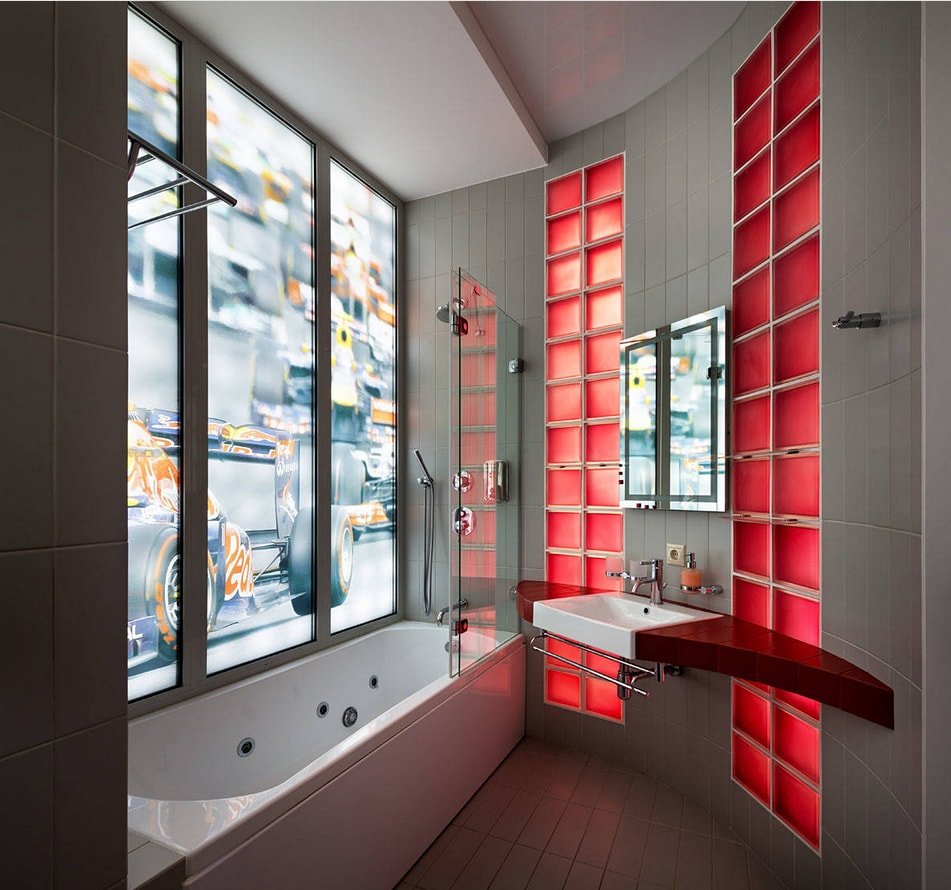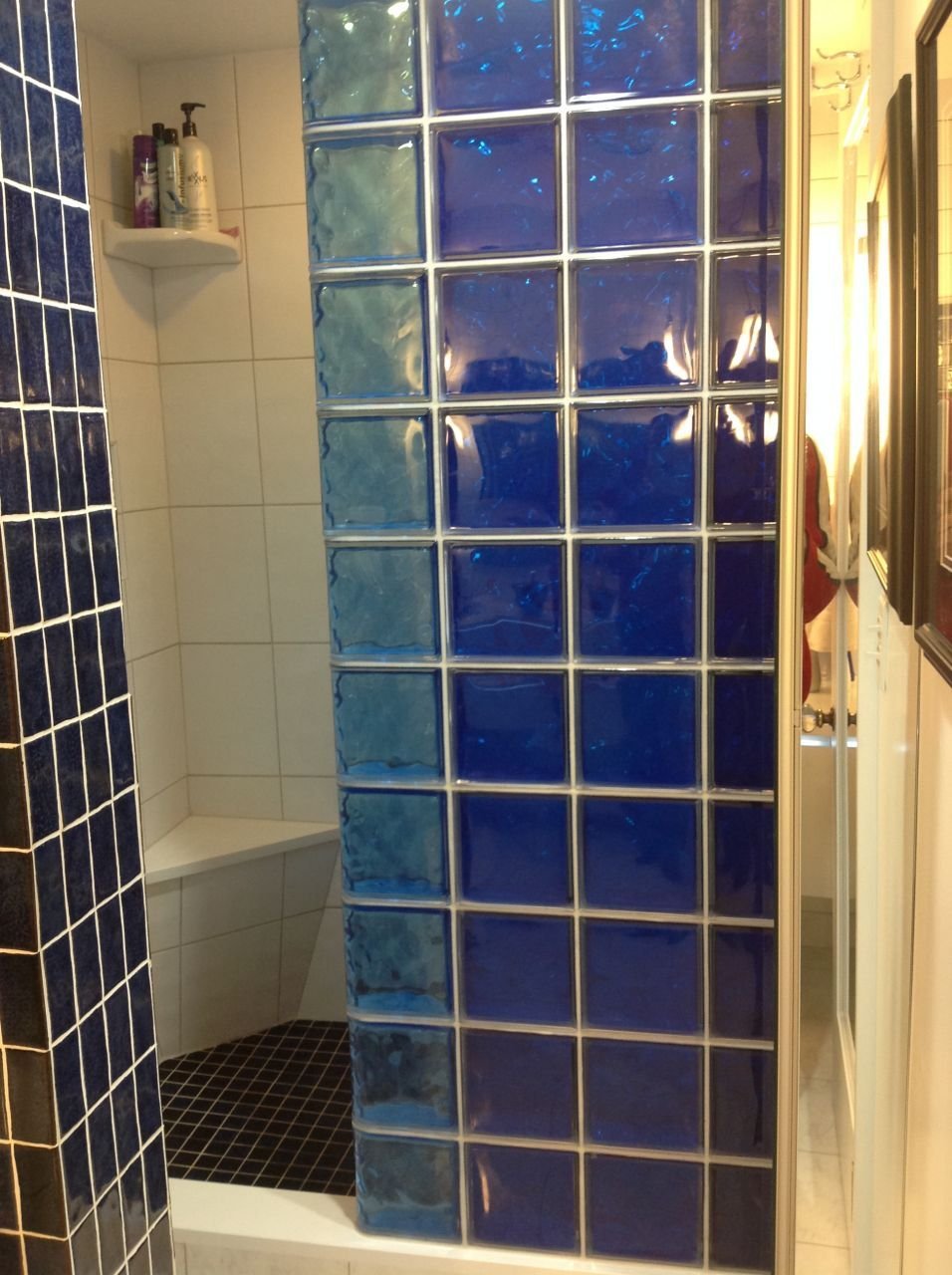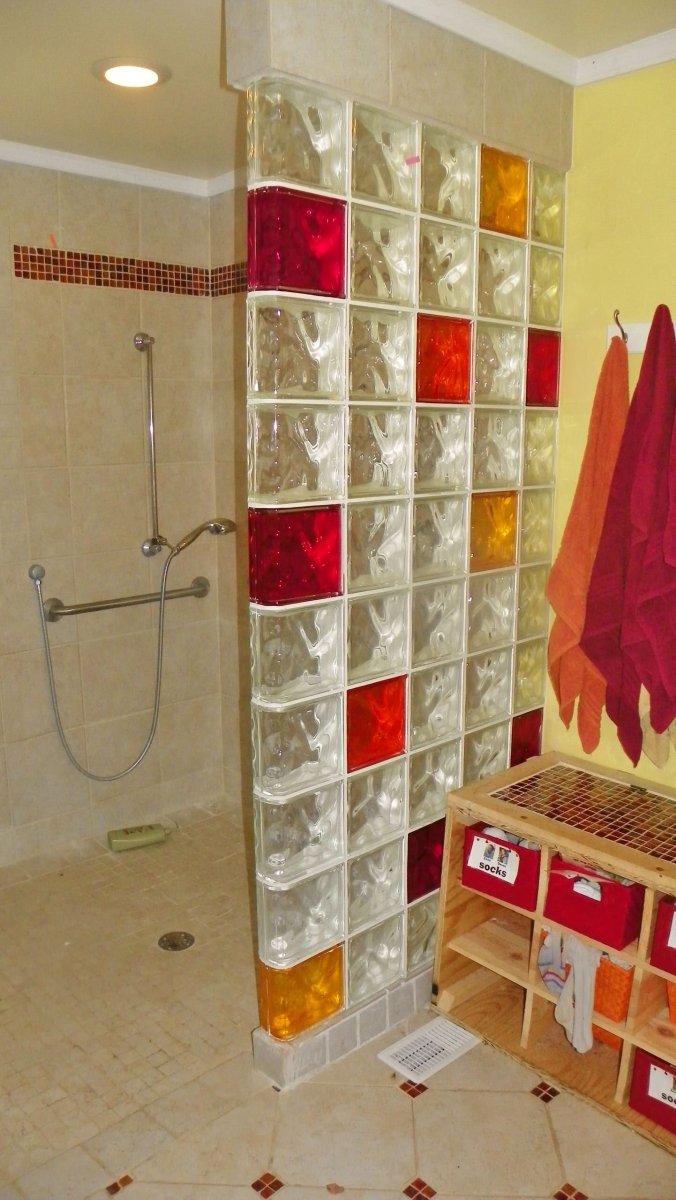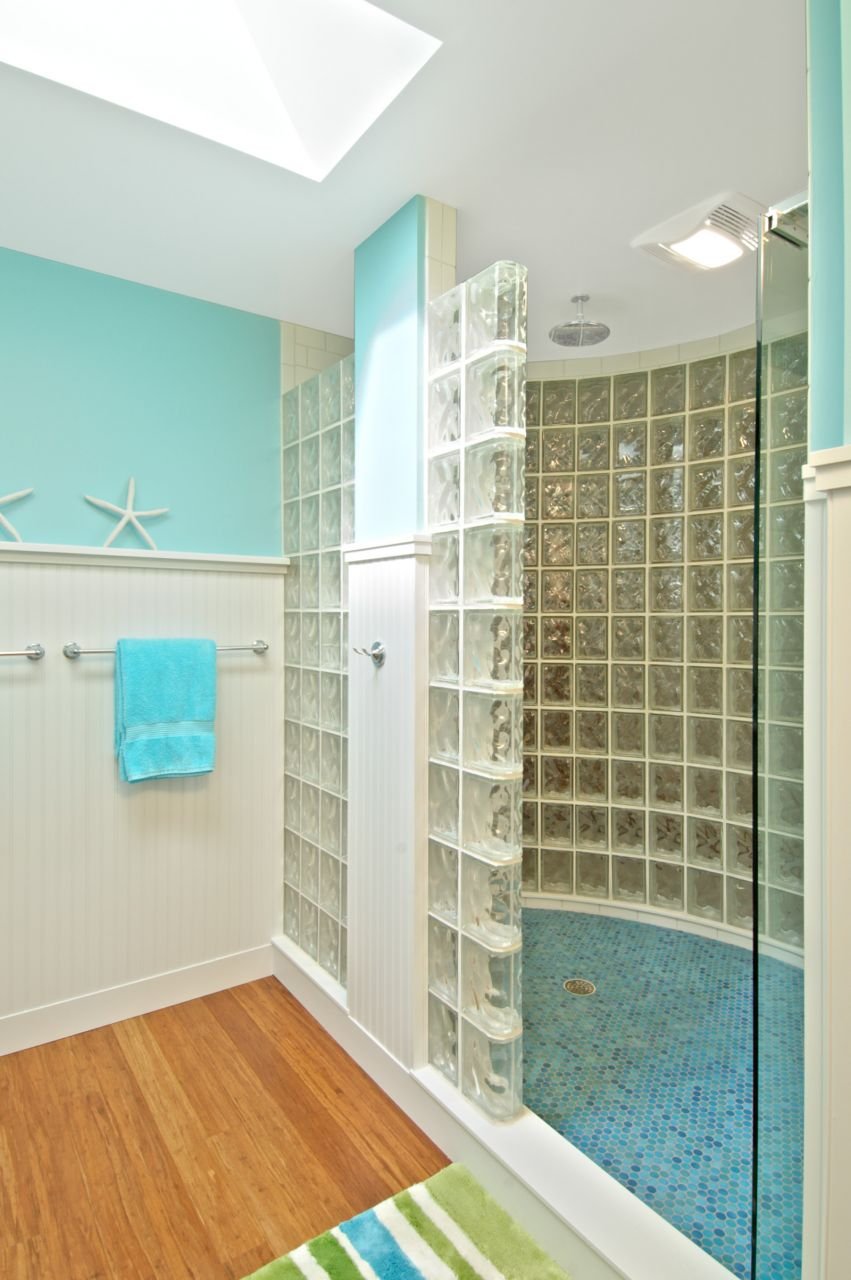 Ванная с зеленой стеной стеклянными БЛОКАМИ