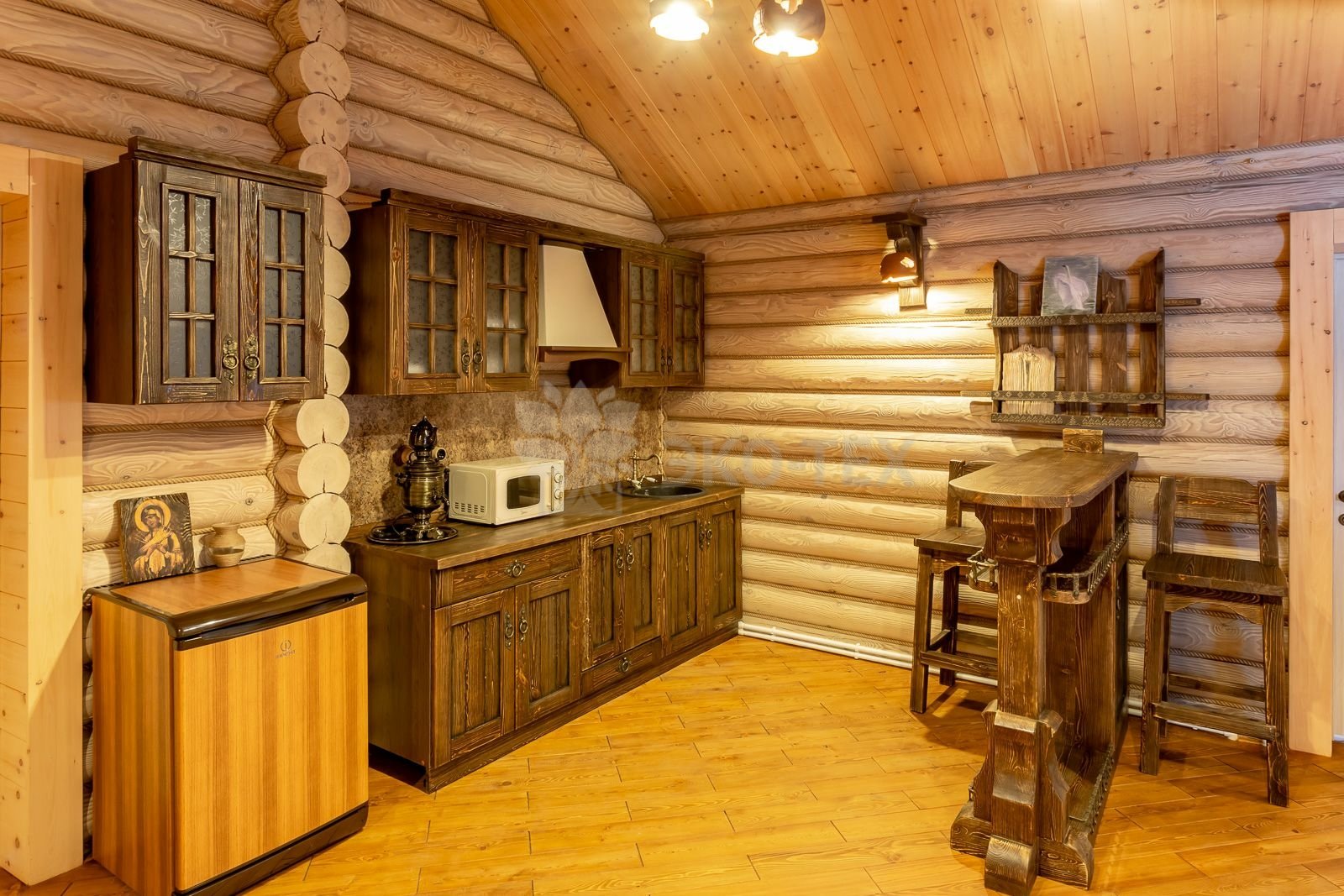 Интерьер кухни в деревянном доме из оцилиндрованного бревна