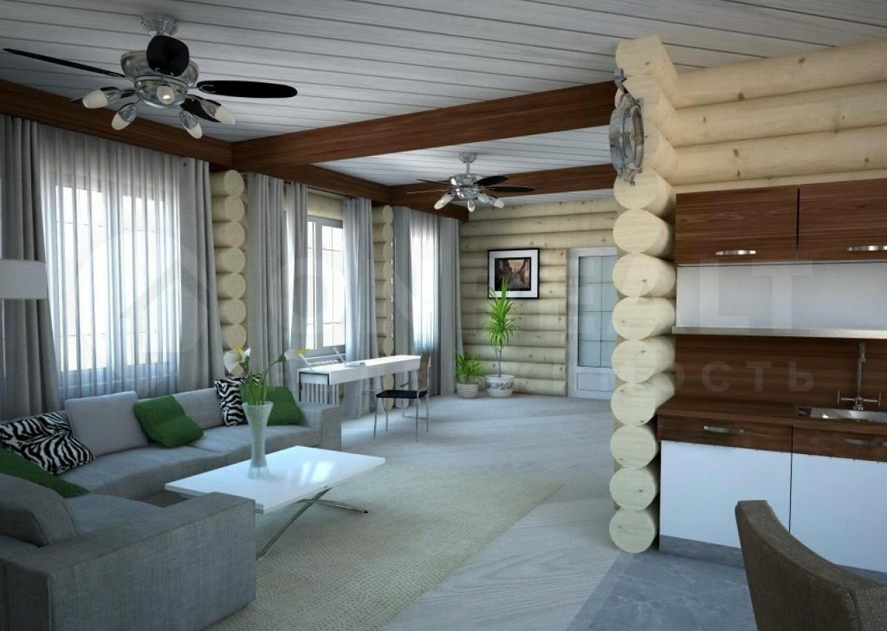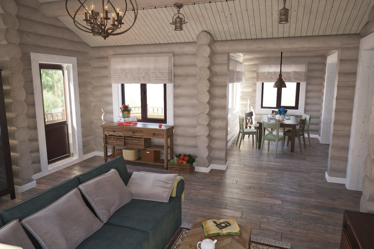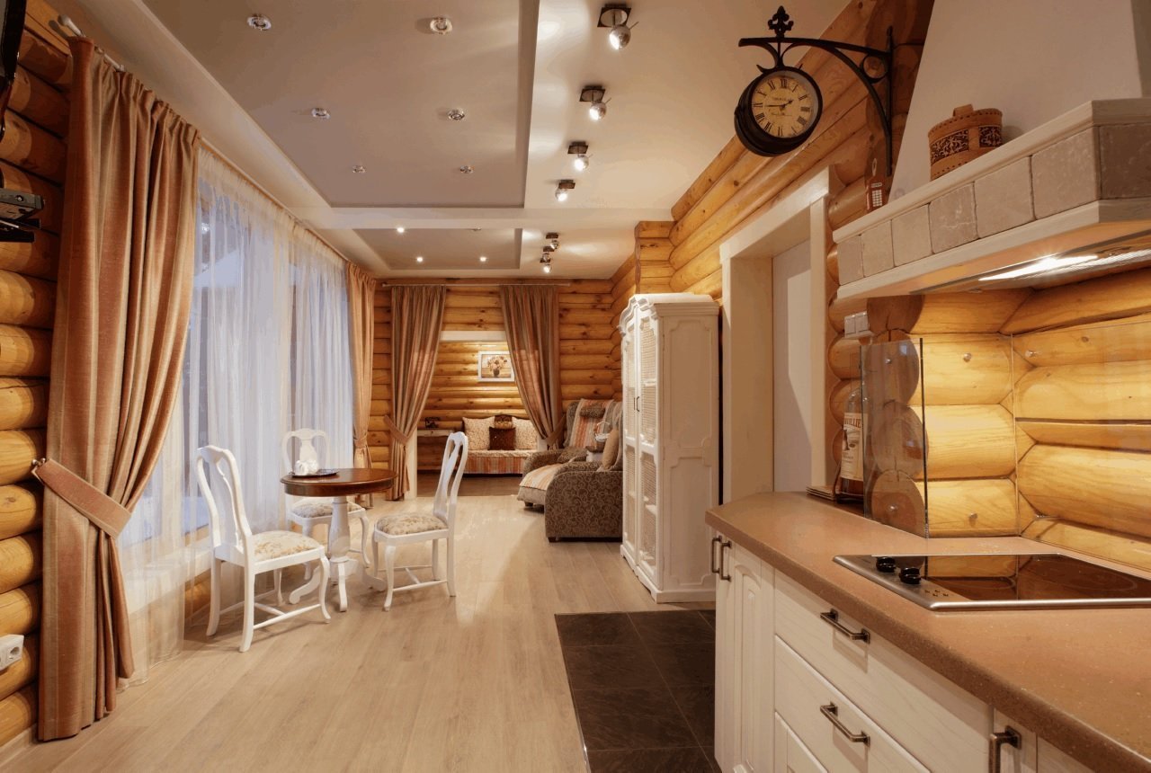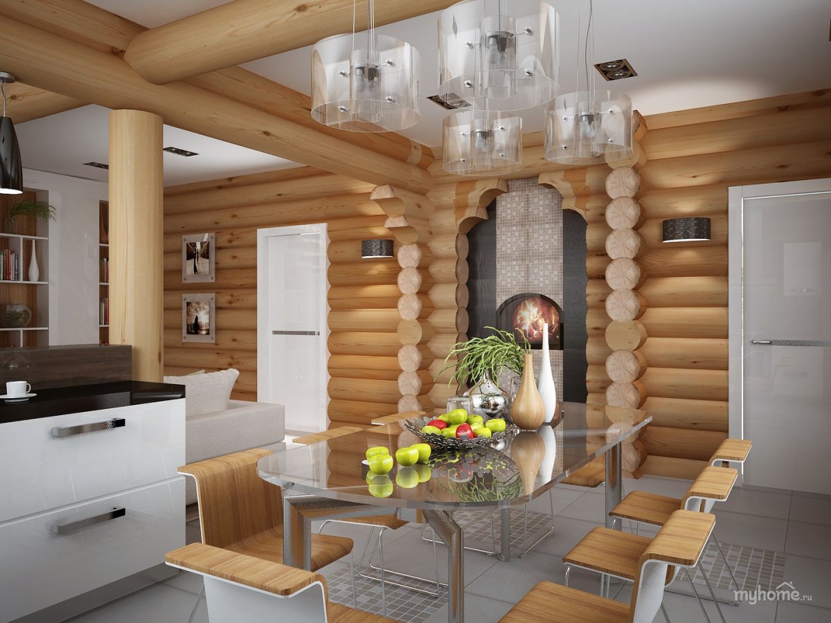 Дом из оцилиндрованного бревна интерьер кухня гостиная