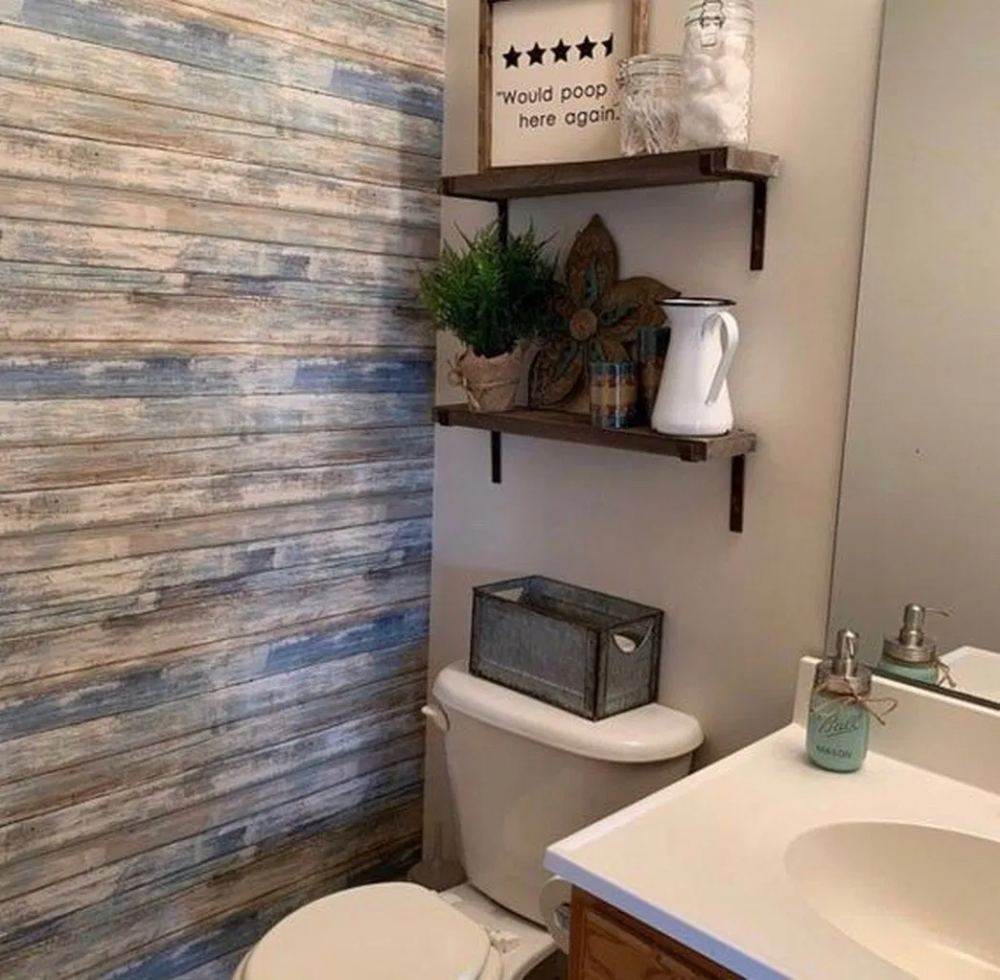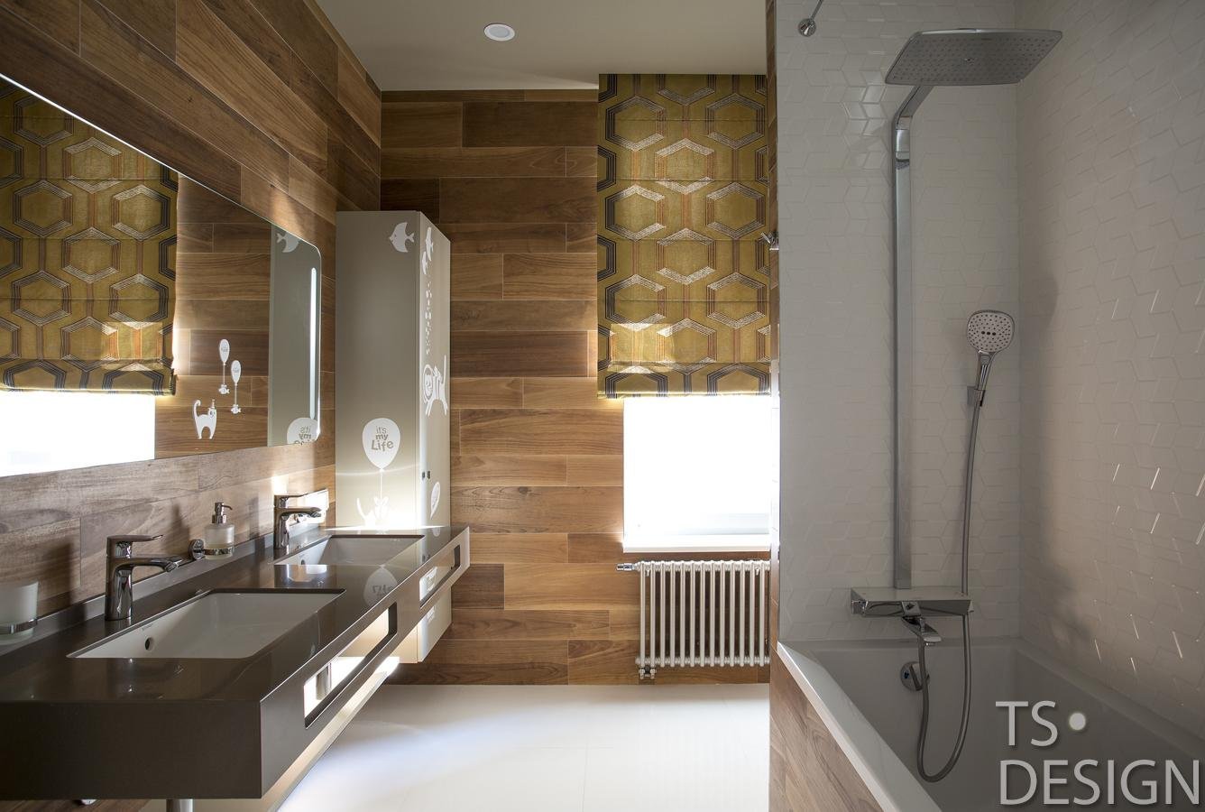 Ванная с акцентной стеной под дерево