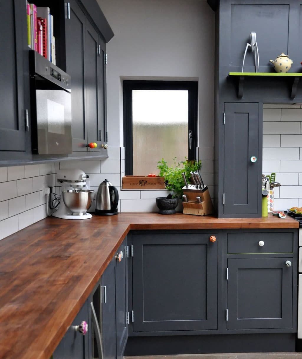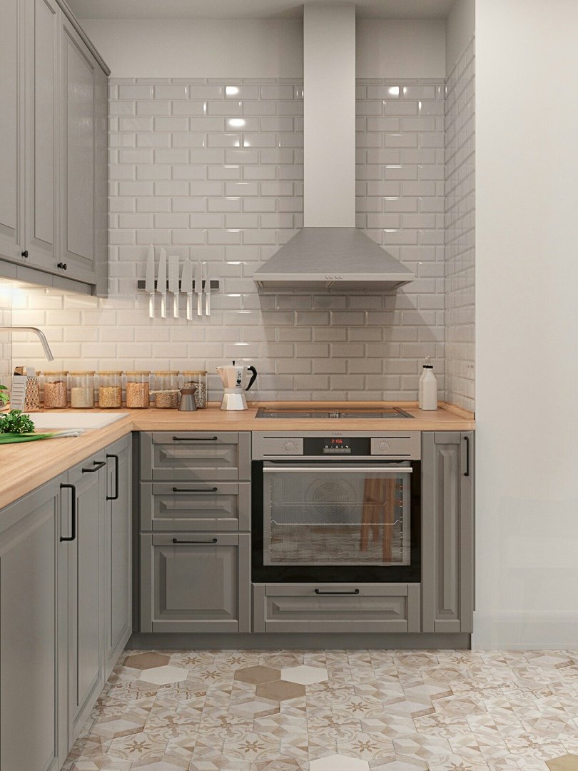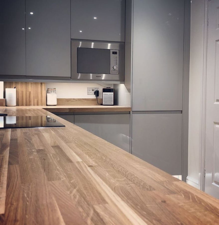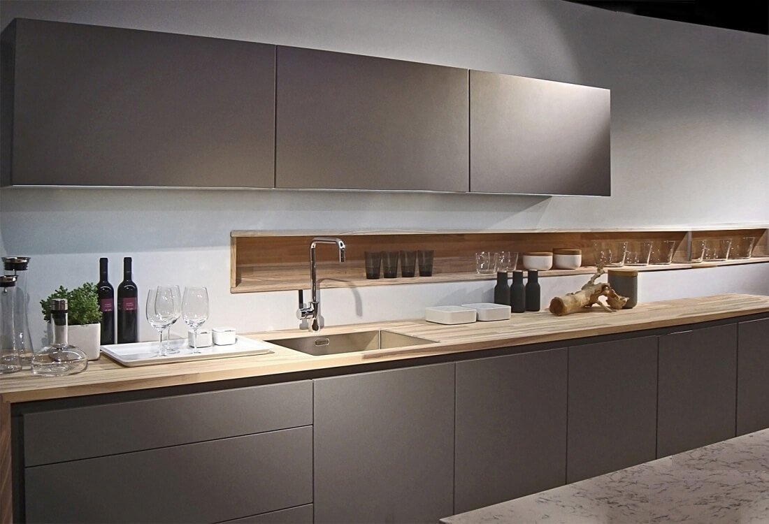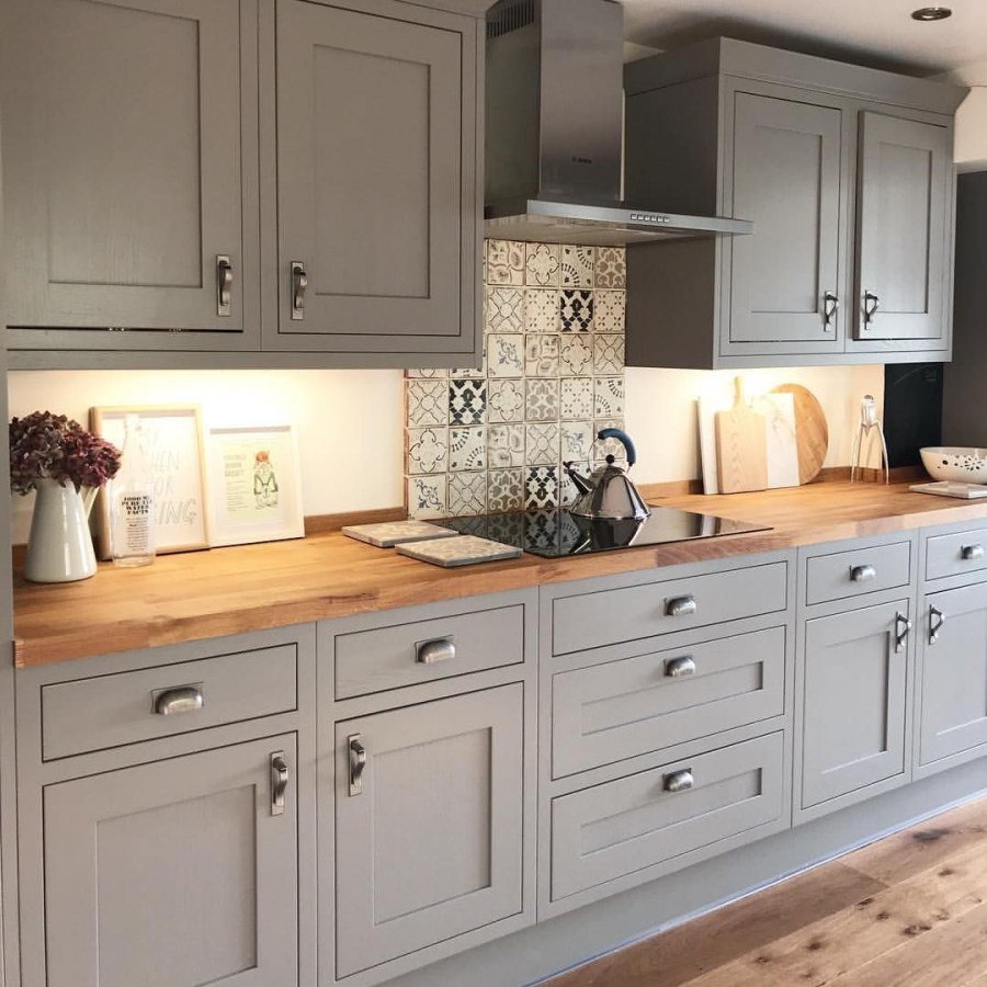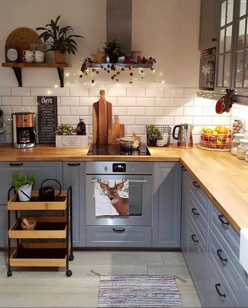 Серая кухня с деревянной столешницей в интерьере