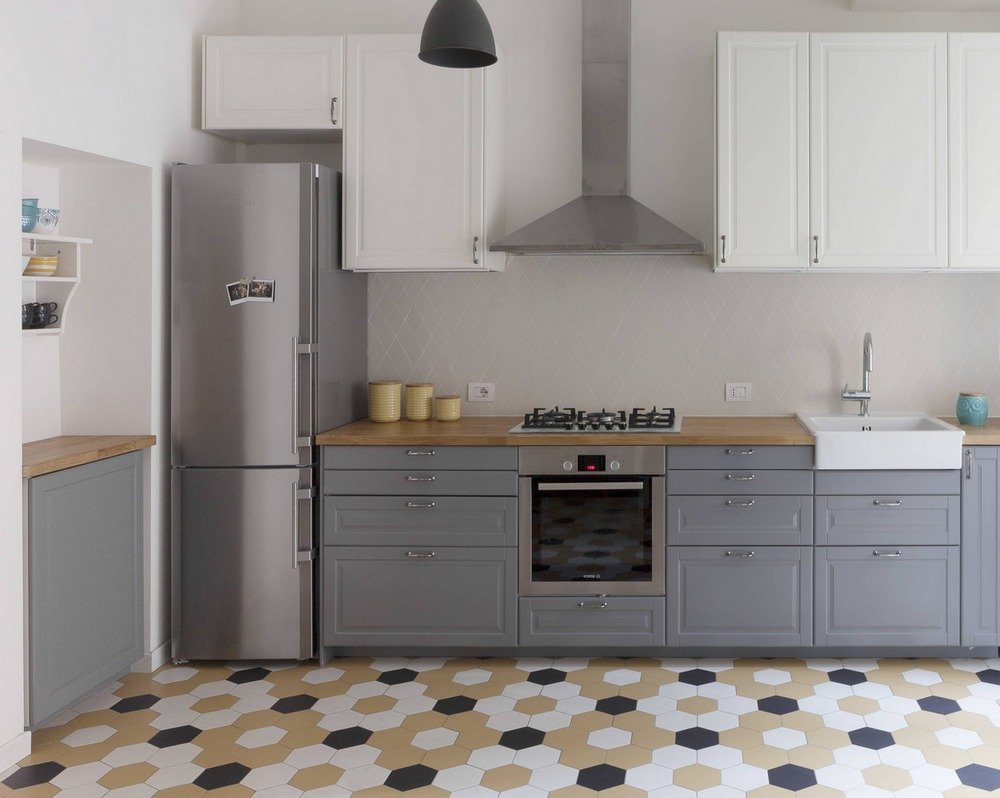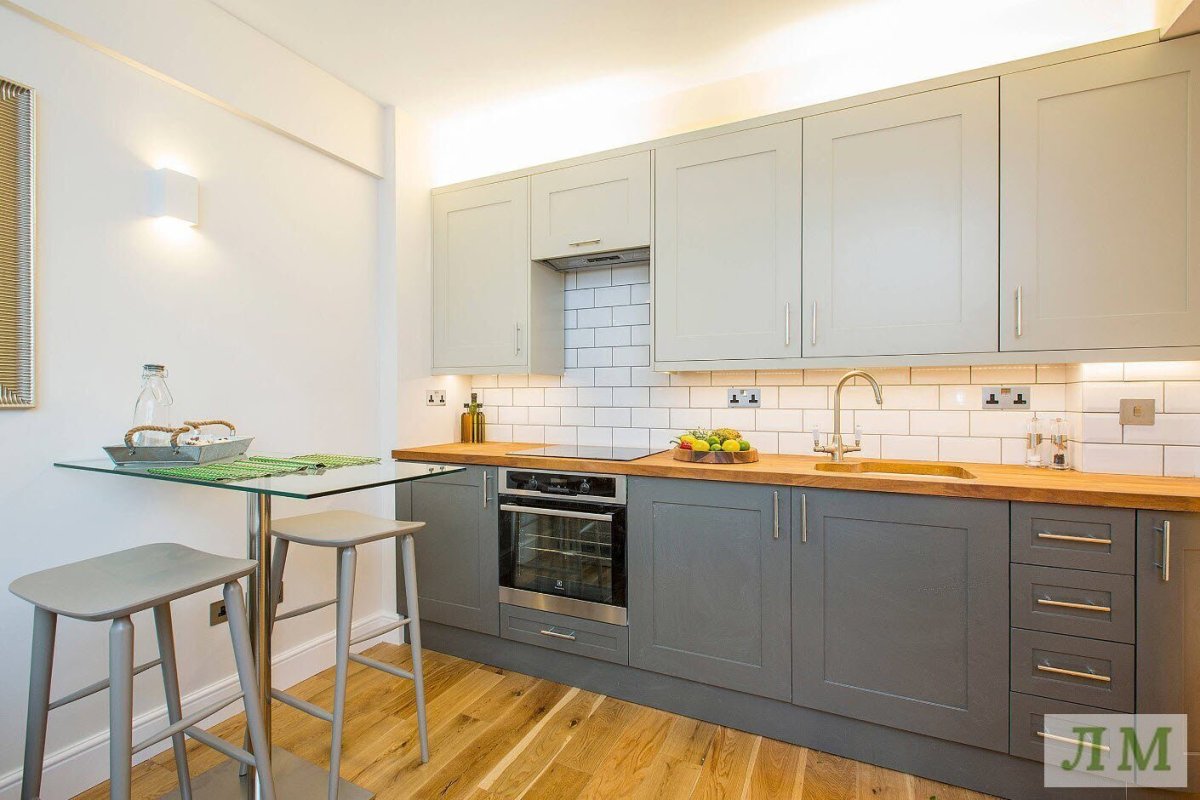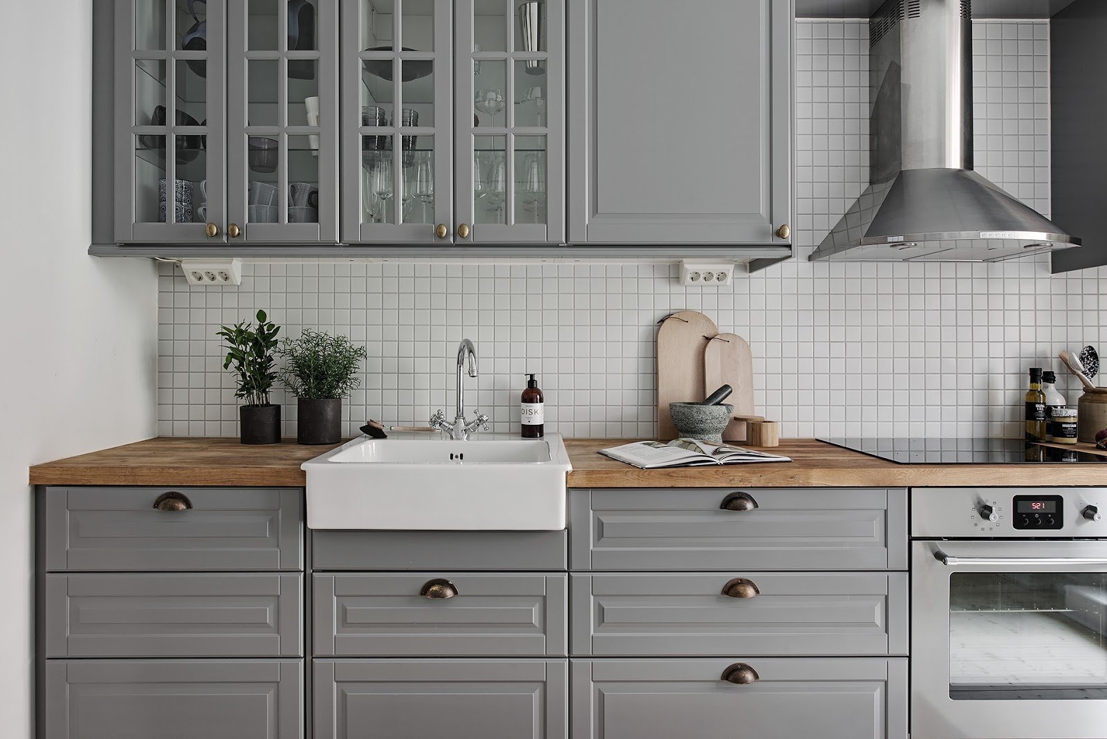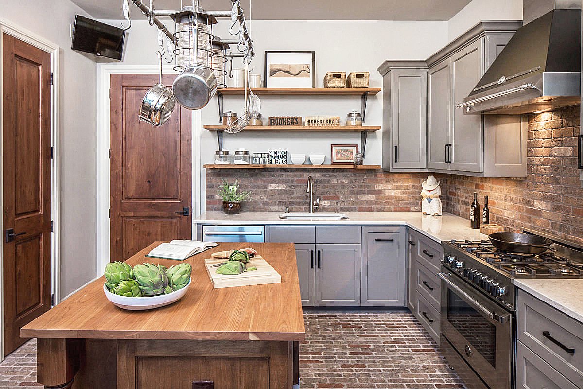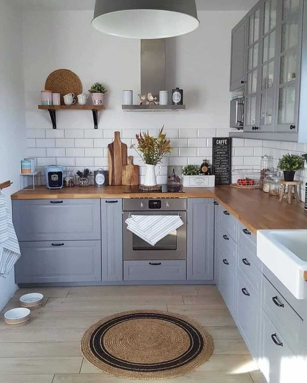 Серая кухня с деревянной столешницей в интерьере