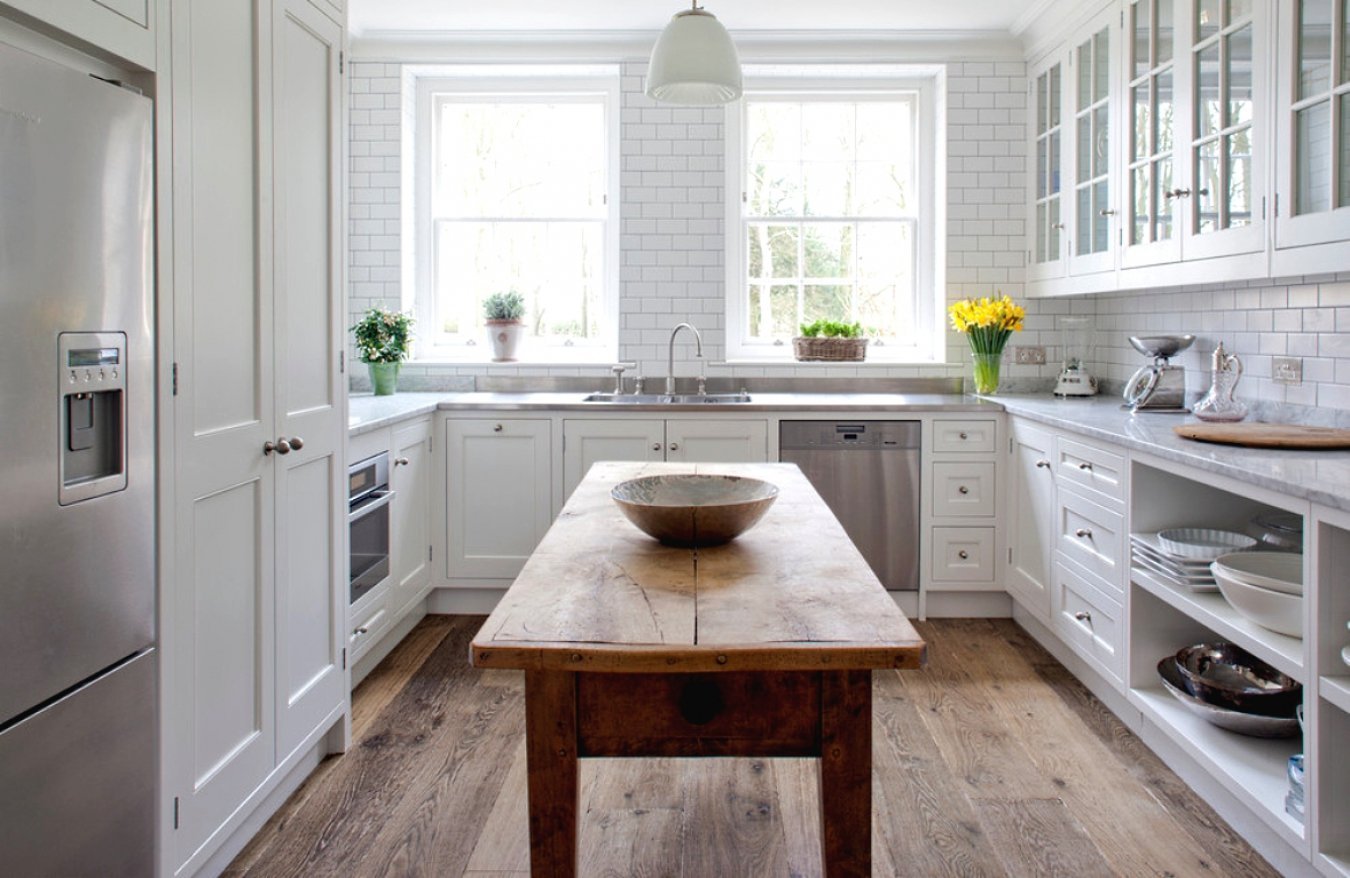 Белая кухня с деревянной столешницей