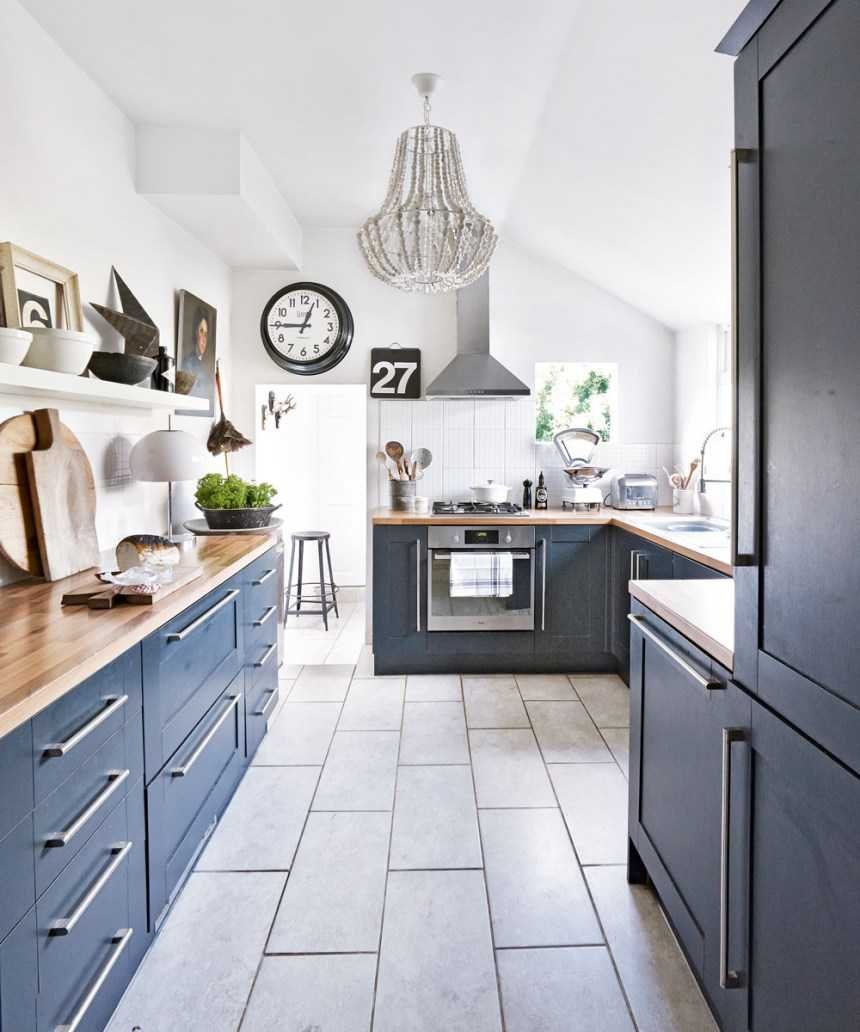 Голубая кухня с деревянной столешницей