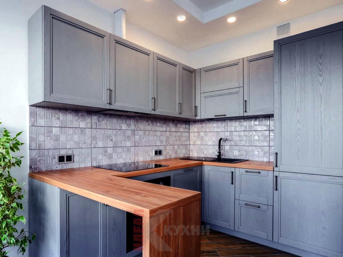 Серая кухня столешница дерево