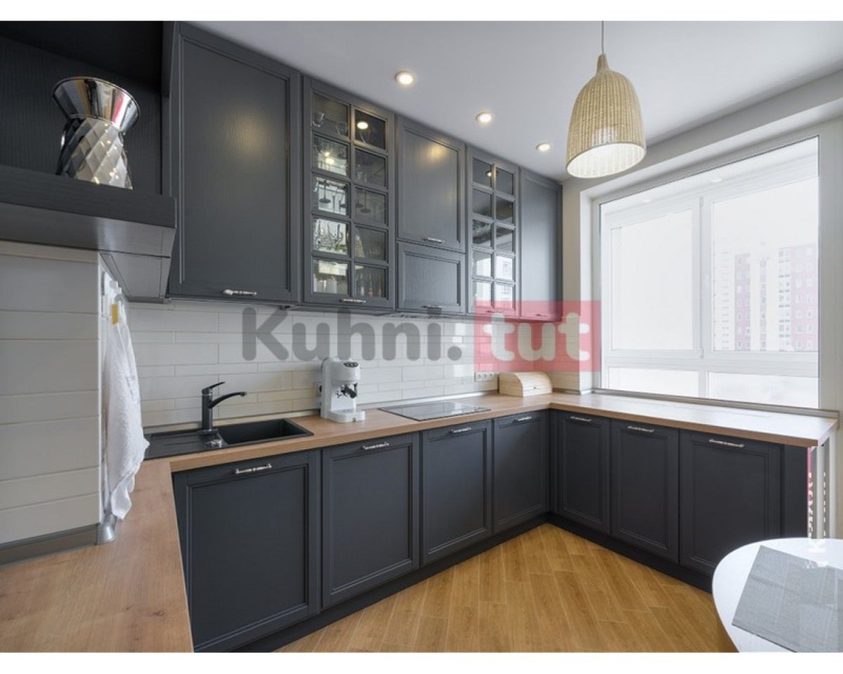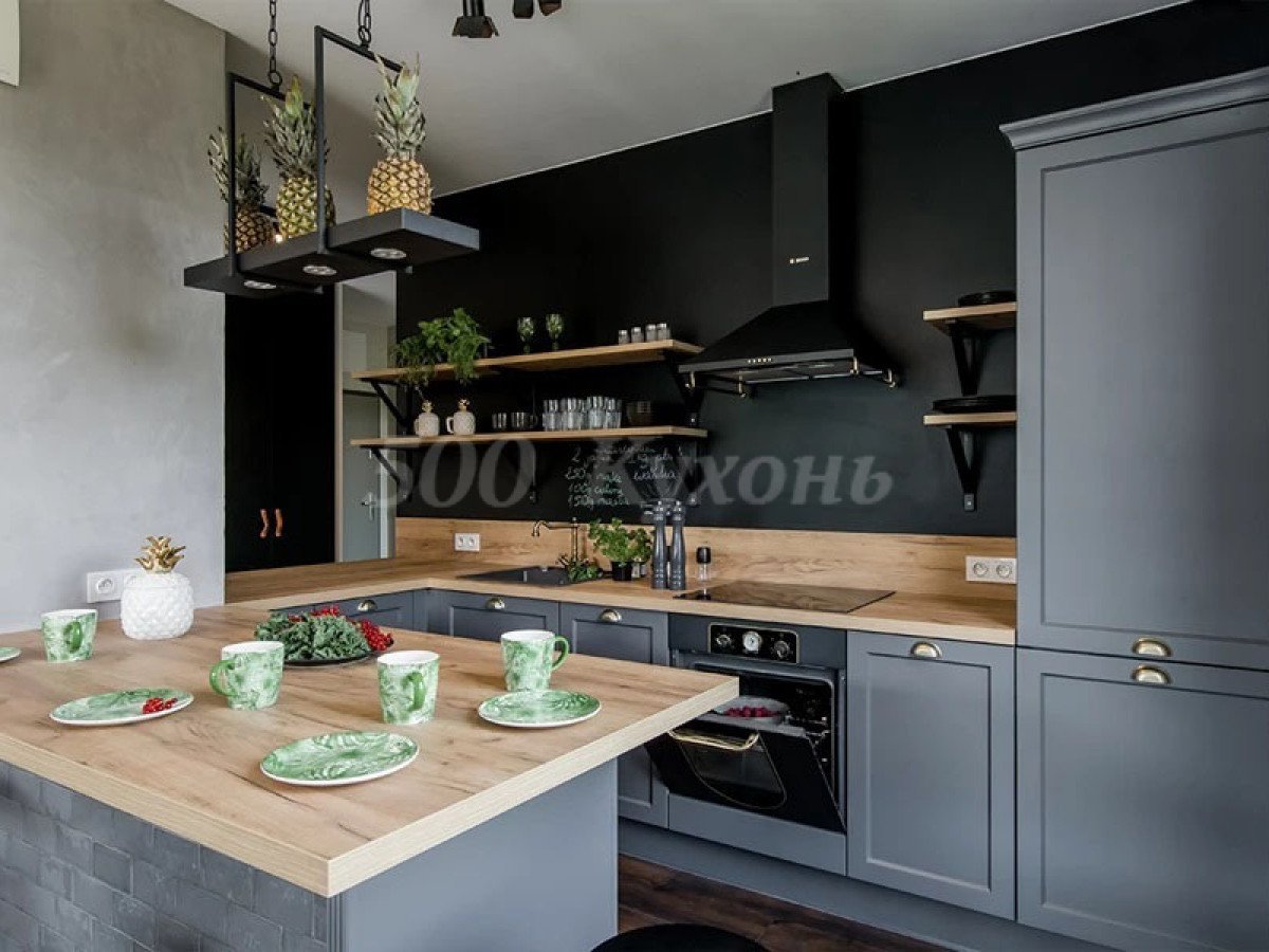 Графитовая кухня с деревянной столешницей