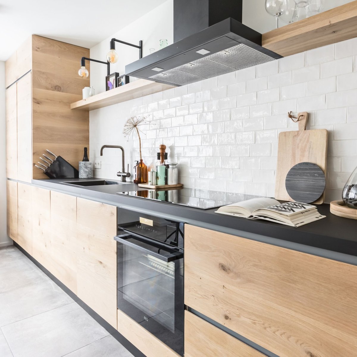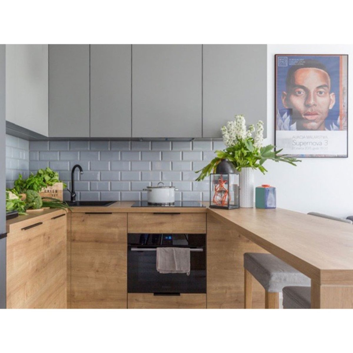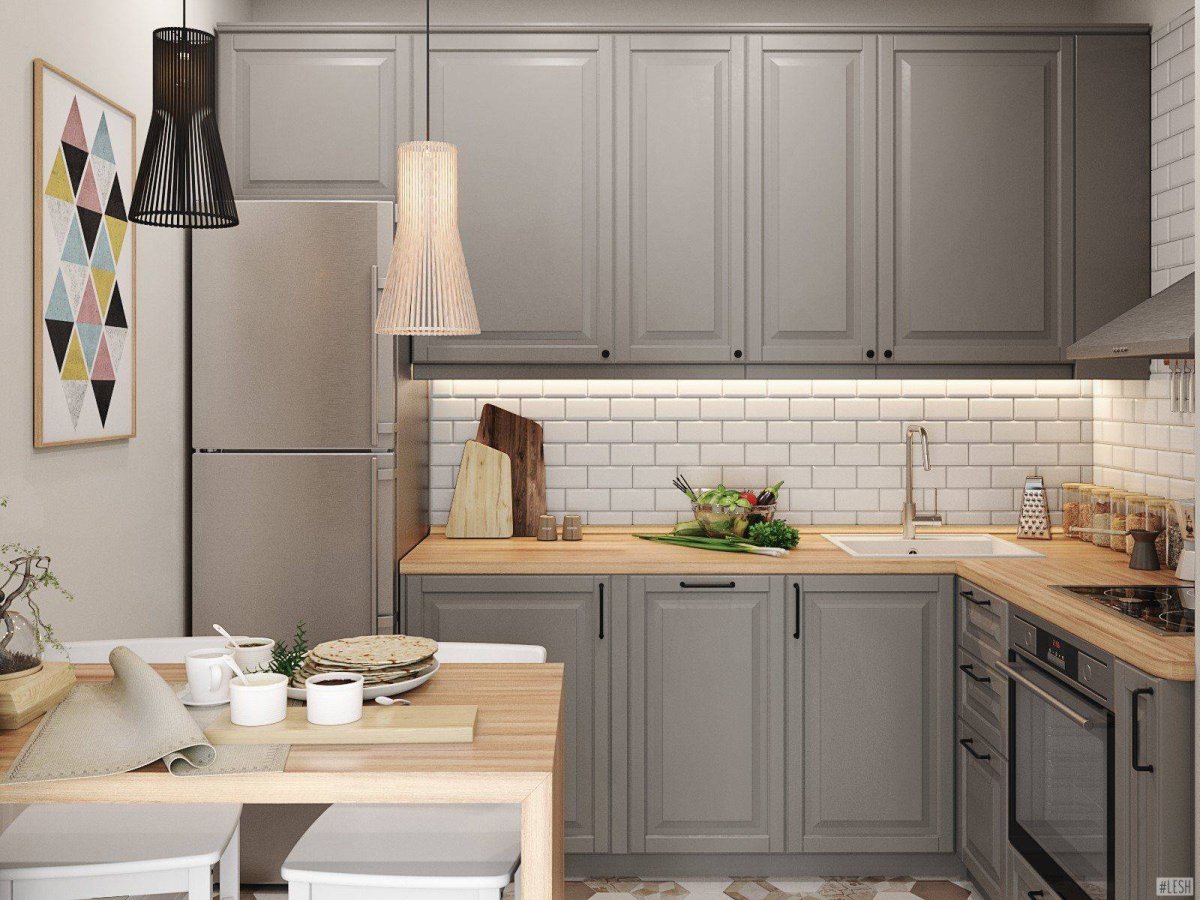 Кухня в скандинавском стиле с деревянной столешницей