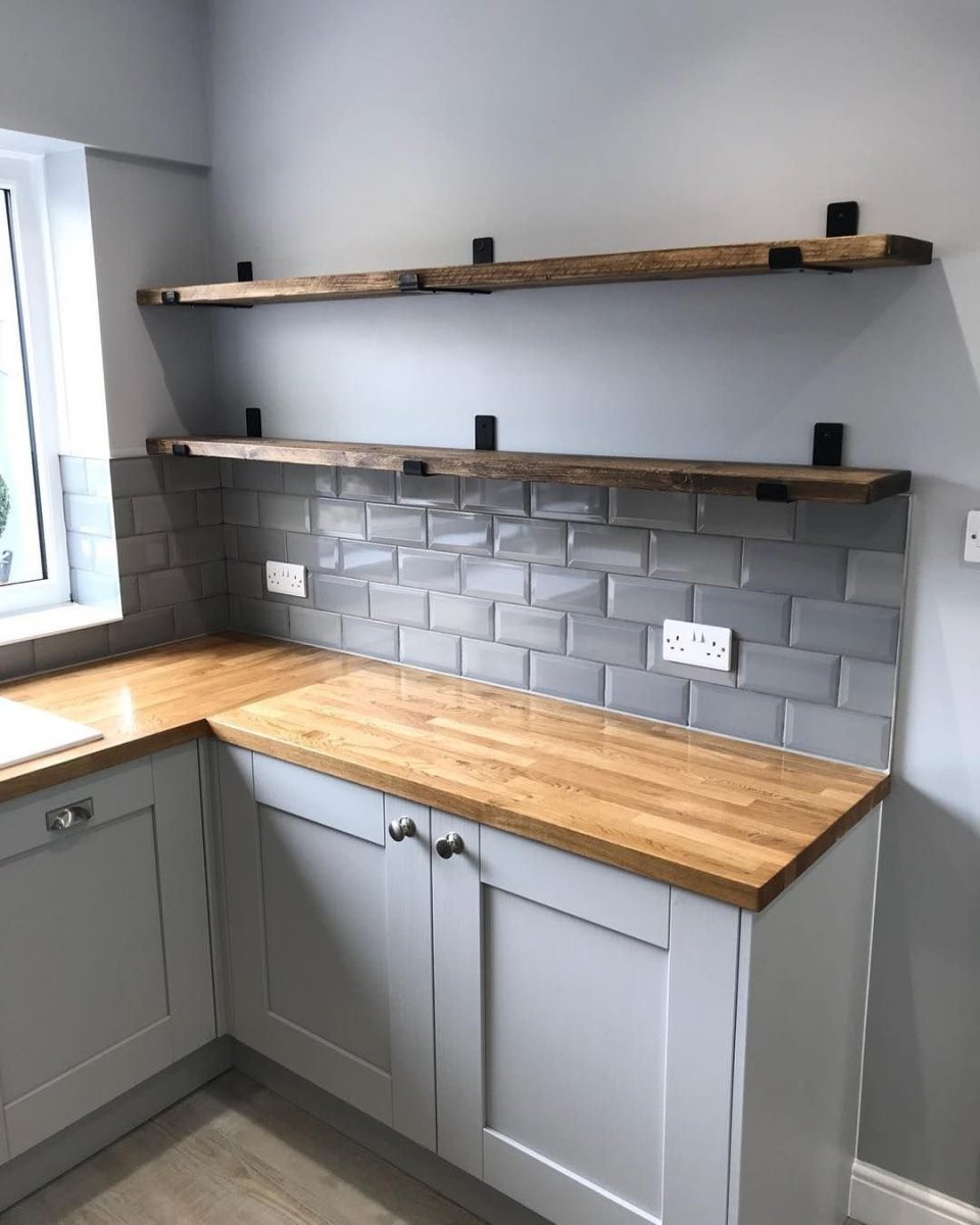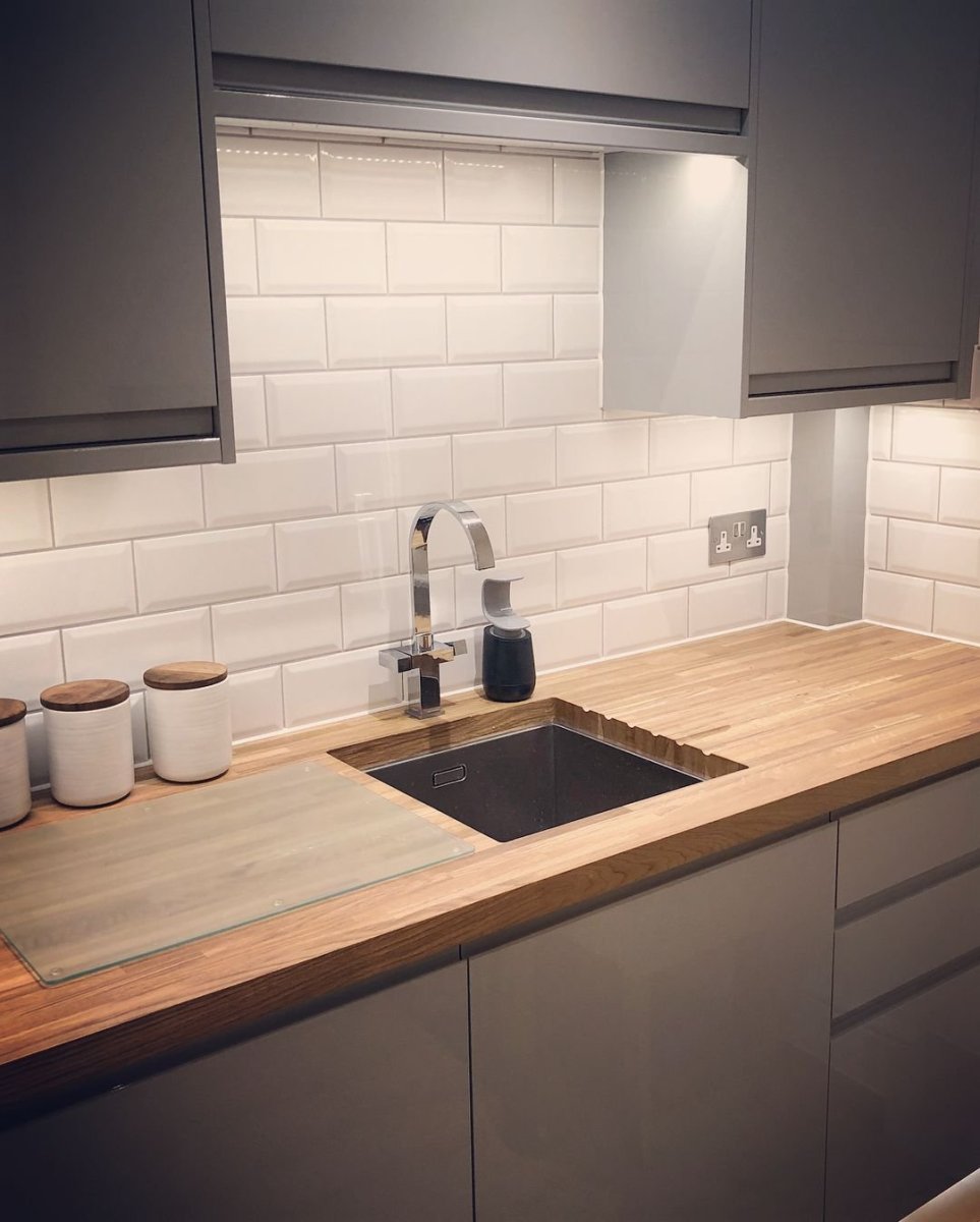 Серая кухня с деревянной столешницей и фартуком