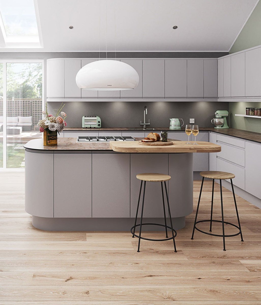 Светло серая кухня с деревянной столешницей