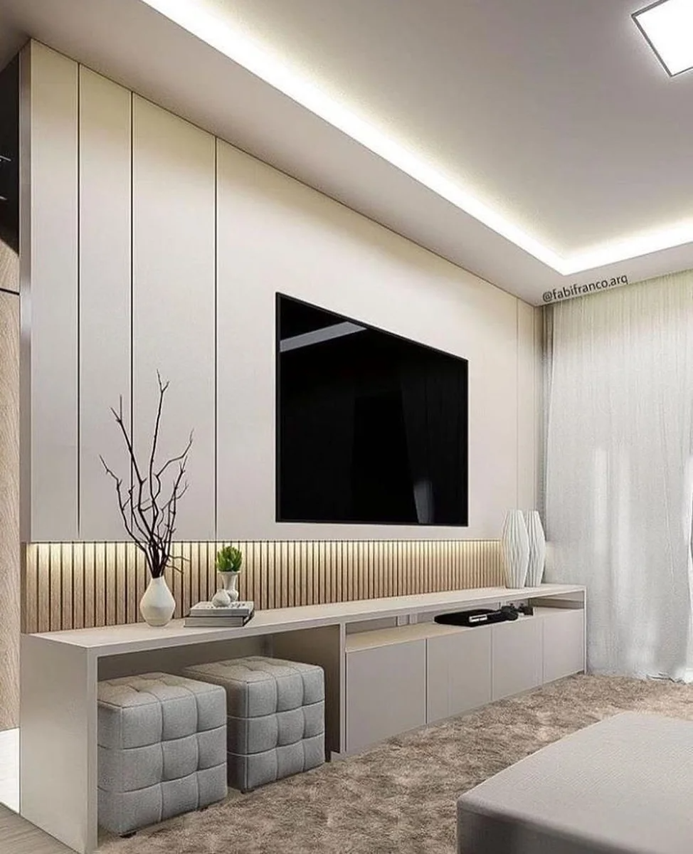 Современный интерьер гостиной с большим телевизорам