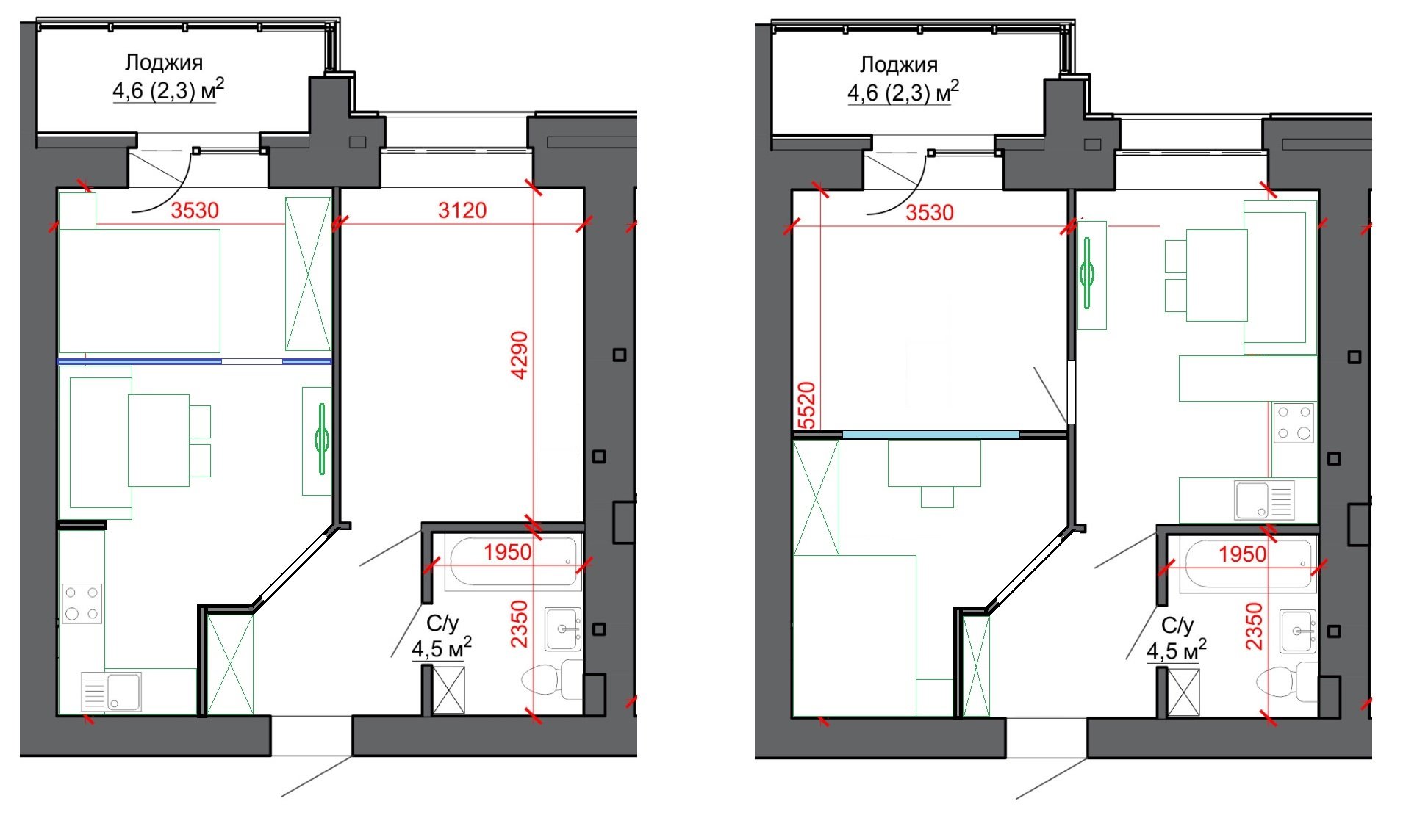 Перепланировка однокомнатной квартиры в двухкомнатную 33 кв.м