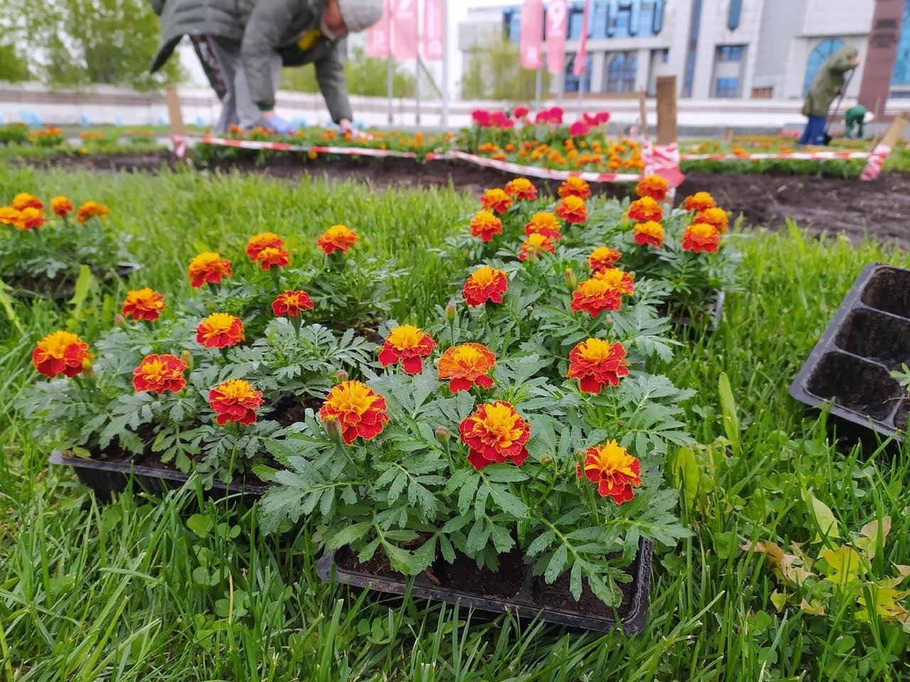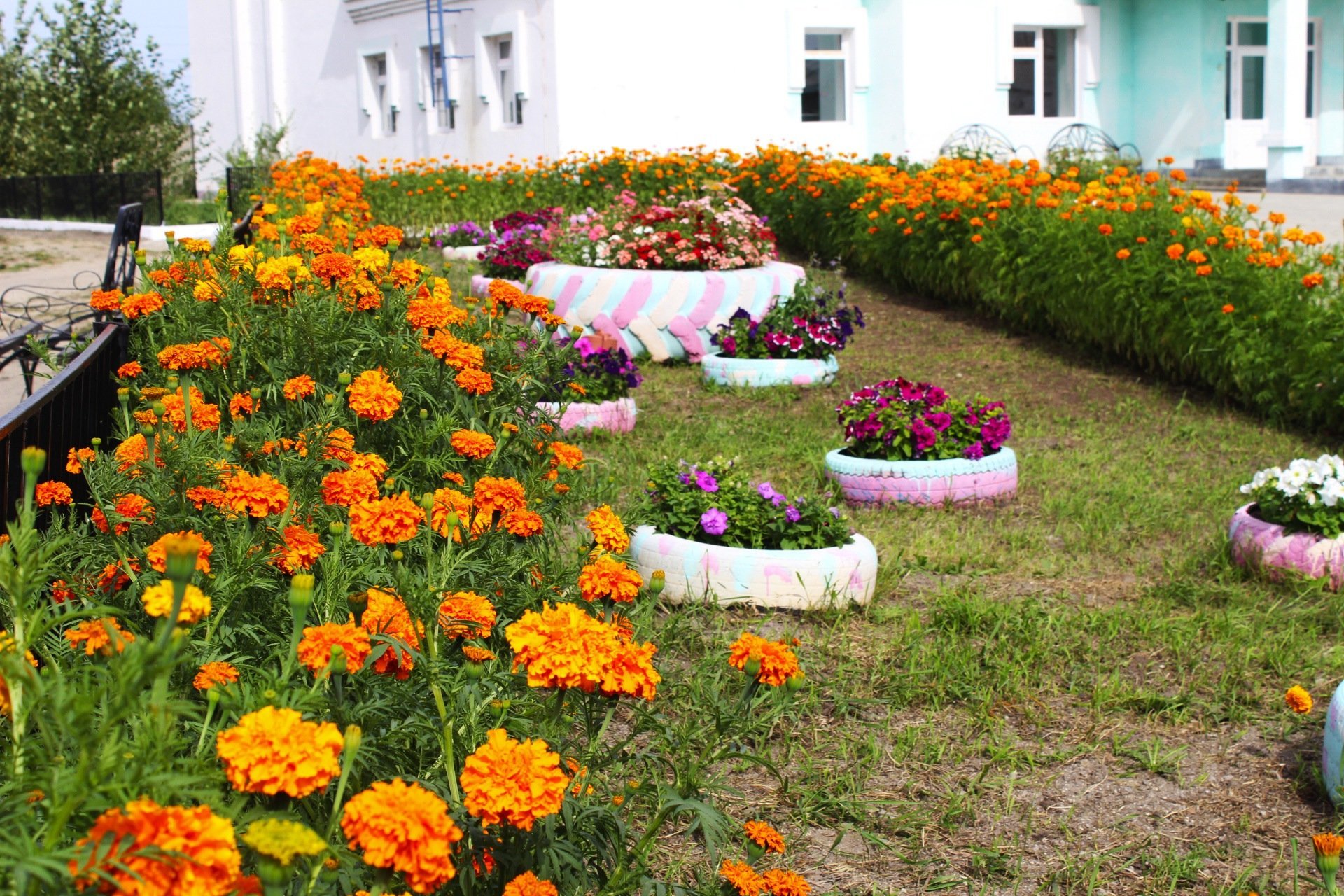 Клумбы бархатцы и петуньи