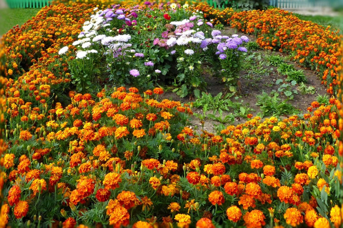 Клумба астры цинии и бархатцы