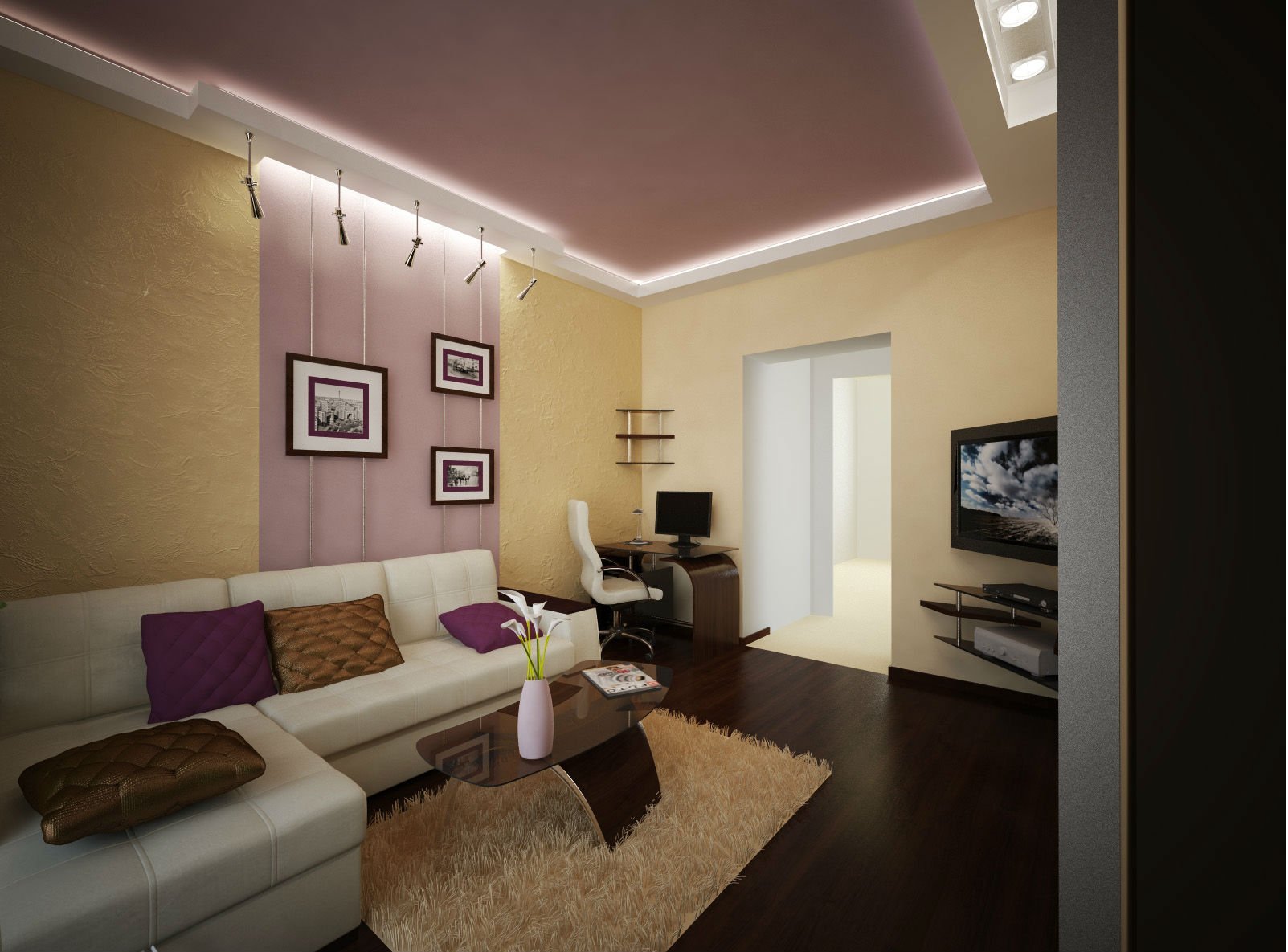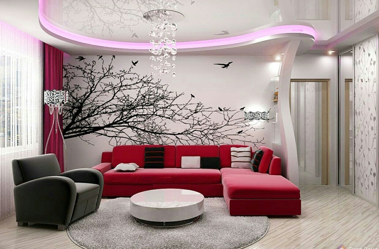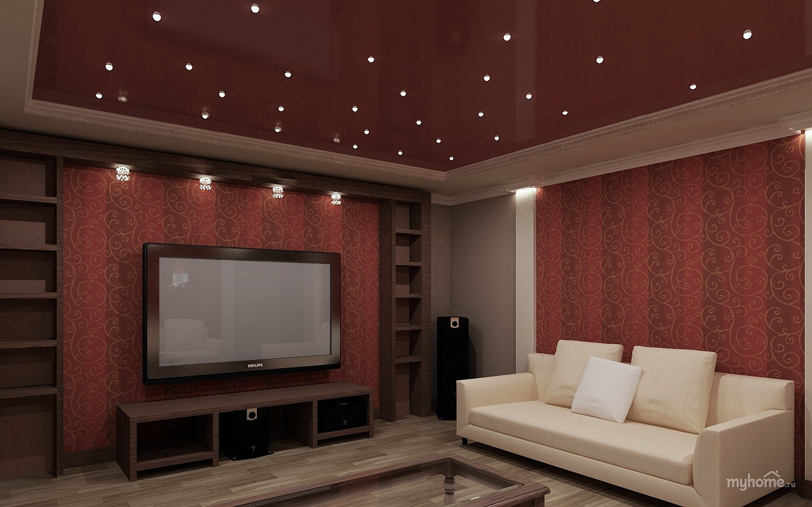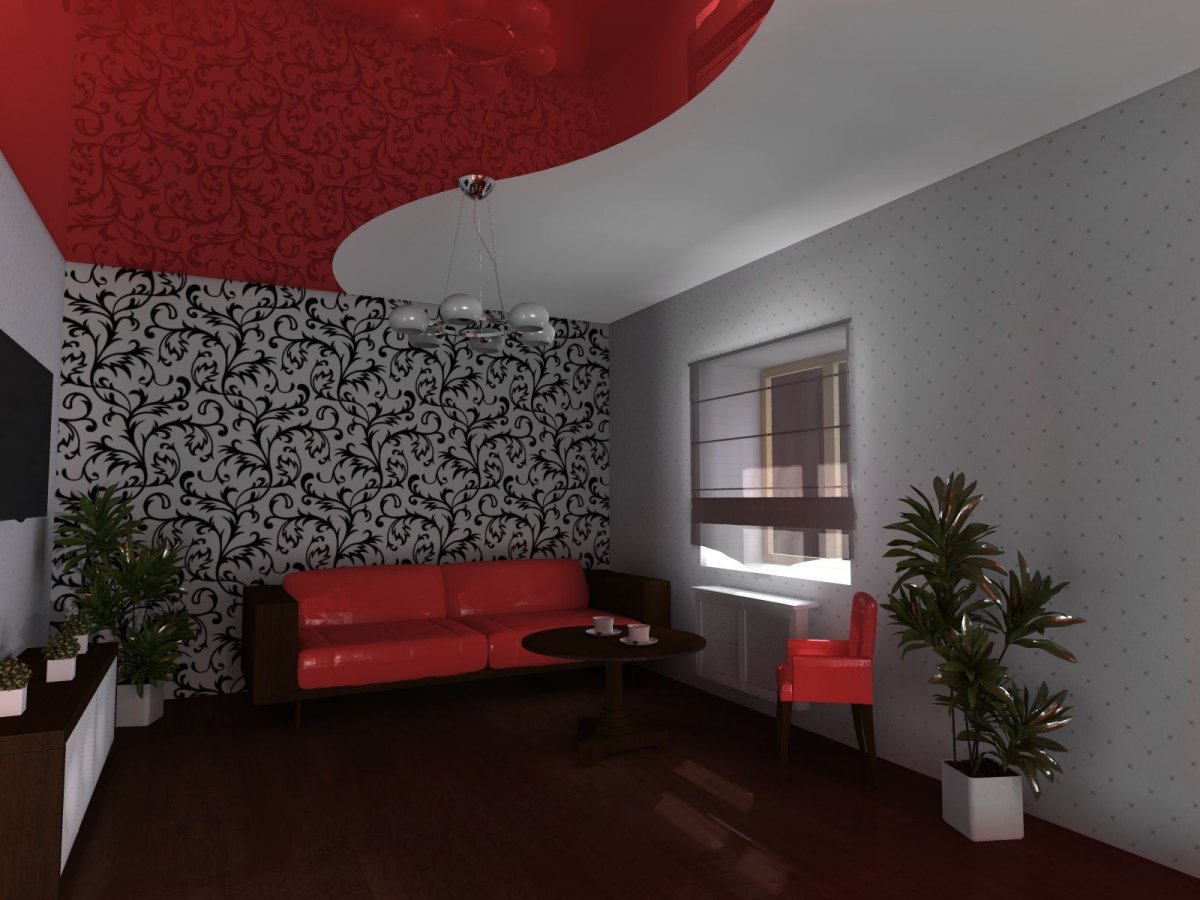 Интерьер с бордовым потолком в гостиной