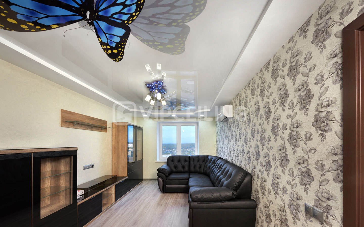Глянцевый потолок натяжной в гостиной