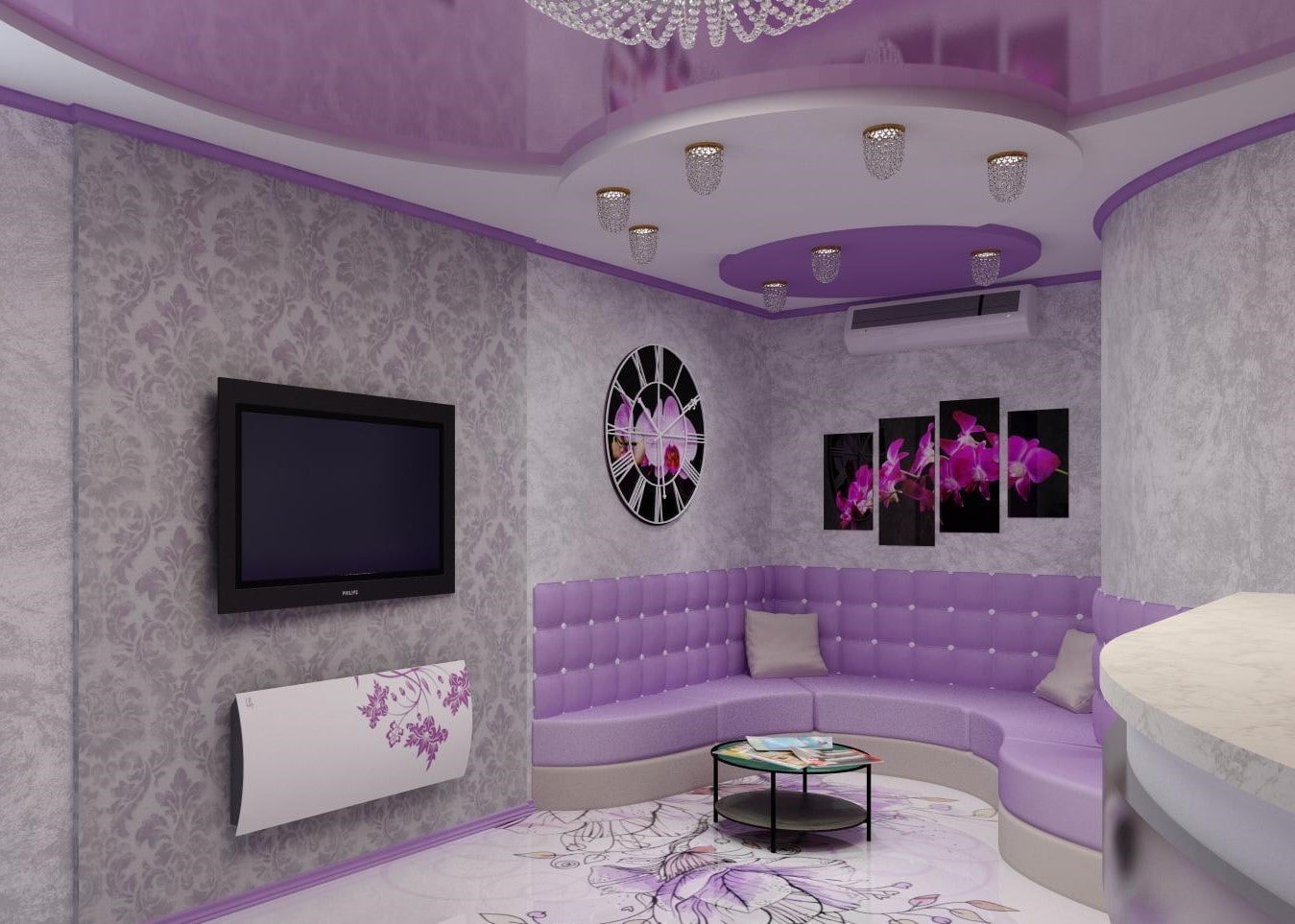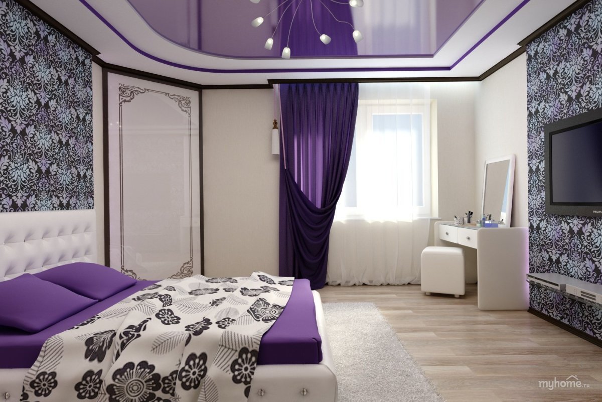 Фиолетовый потолок в интерьере