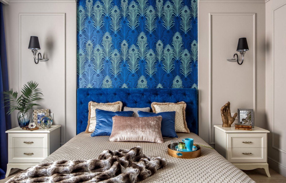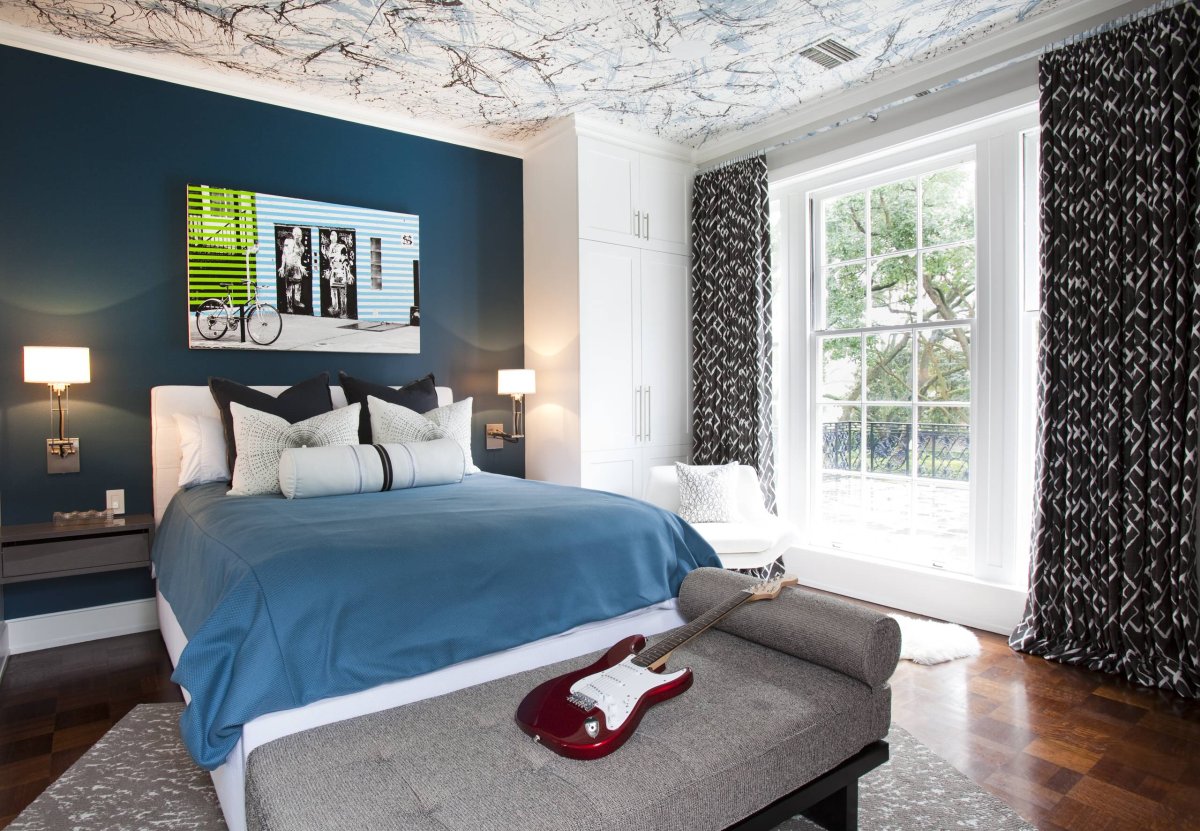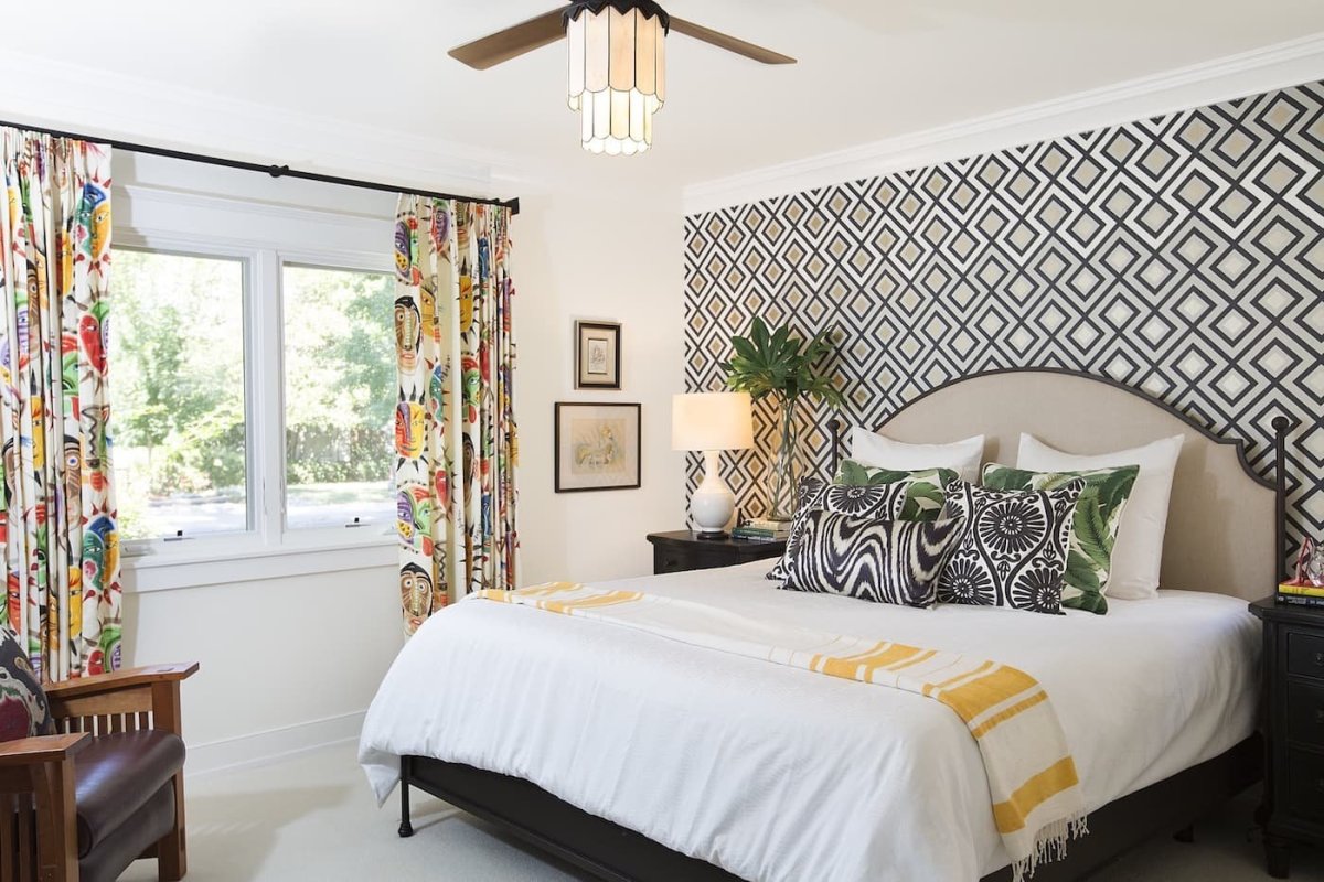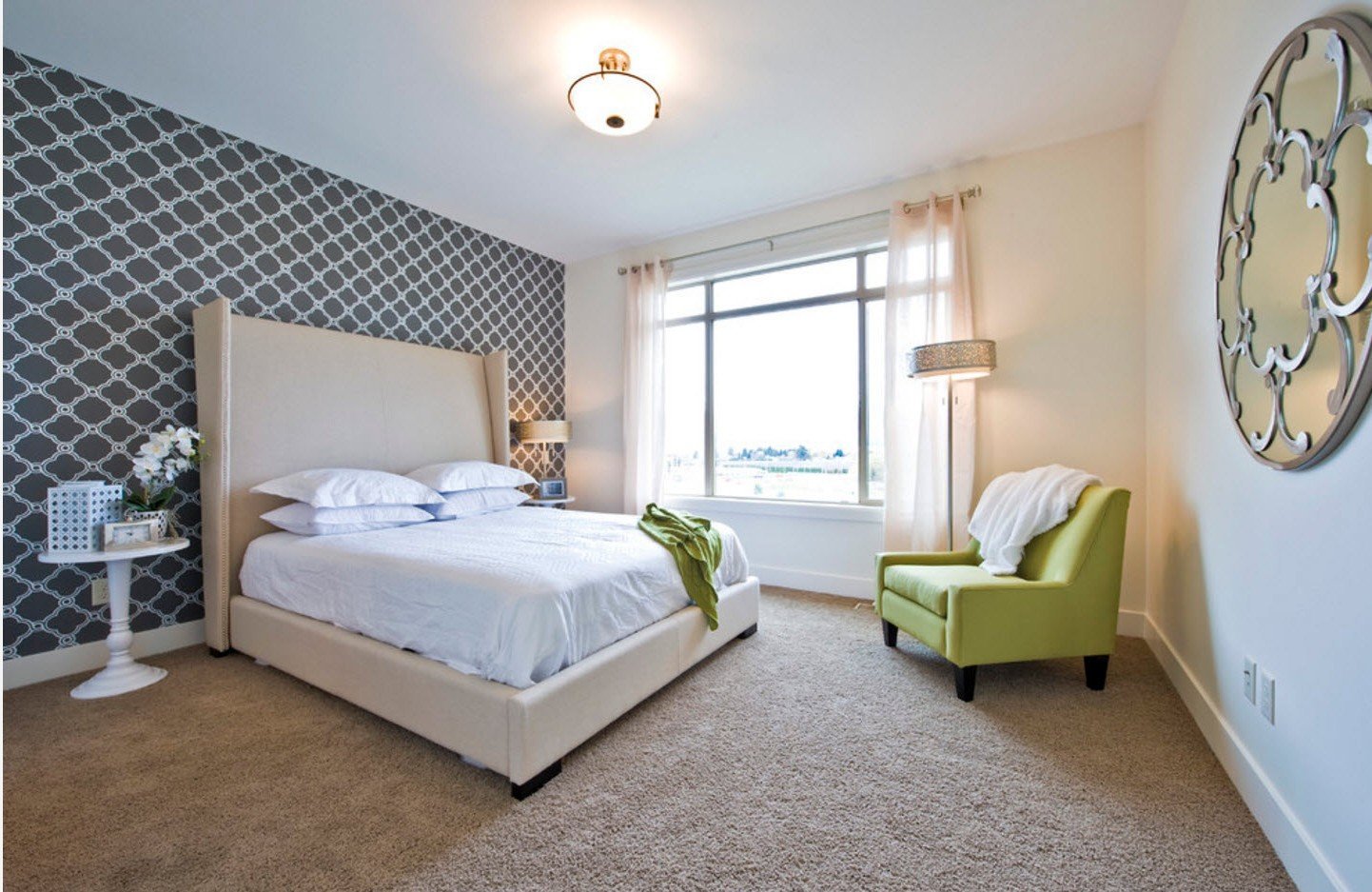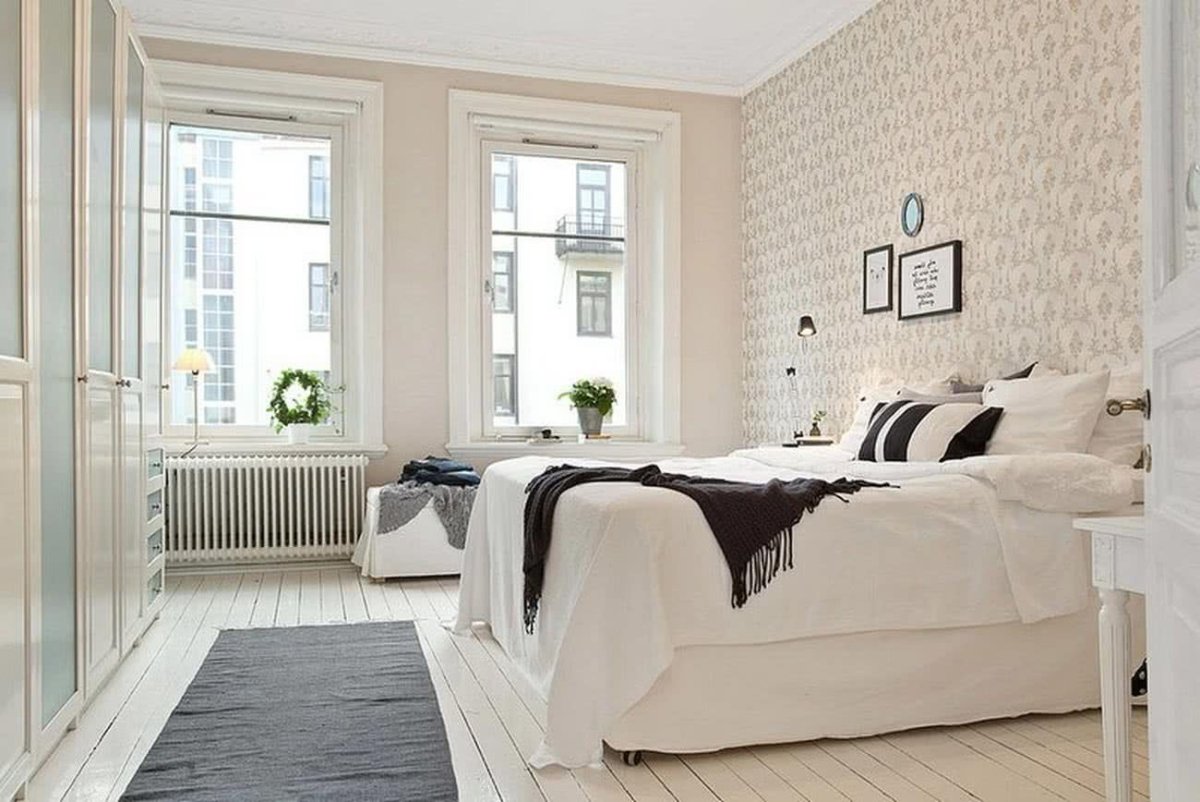 Гостиная с 2 окнами на одной стене с акцентной стеной за диваном