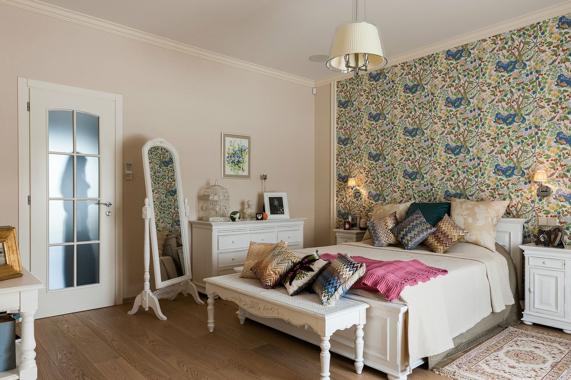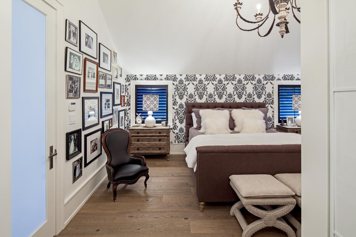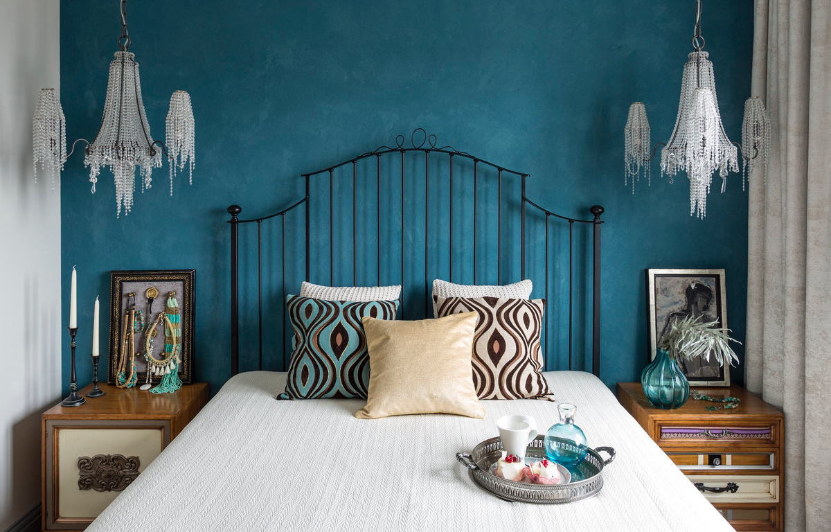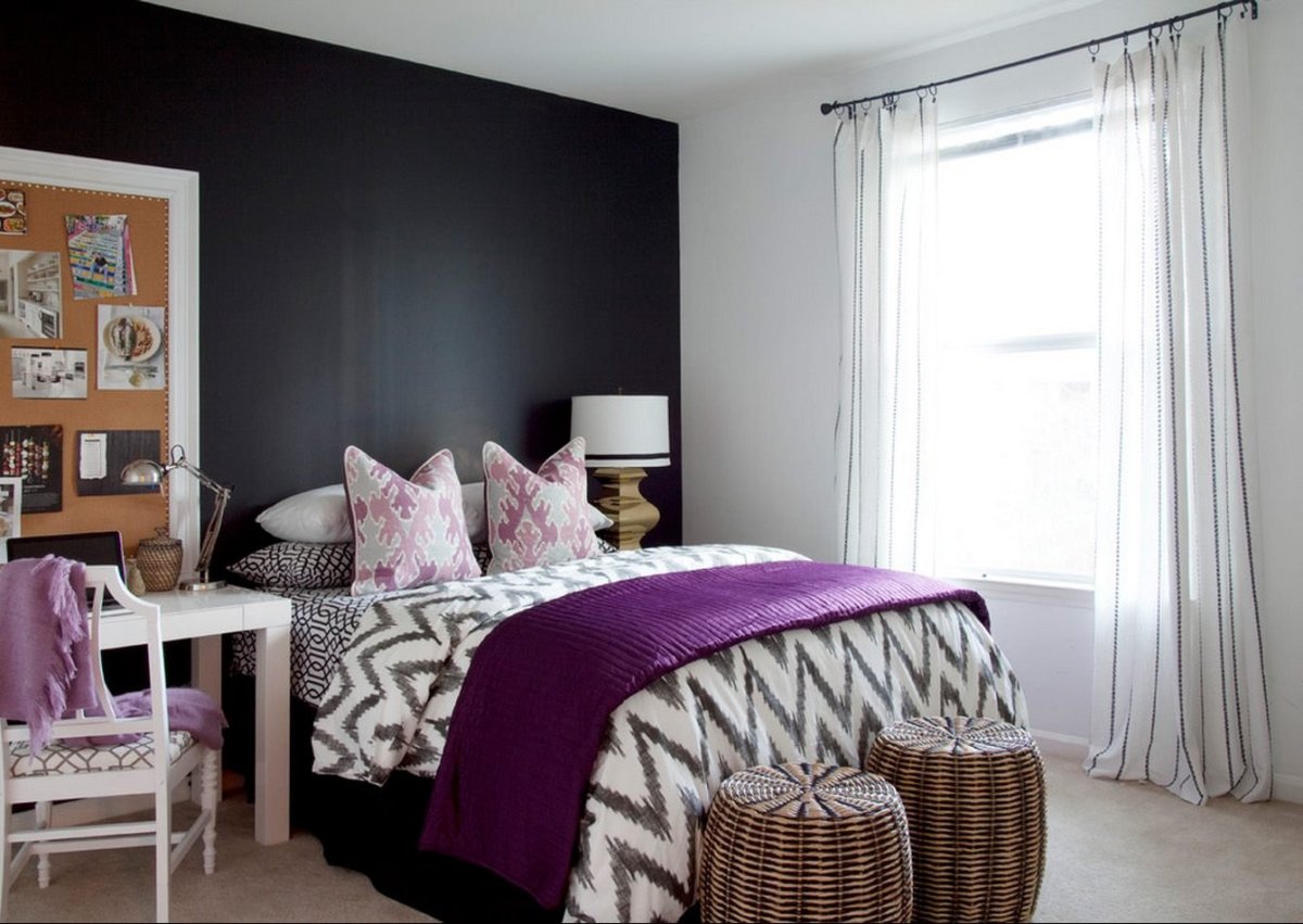 Гостиная с 2 окнами на одной стене с акцентной стеной за диваном