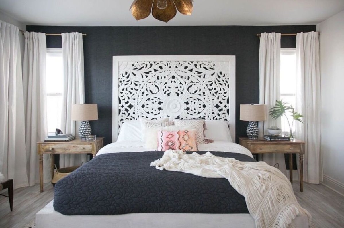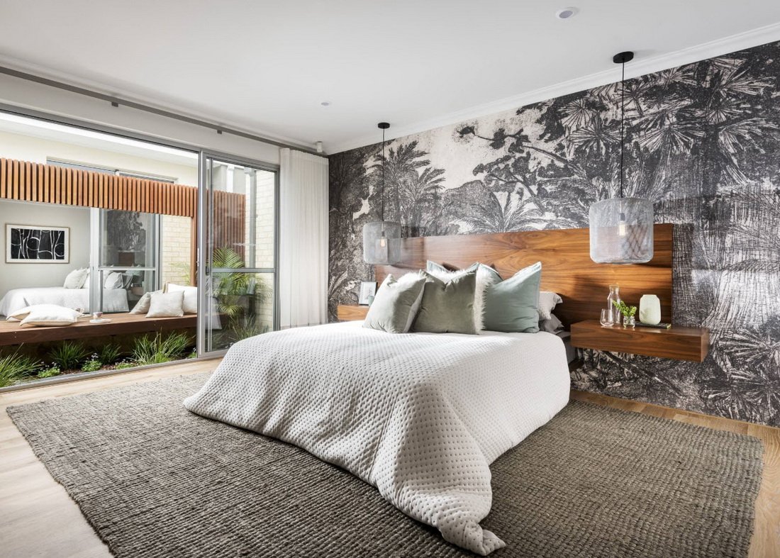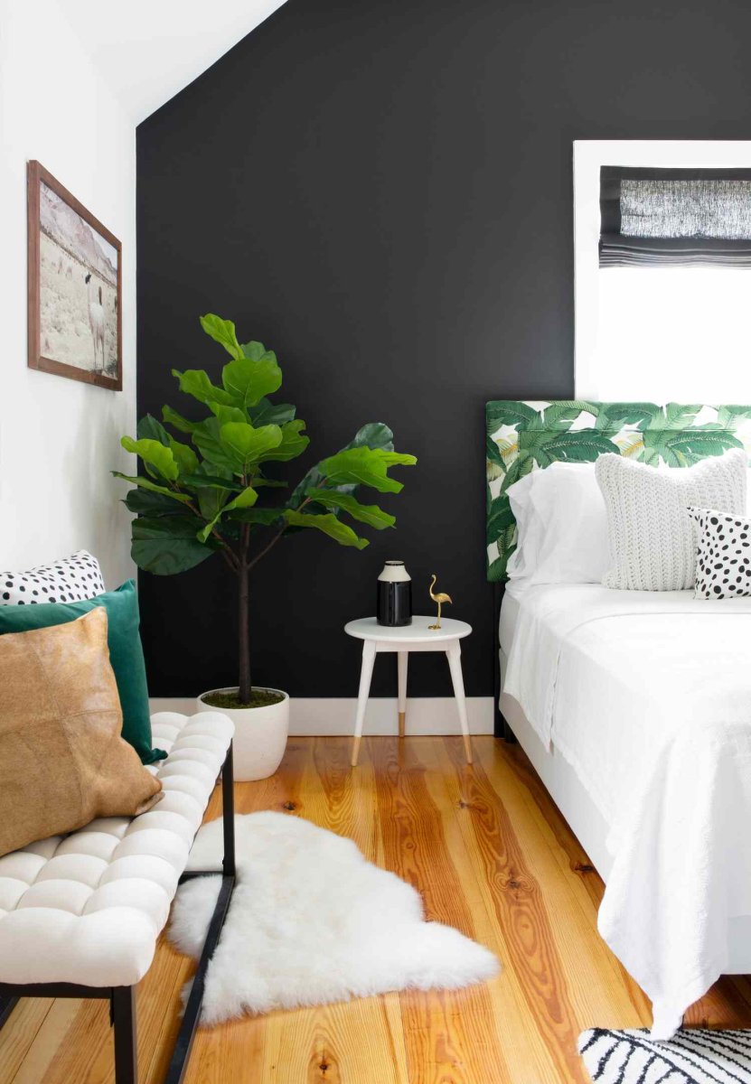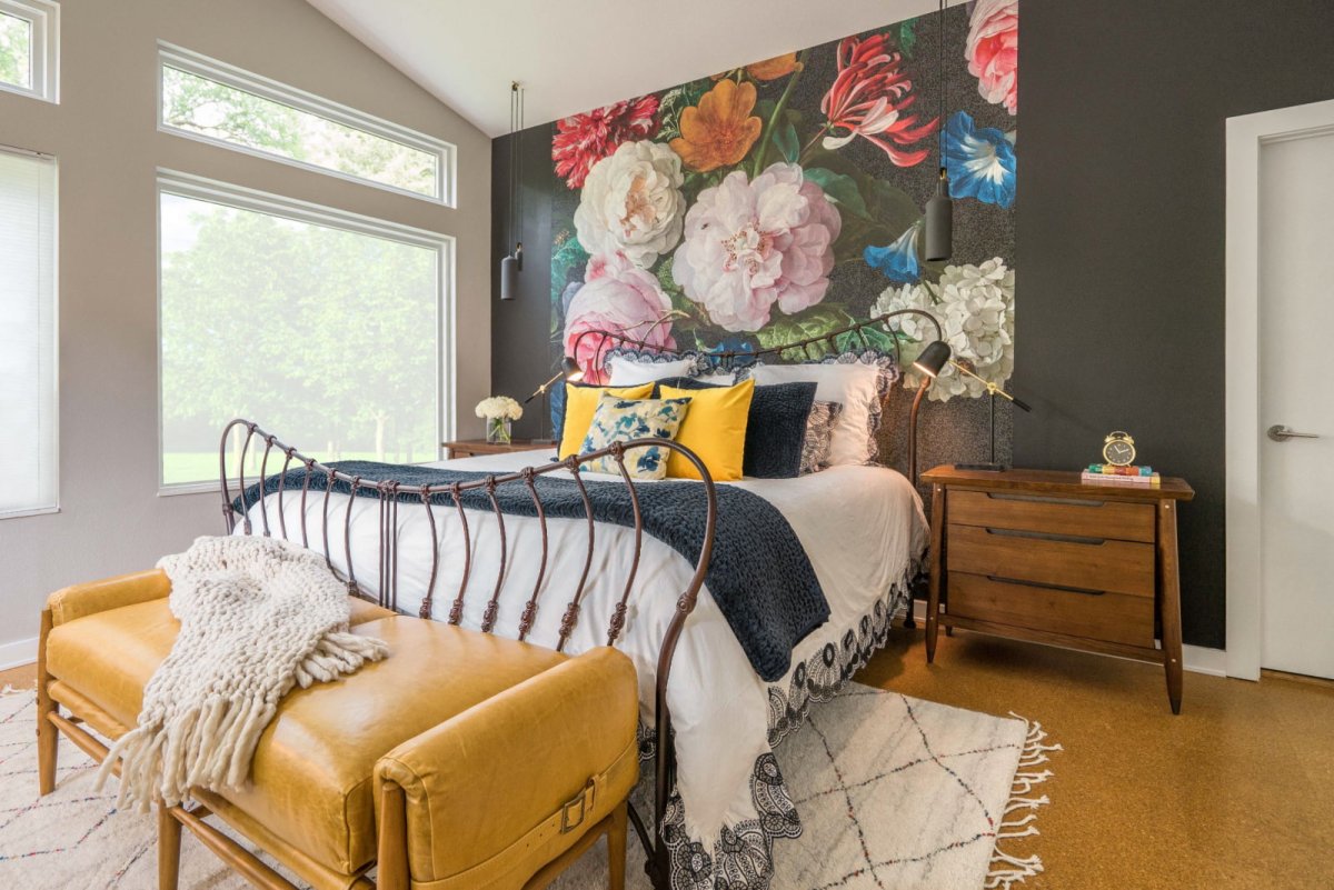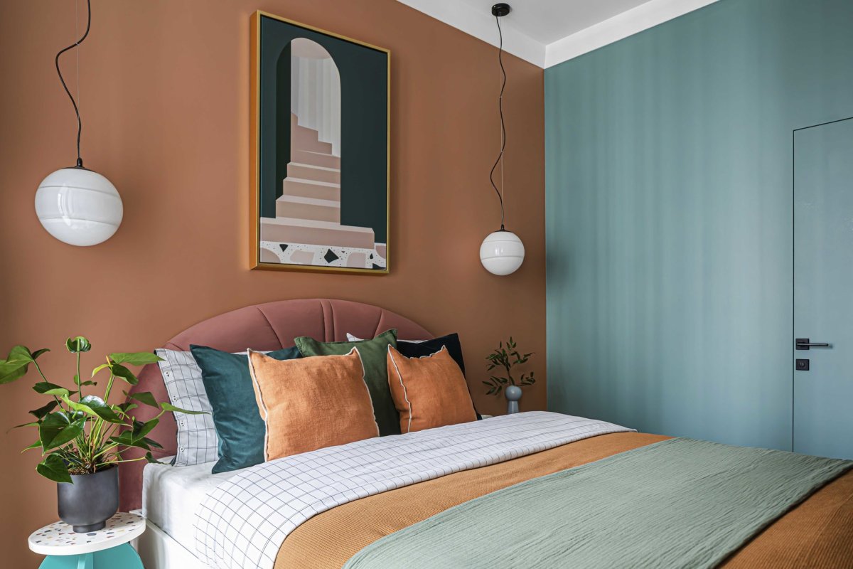 Гостиная с 2 окнами на одной стене с акцентной стеной за диваном