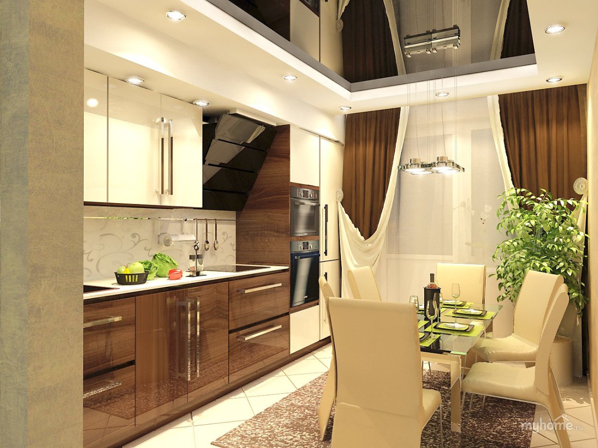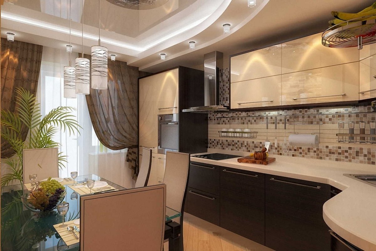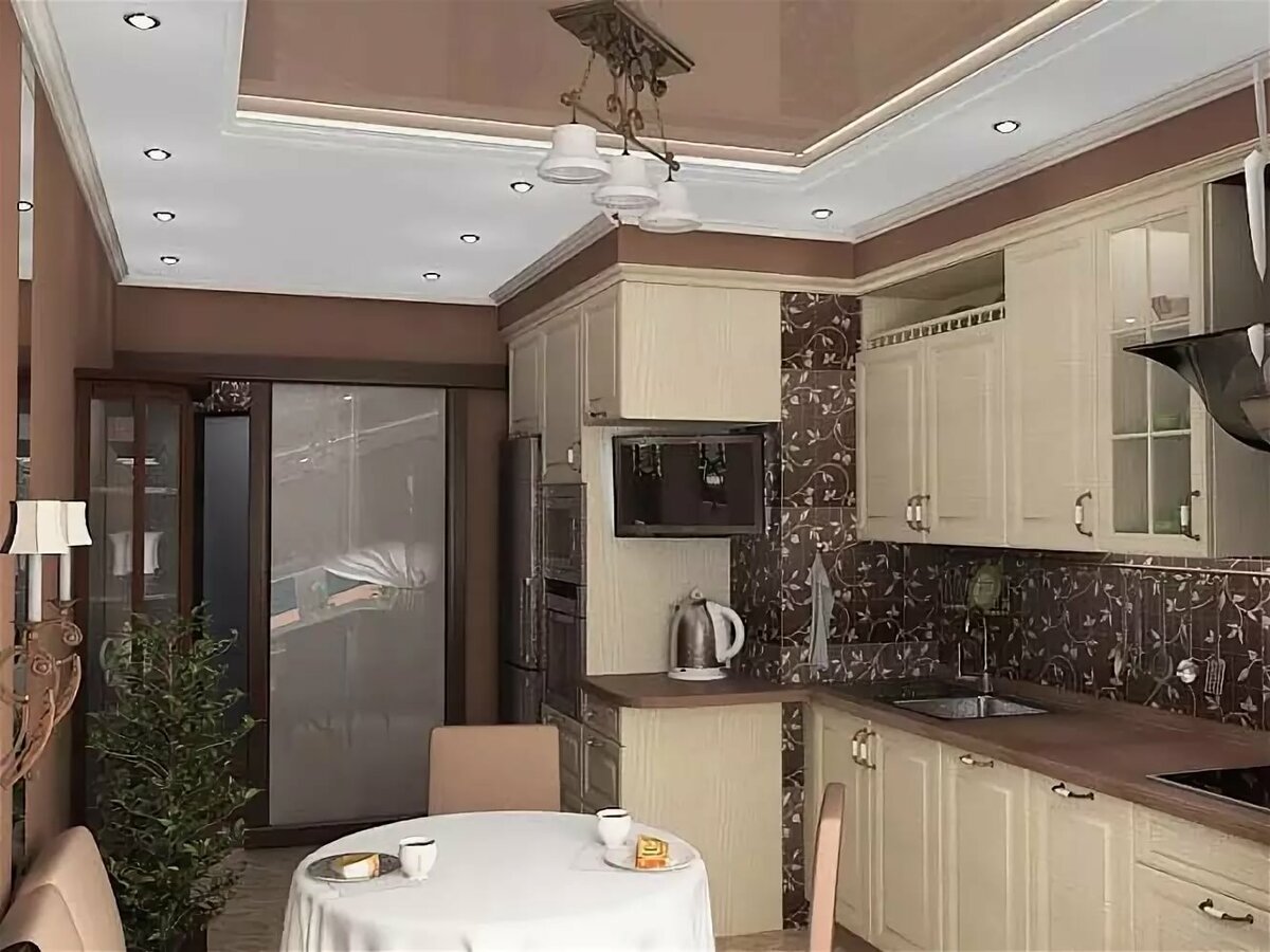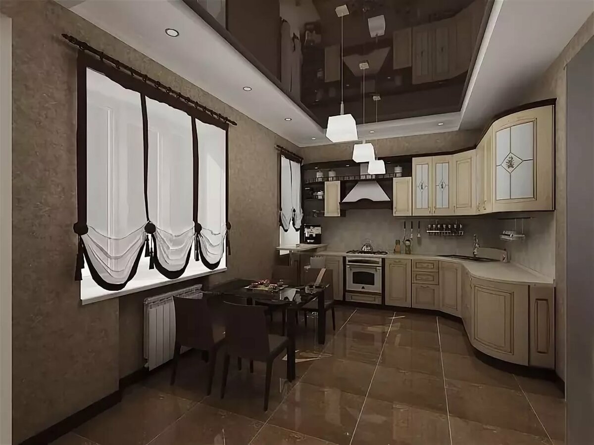 Коричневый потолок в интерьере кухни