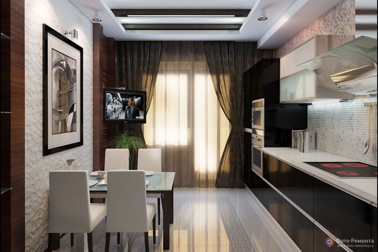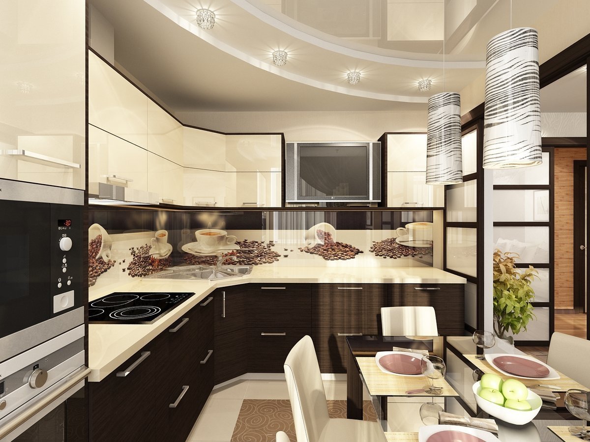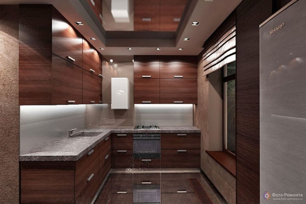Коричневый потолок в интерьере кухни
