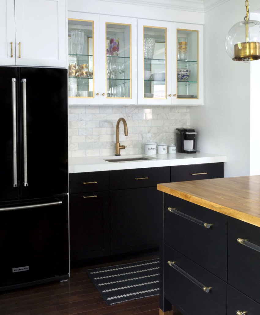 Кухня с черным холодильником