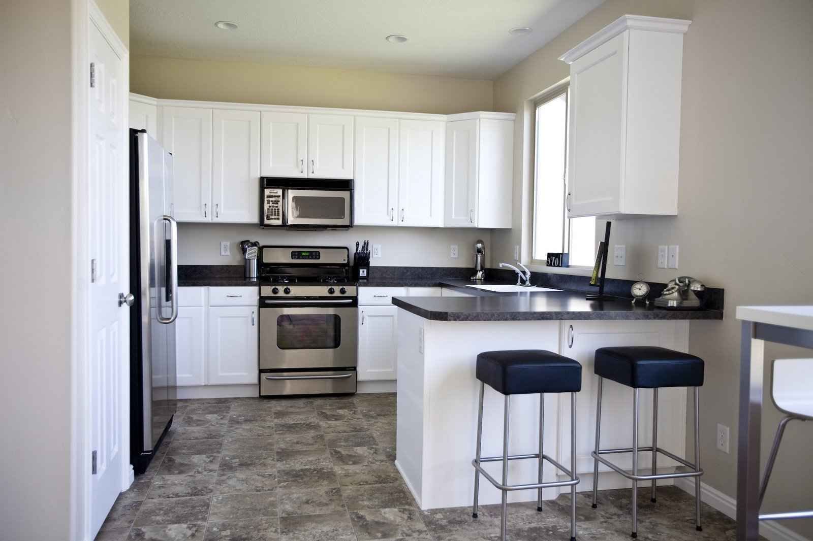 Белая кухня с черной столешницей