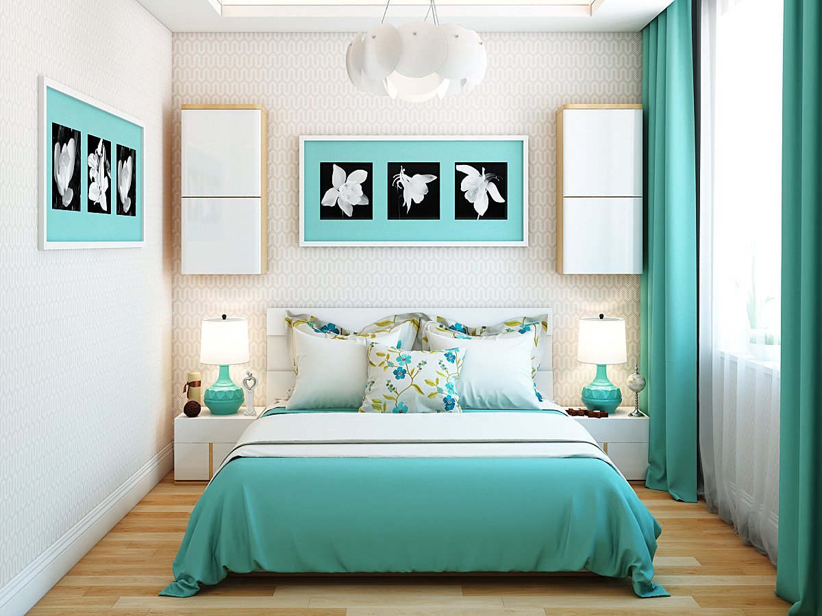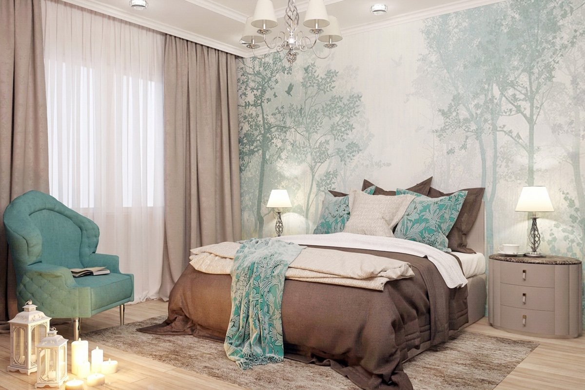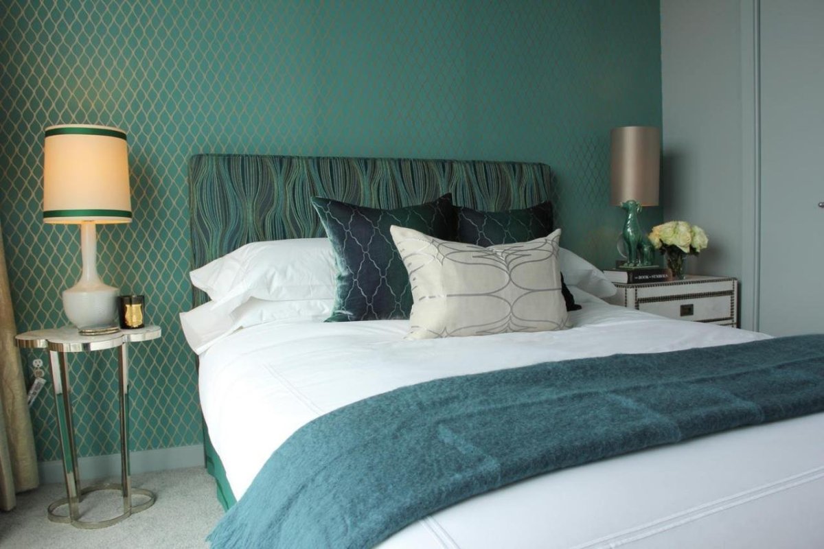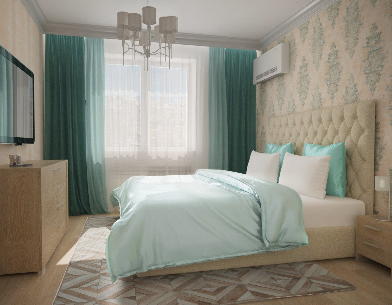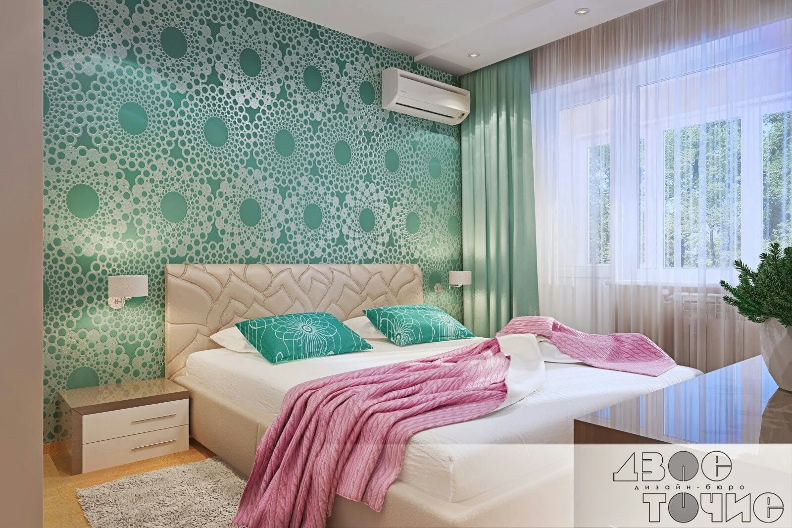 Спальня в современном стиле в светлых тонах с зеленым покрывалом