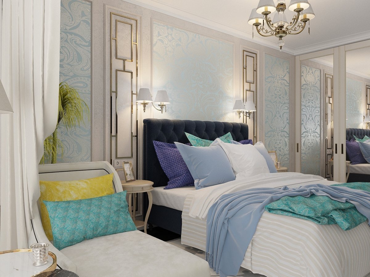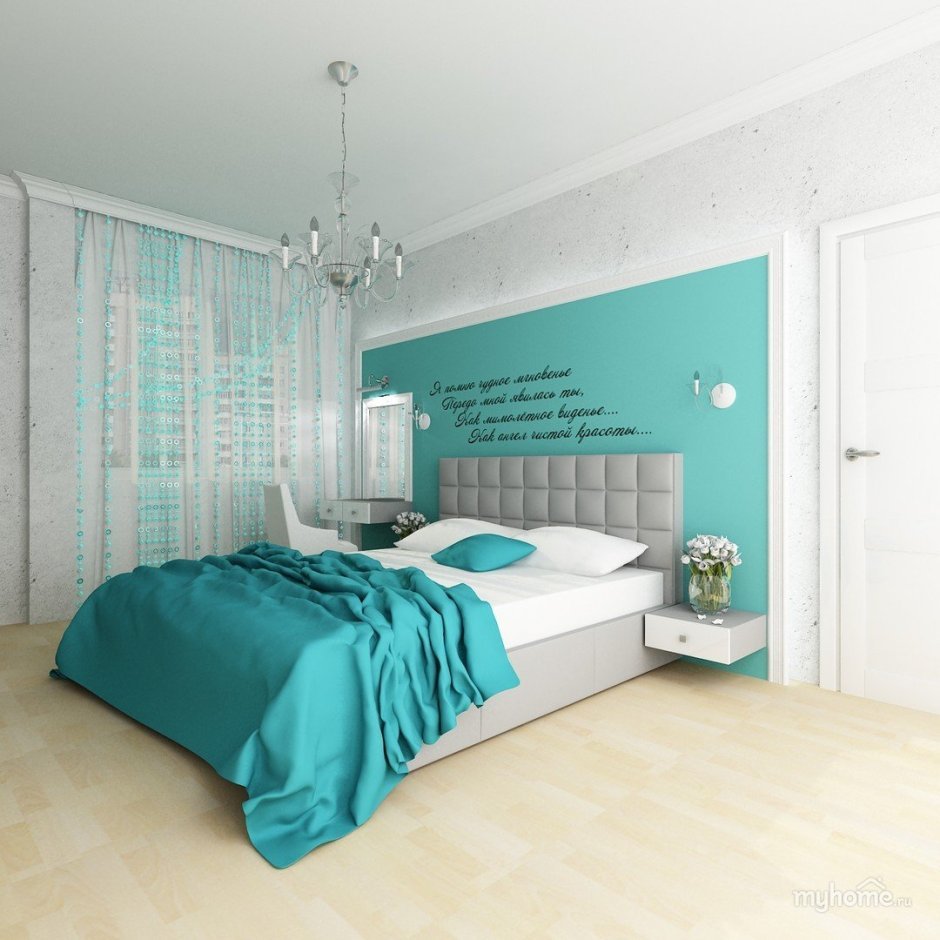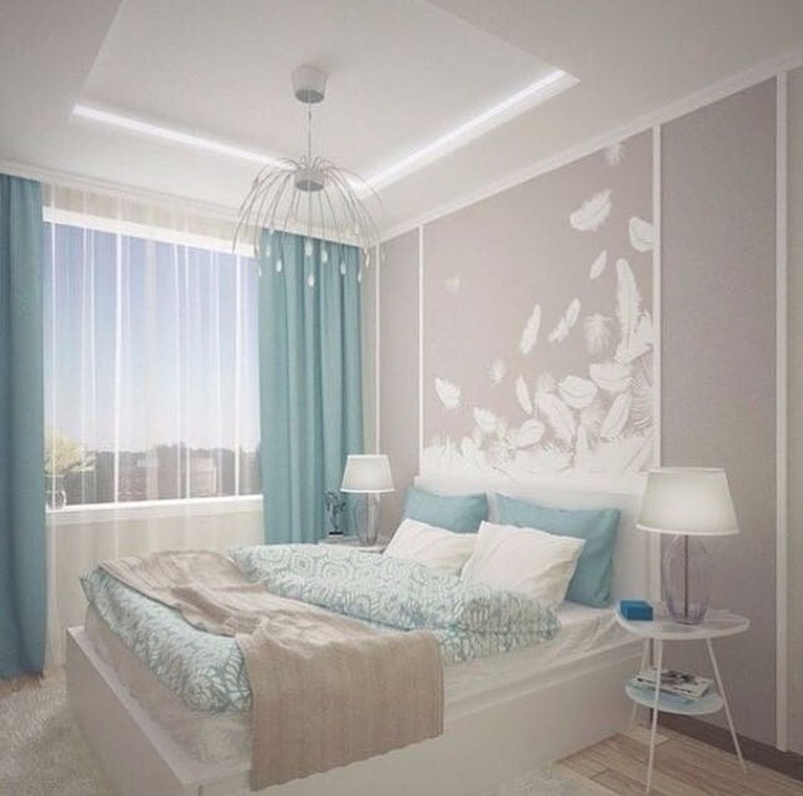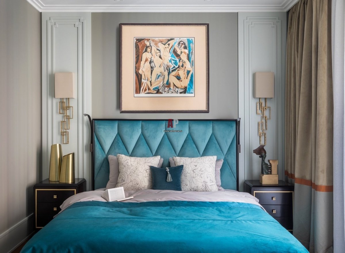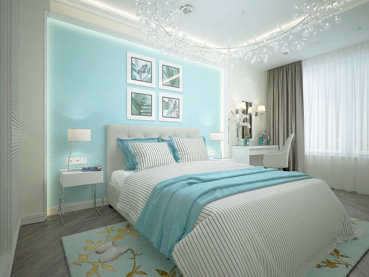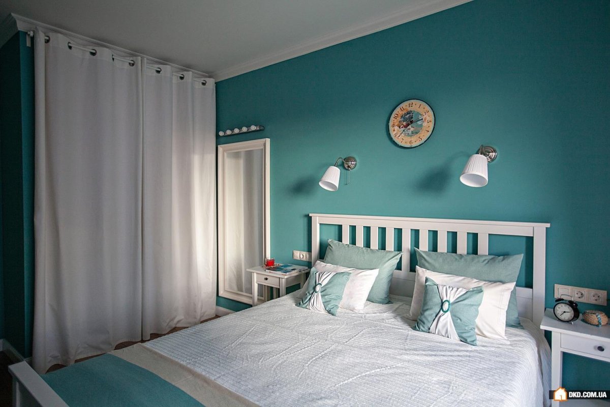 Спальня в современном стиле в светлых тонах с зеленым покрывалом