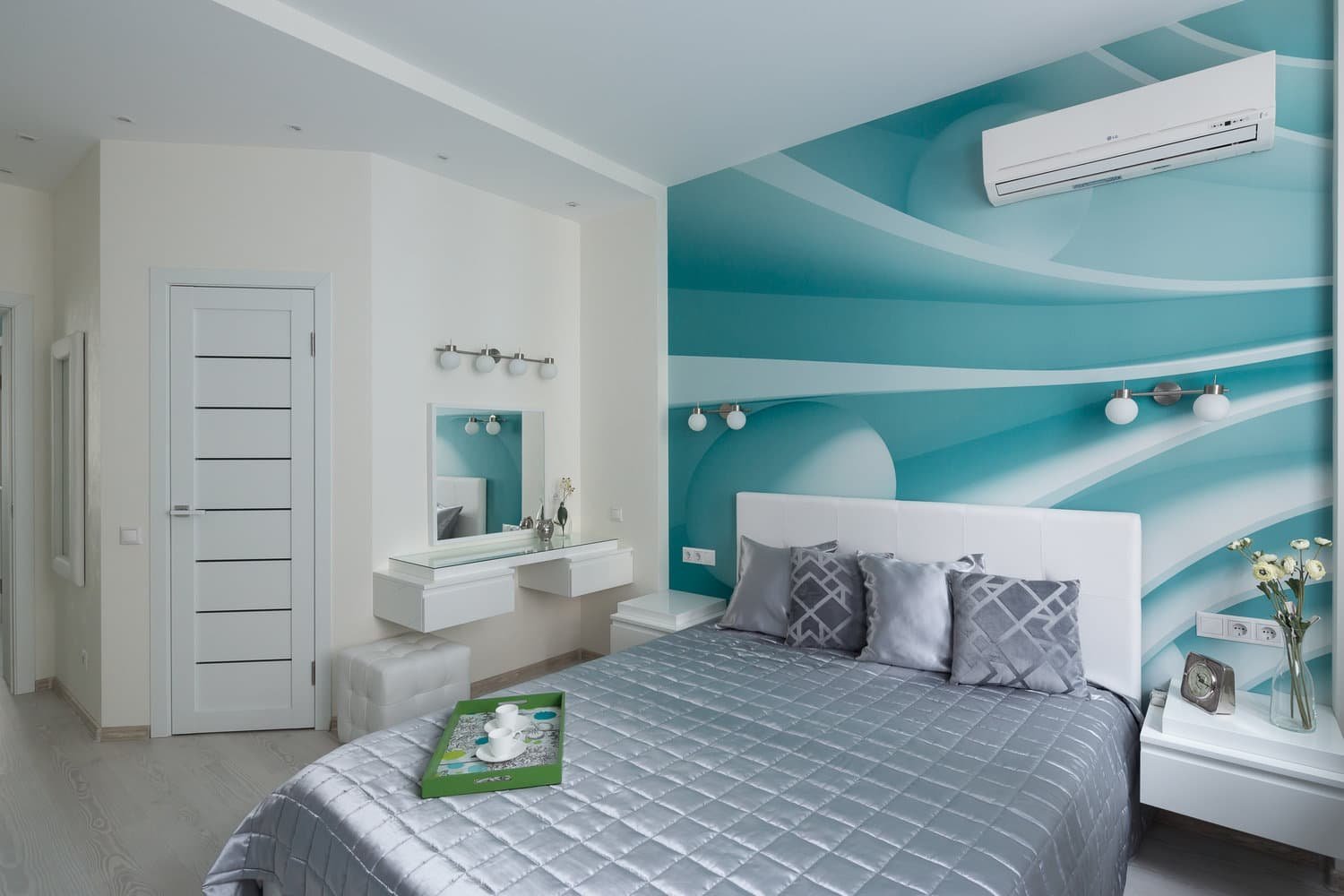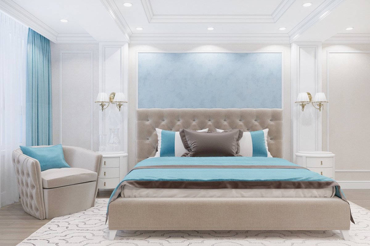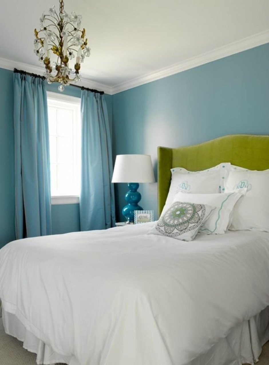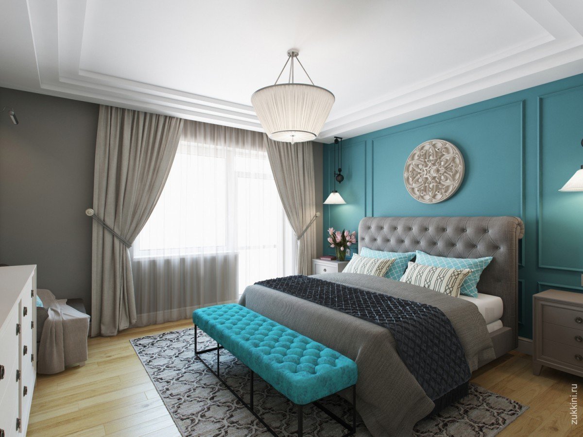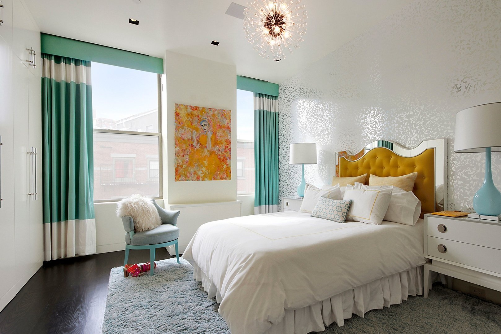 Спальня в современном стиле в светлых тонах с зеленым покрывалом