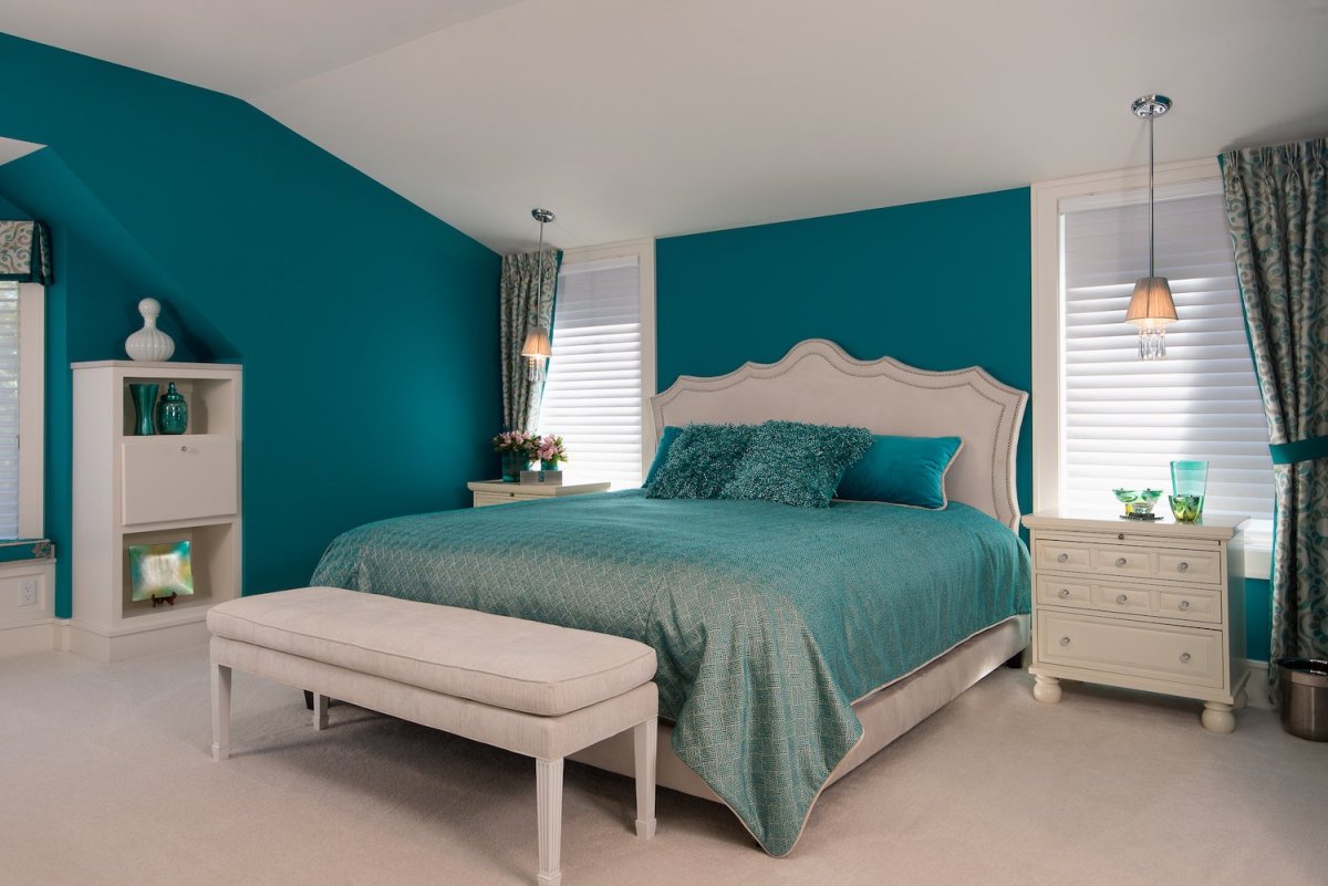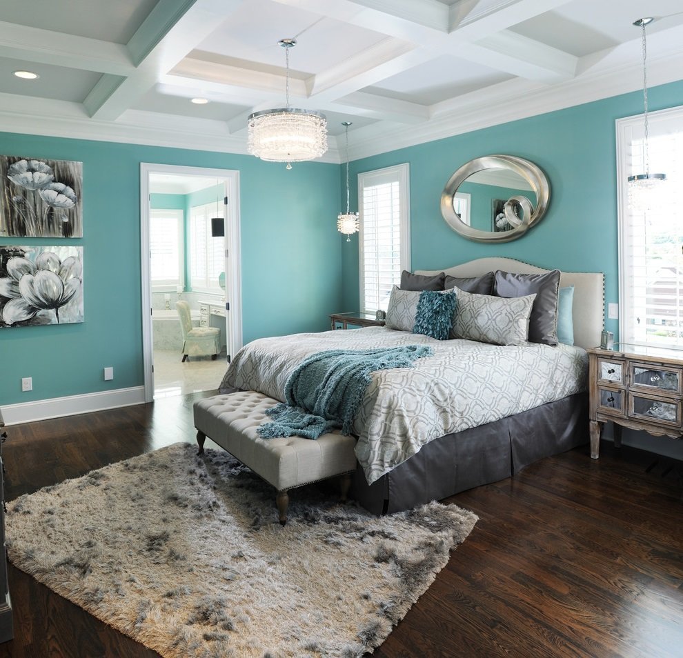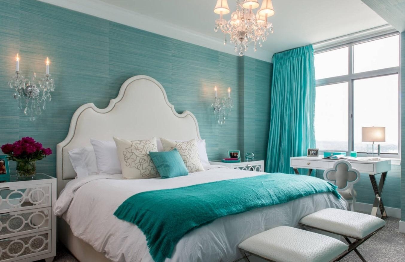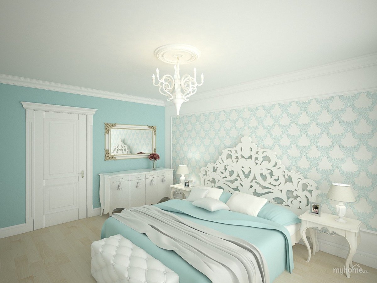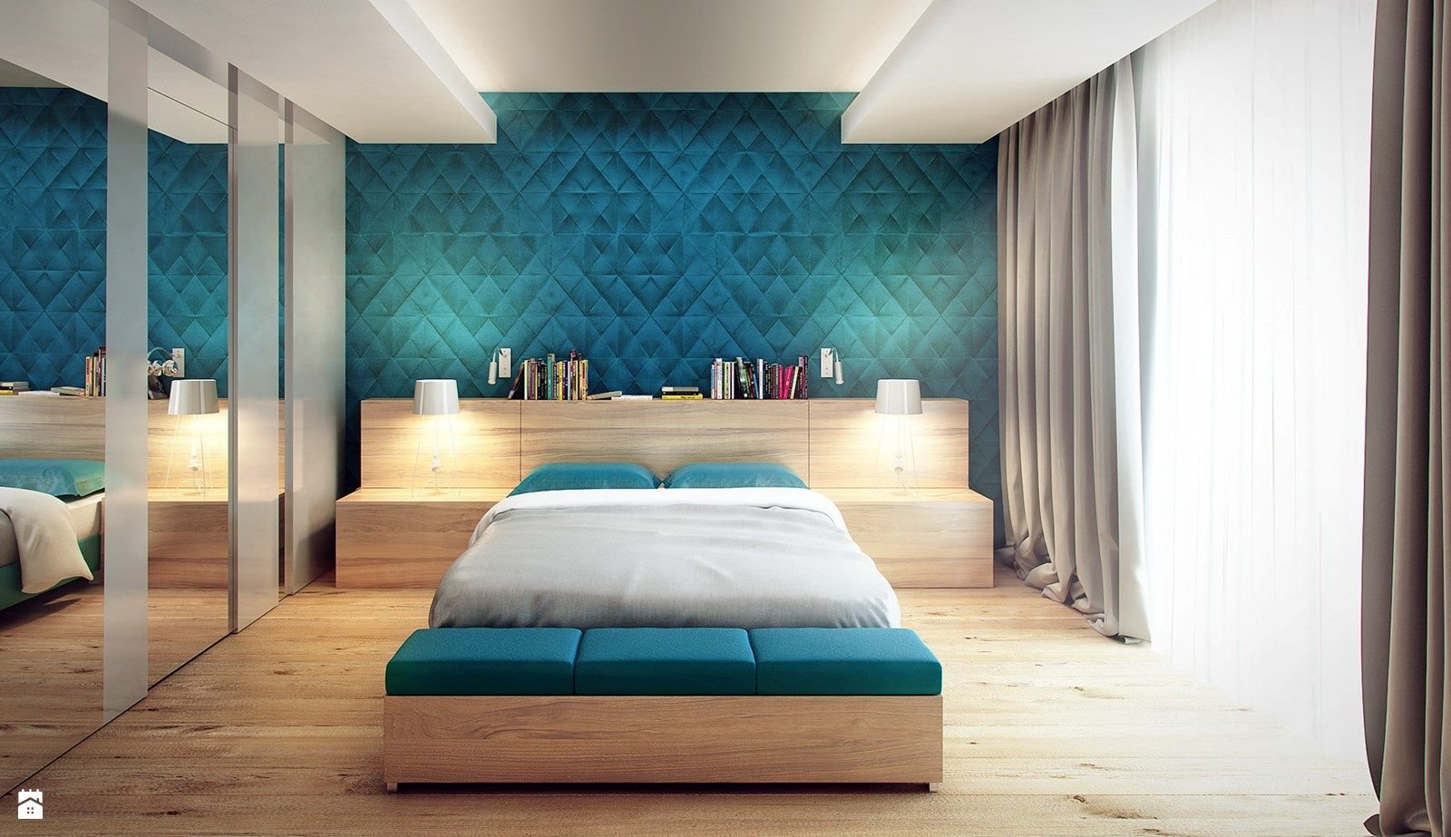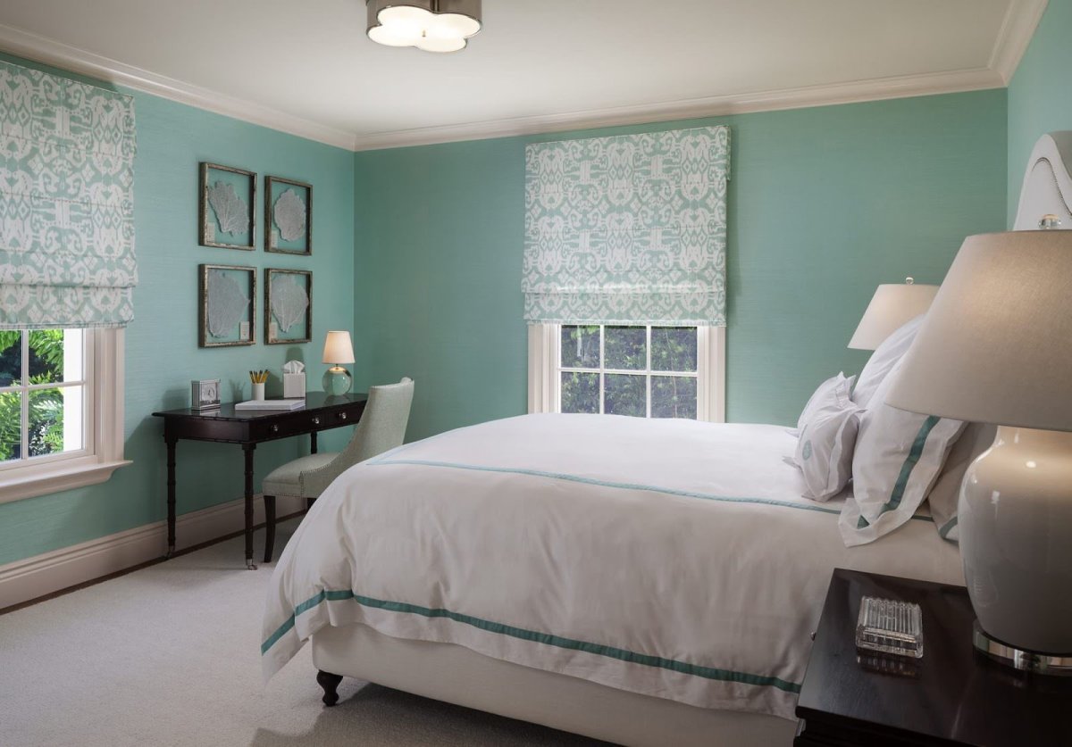 Спальня в современном стиле в светлых тонах с зеленым покрывалом
