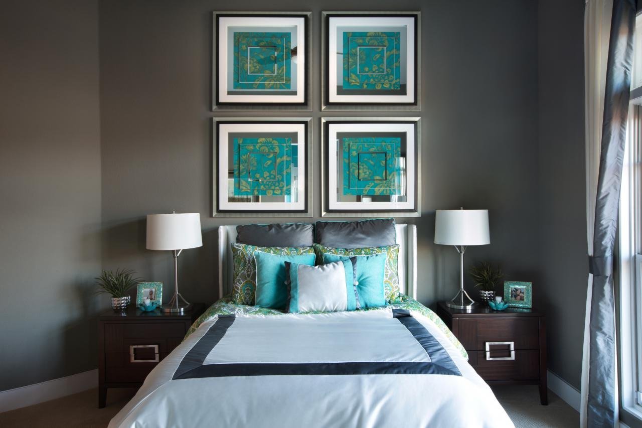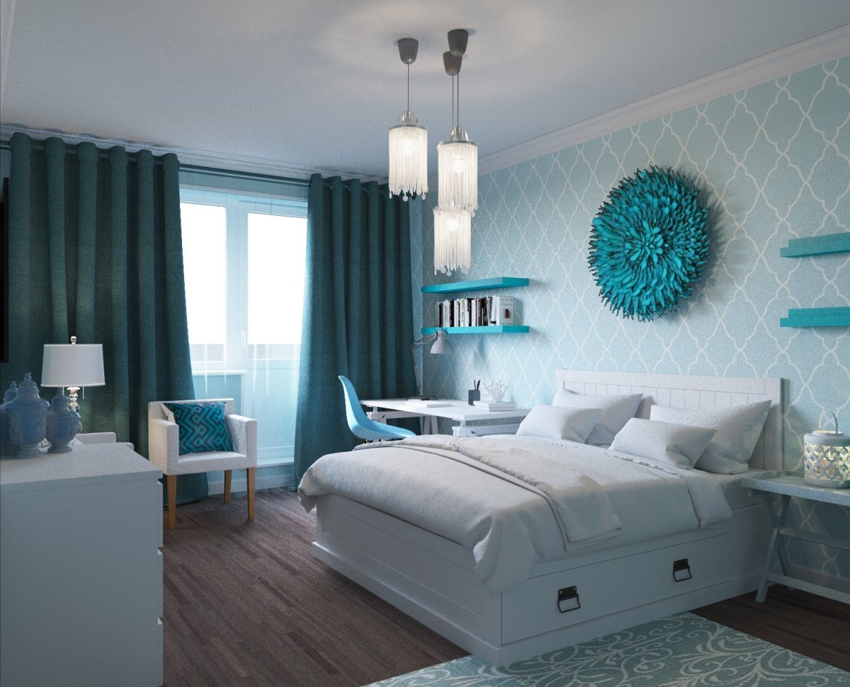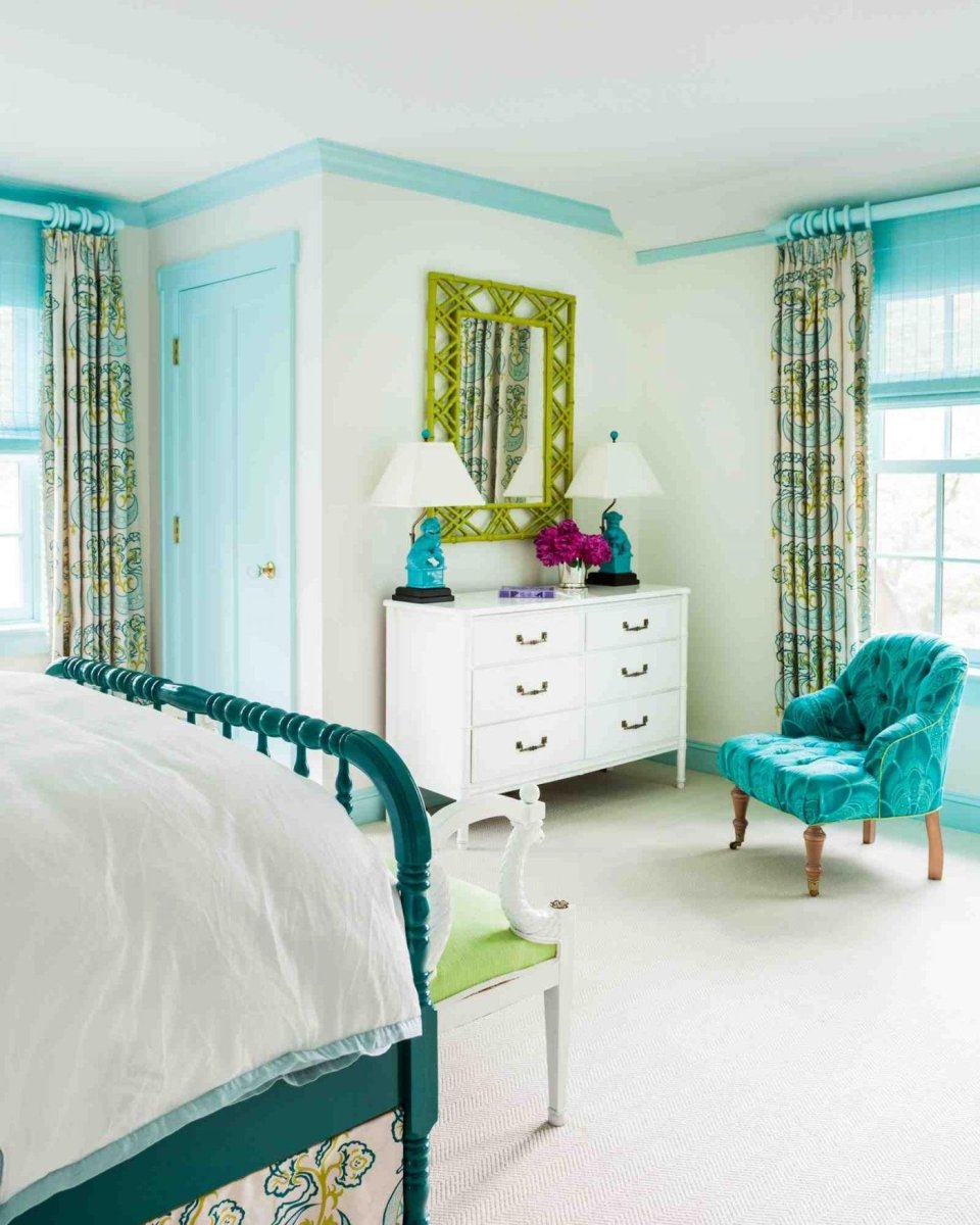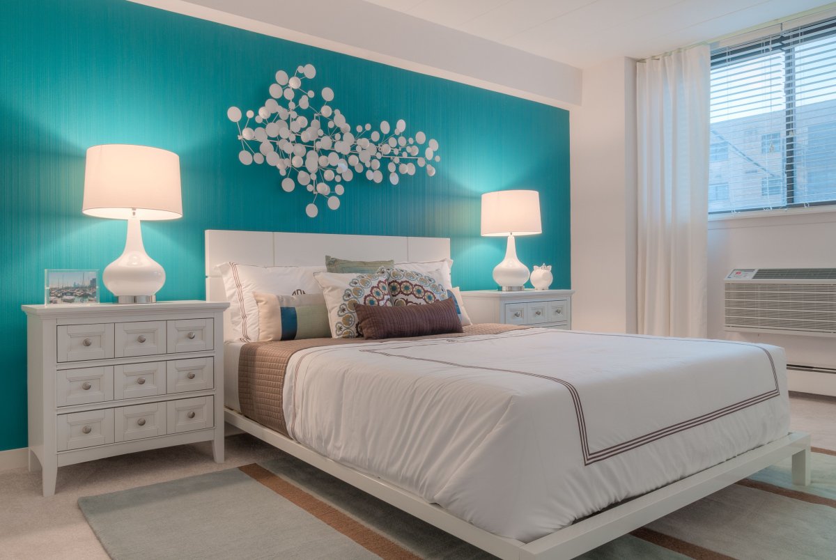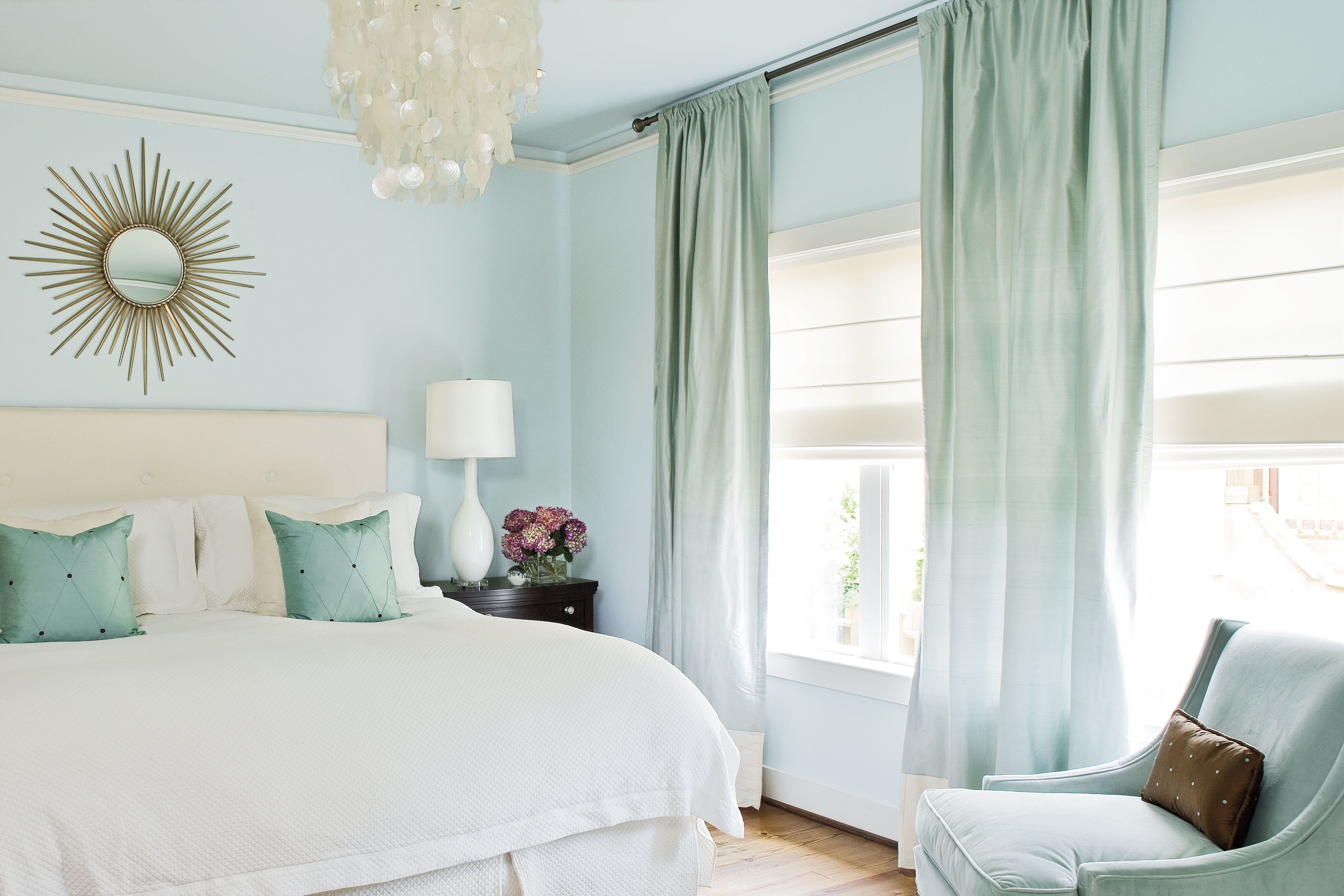 Спальня в современном стиле в светлых тонах с зеленым покрывалом