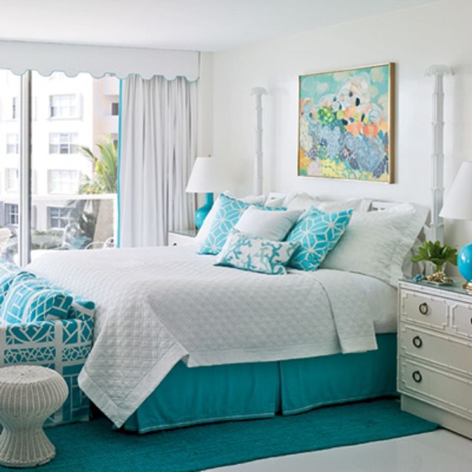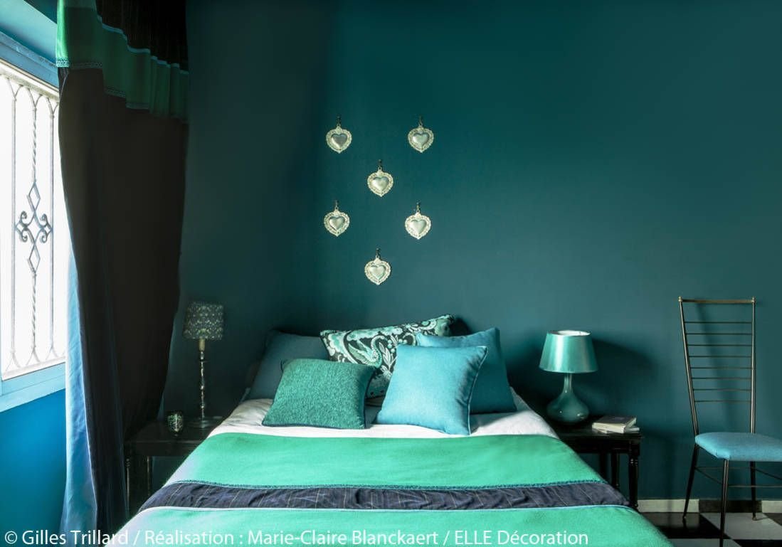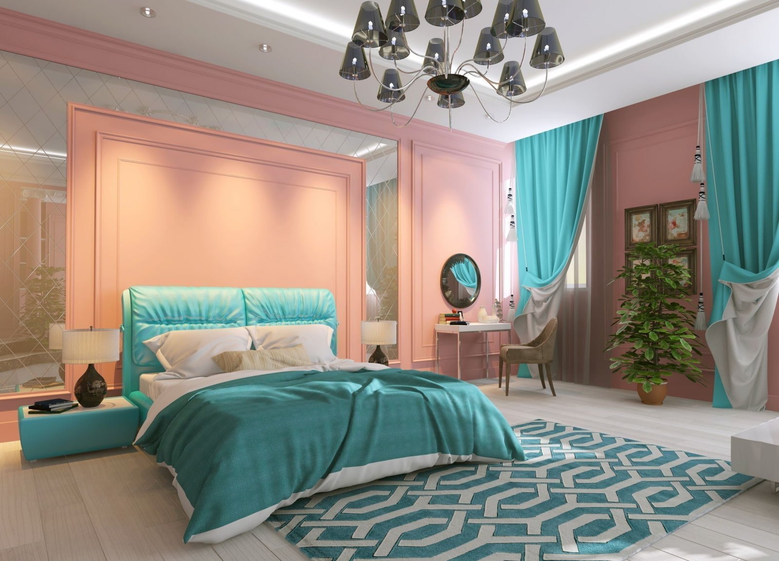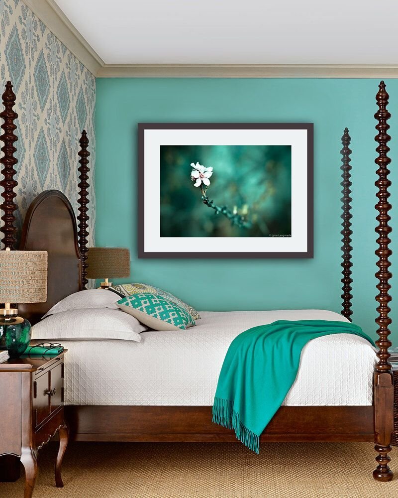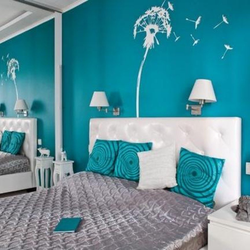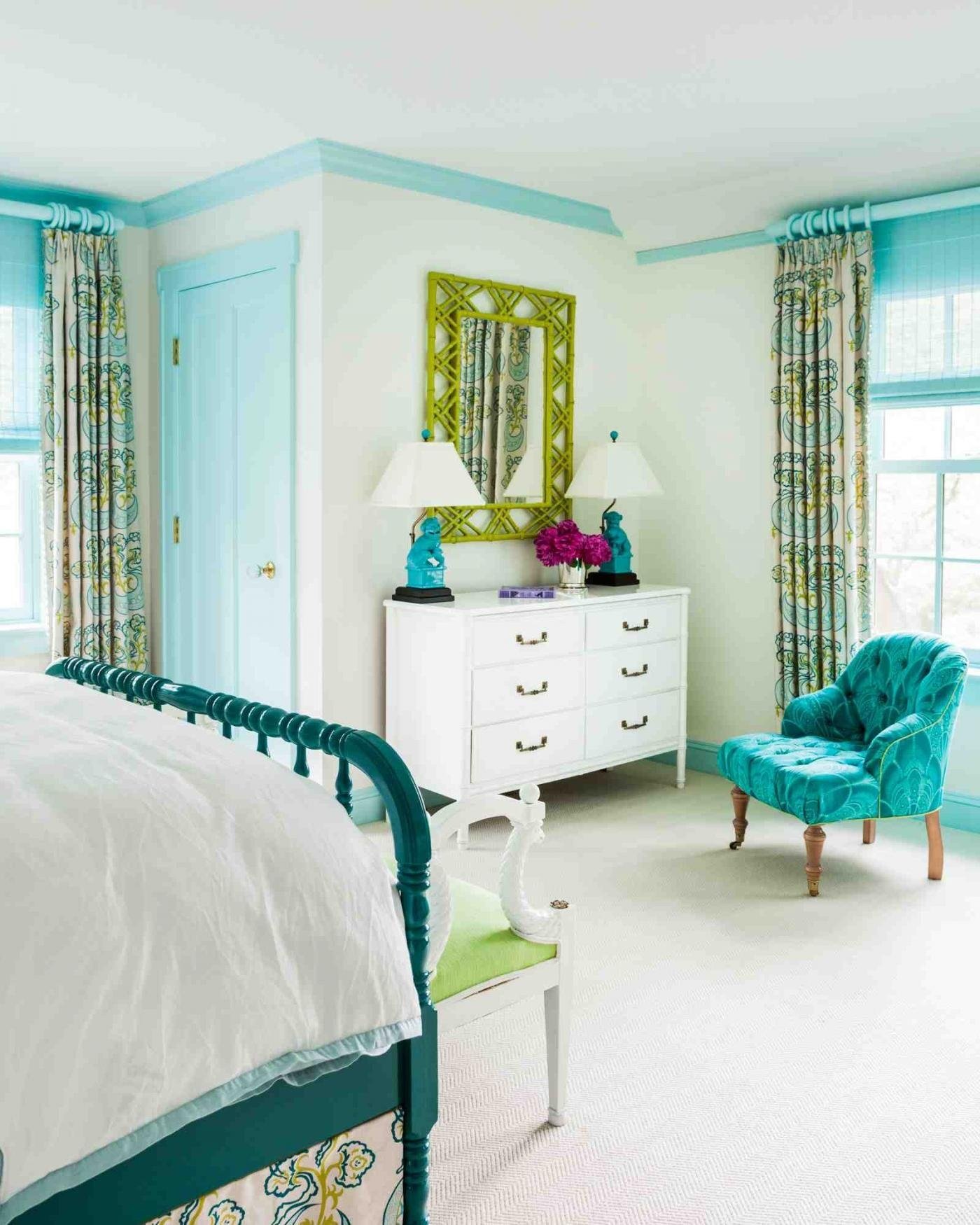 Спальня в современном стиле в светлых тонах с зеленым покрывалом