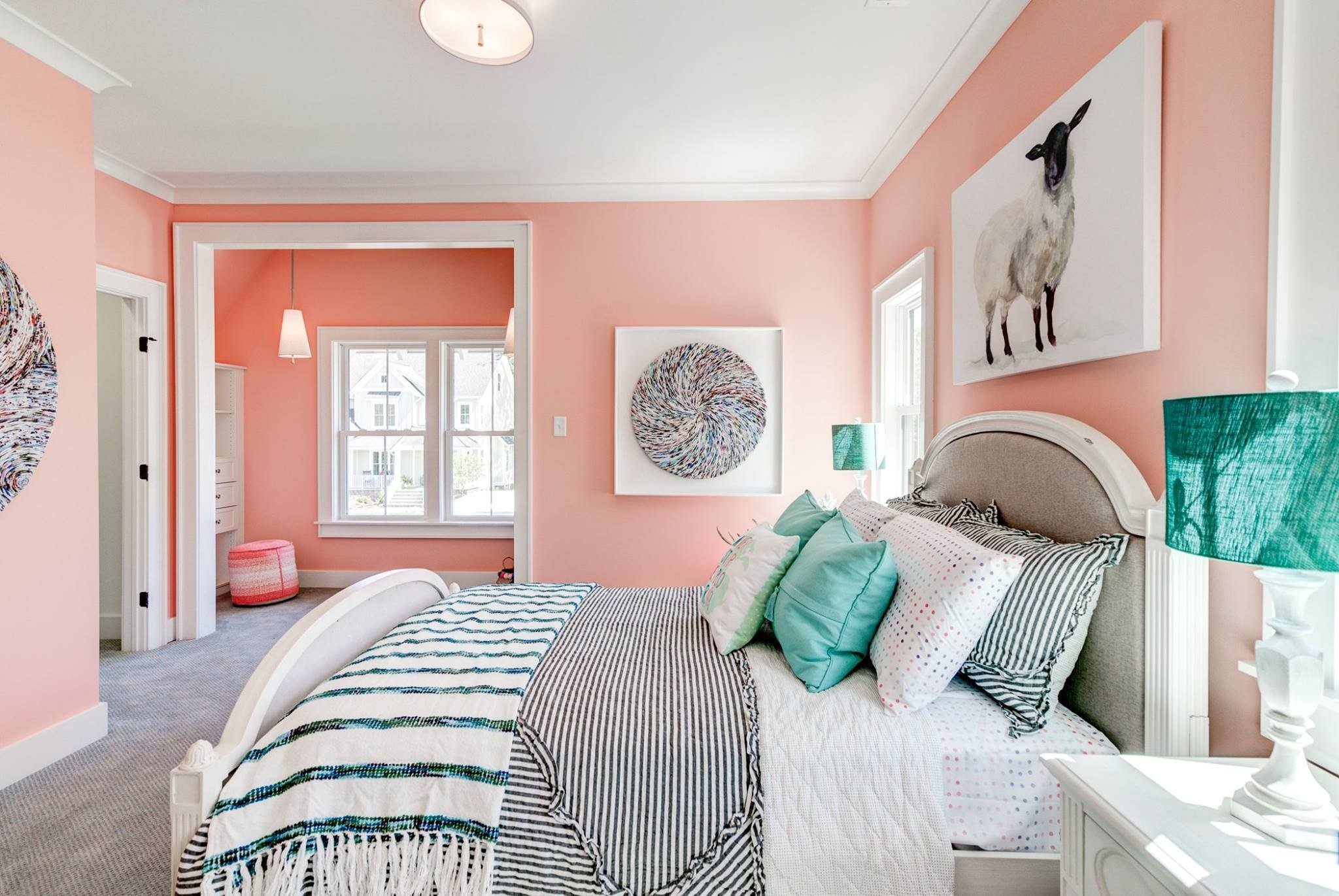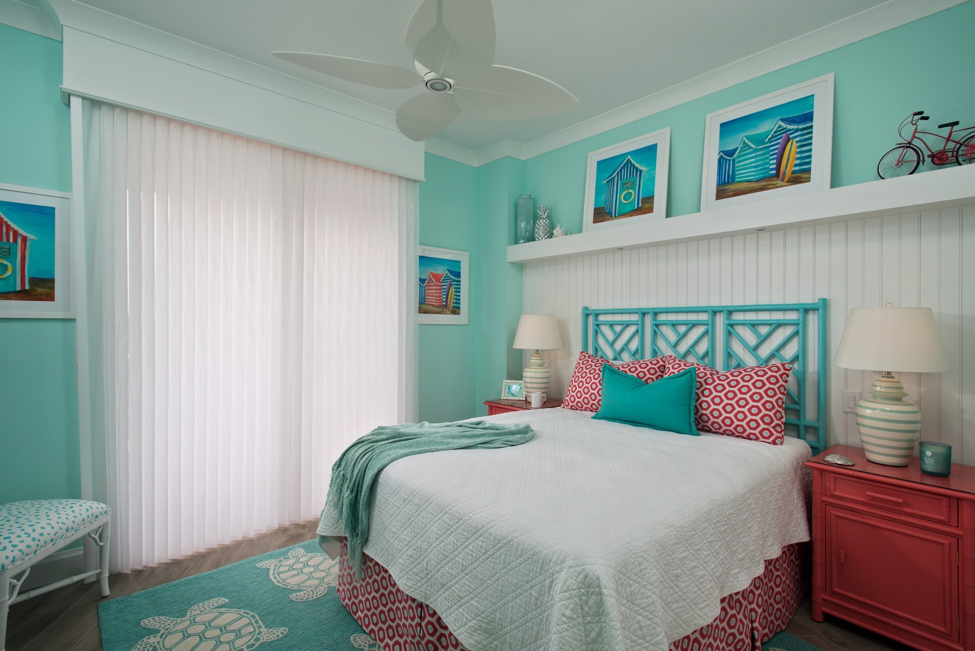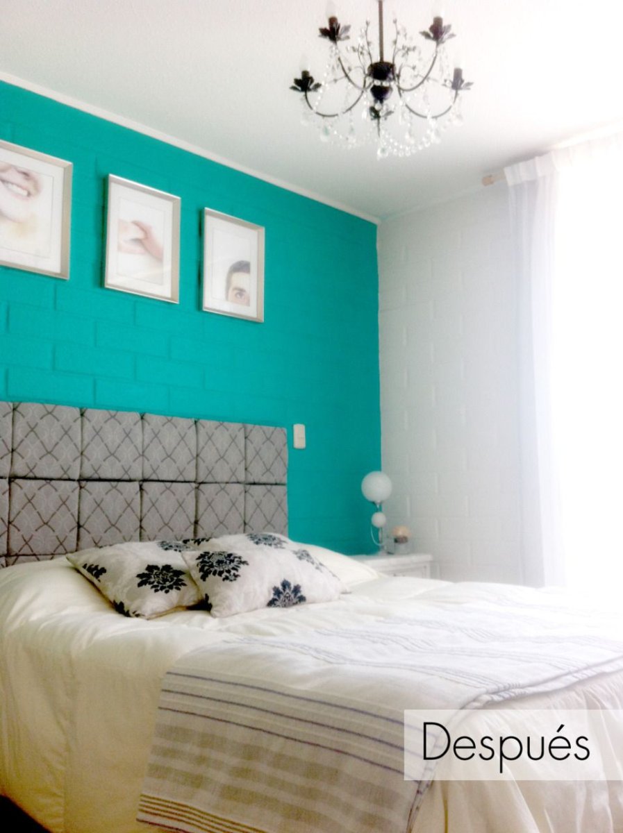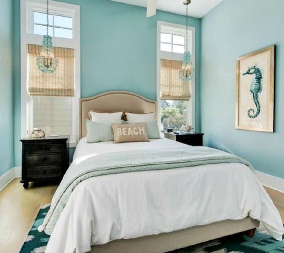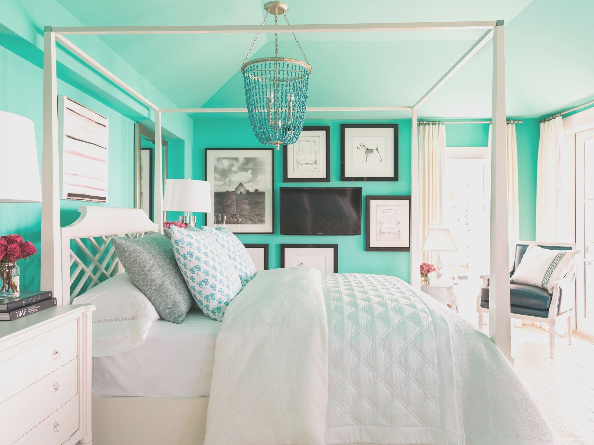 Спальня в современном стиле в светлых тонах с зеленым покрывалом