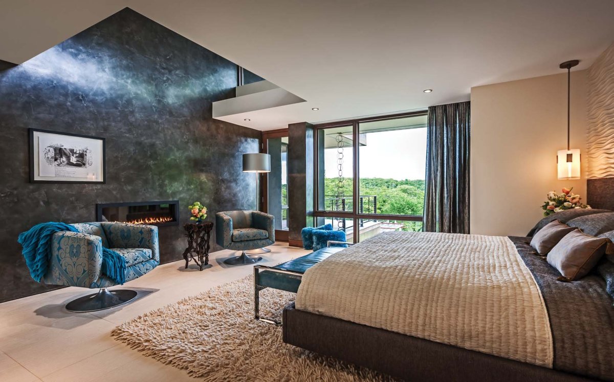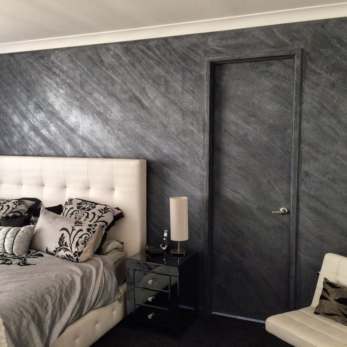 Спальня с серой венецианской штукатуркой современно