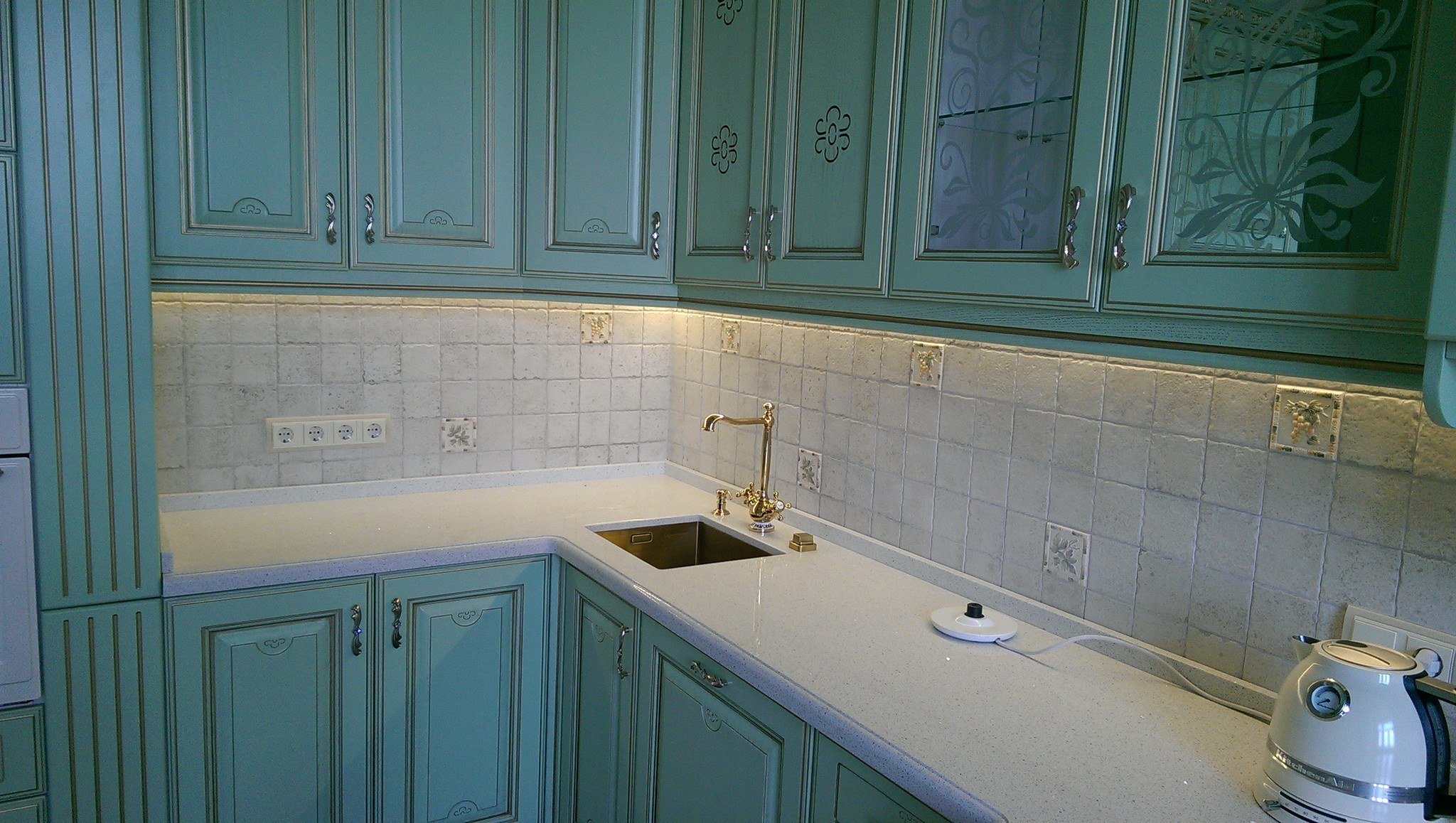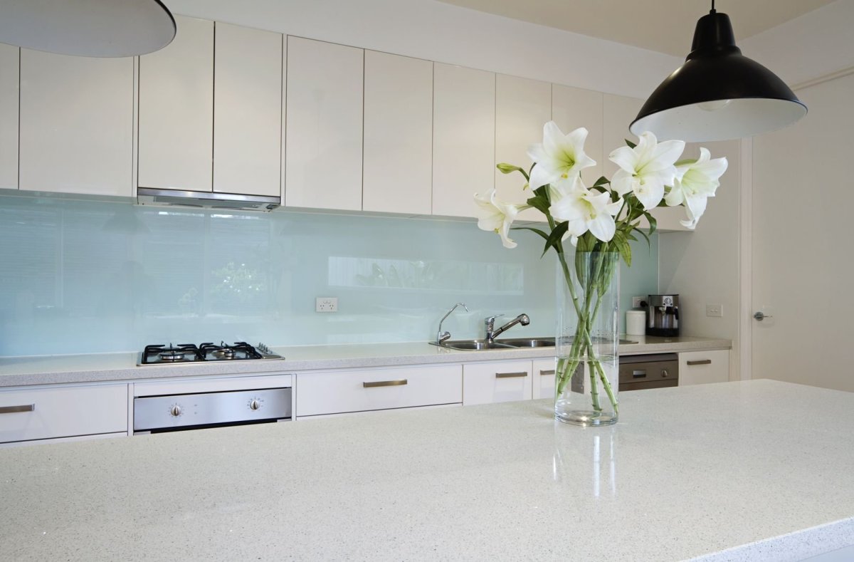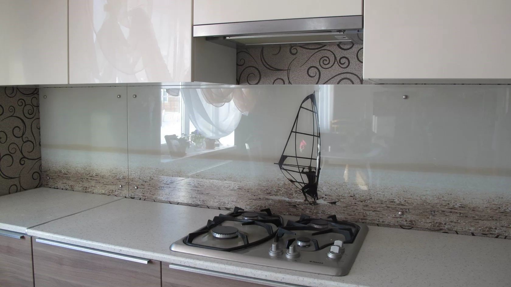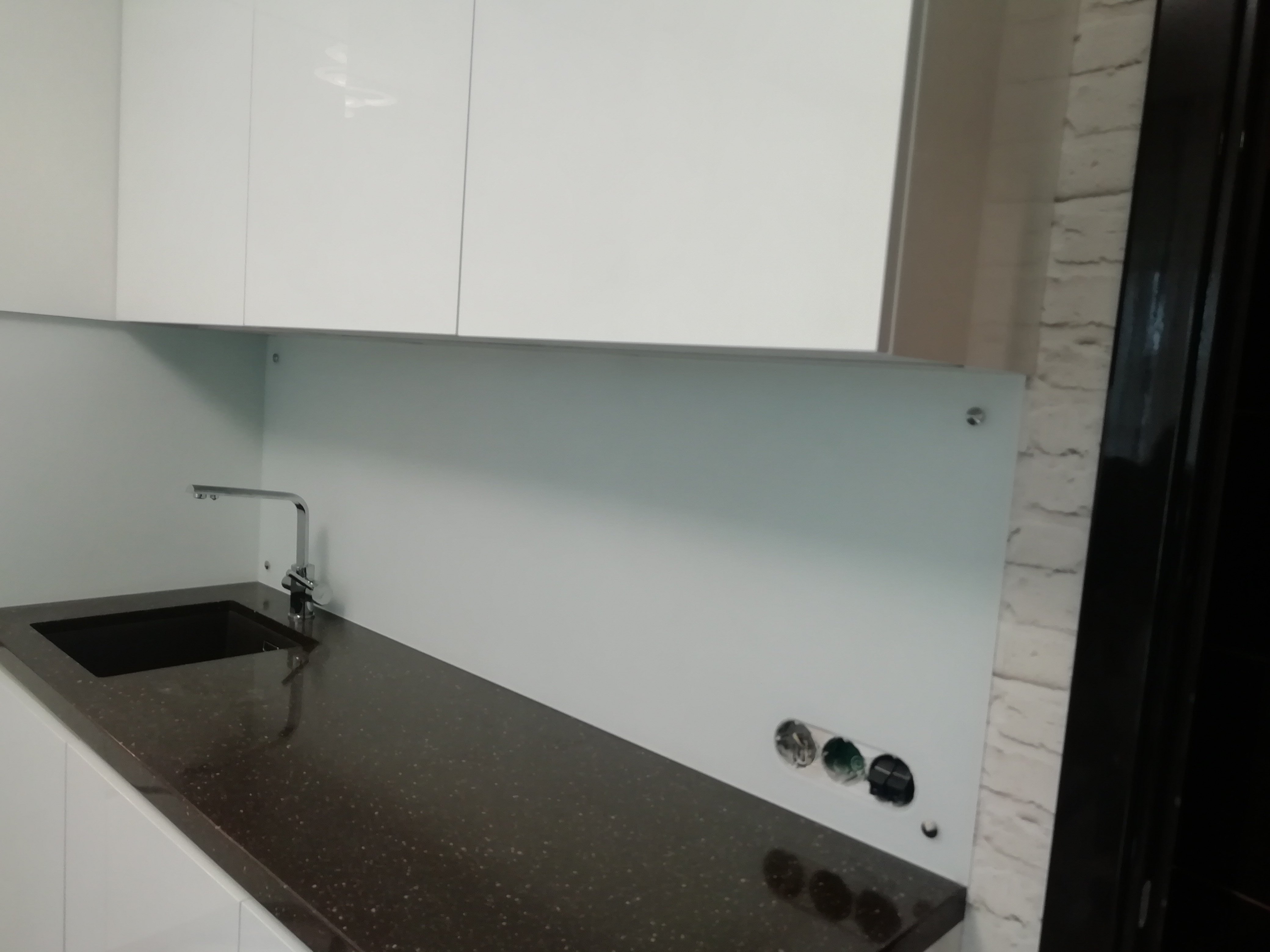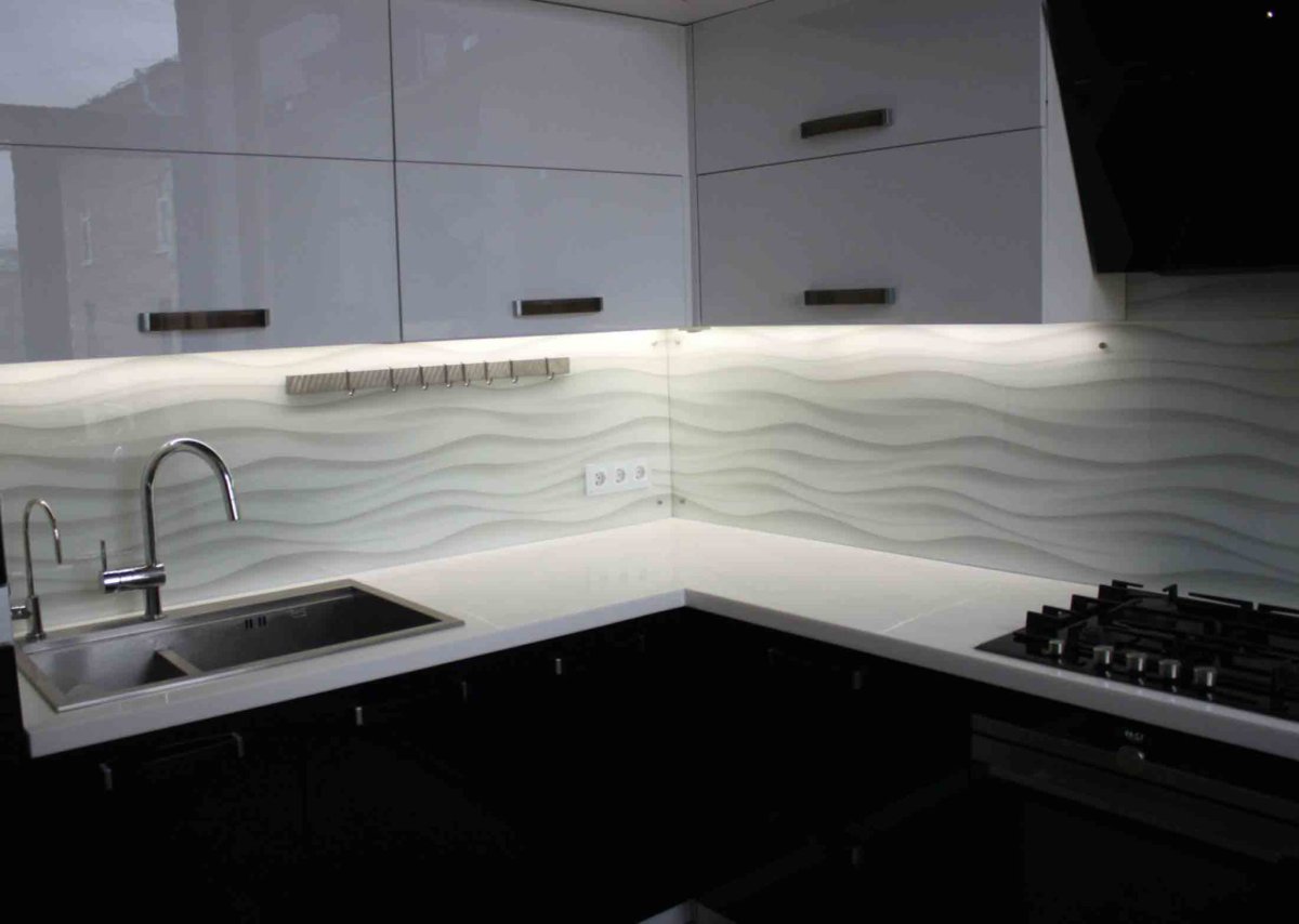 Стеклянный фартук для белой кухни