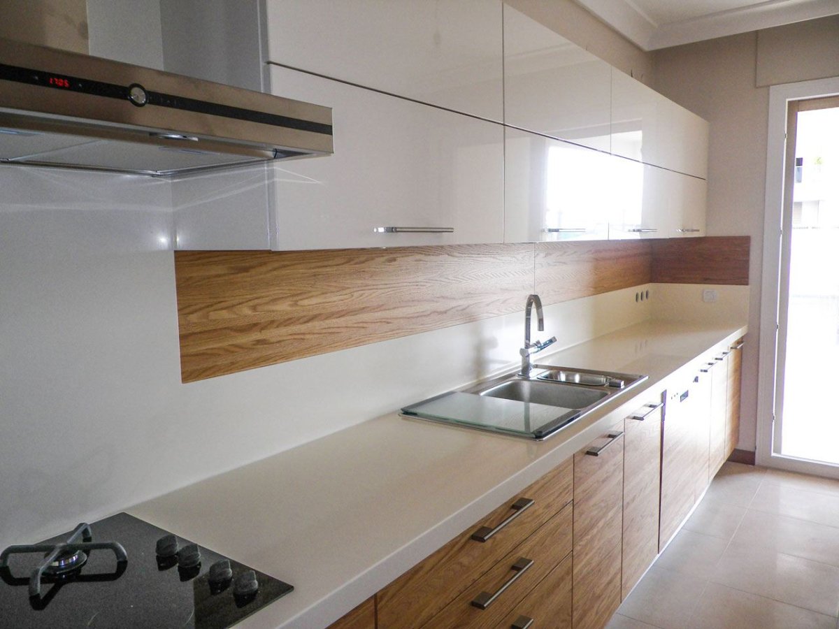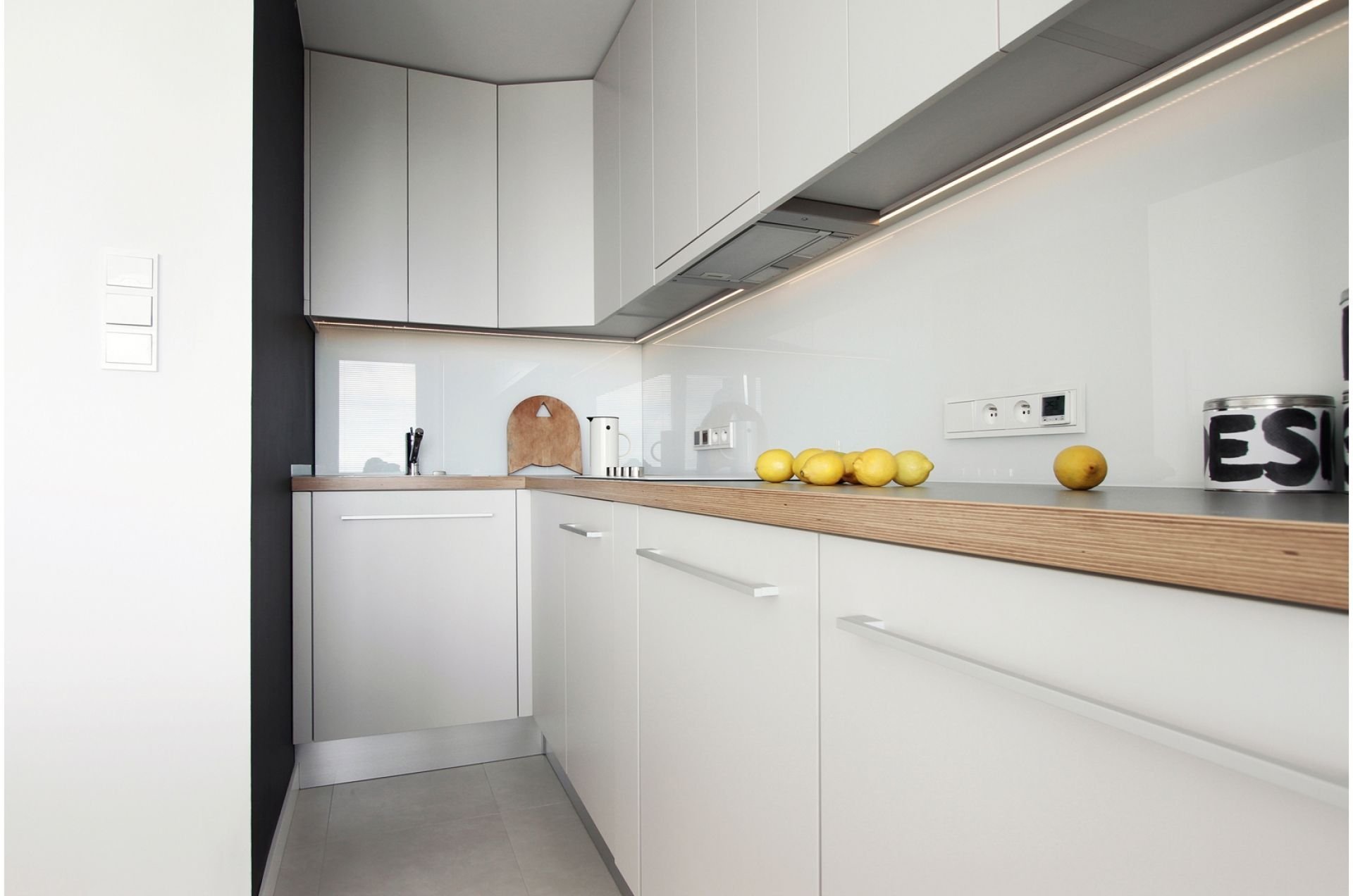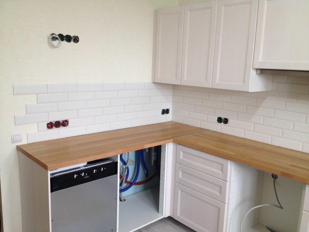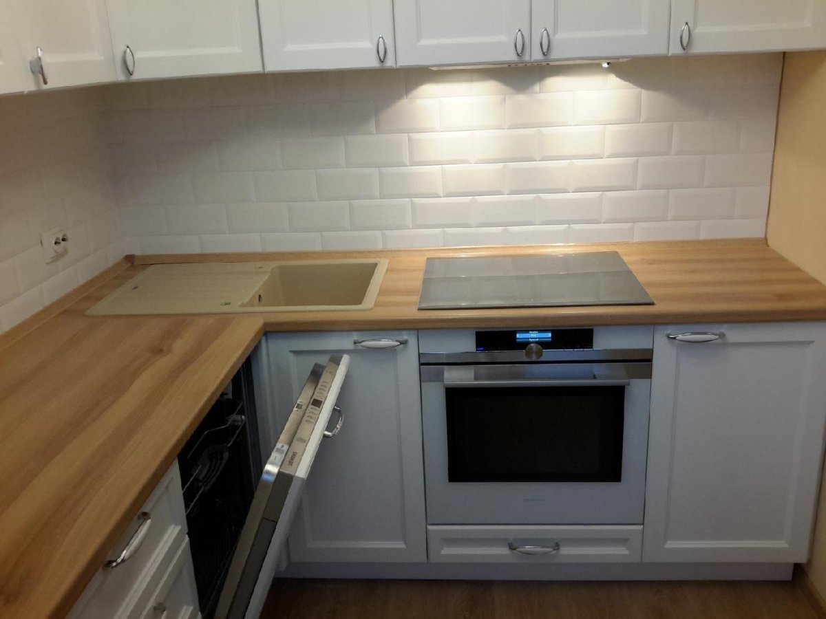 Белая кухня с деревянной столешницей и белым фартуком
