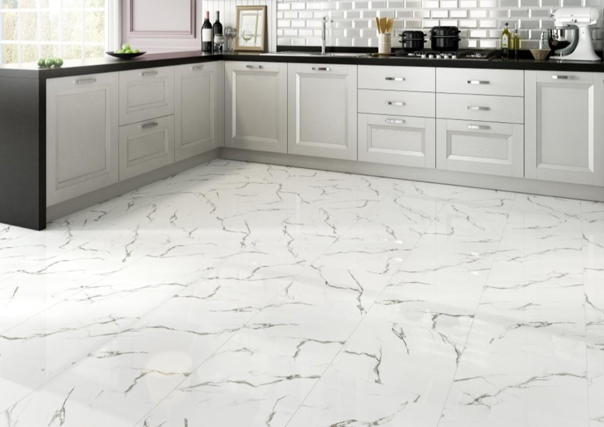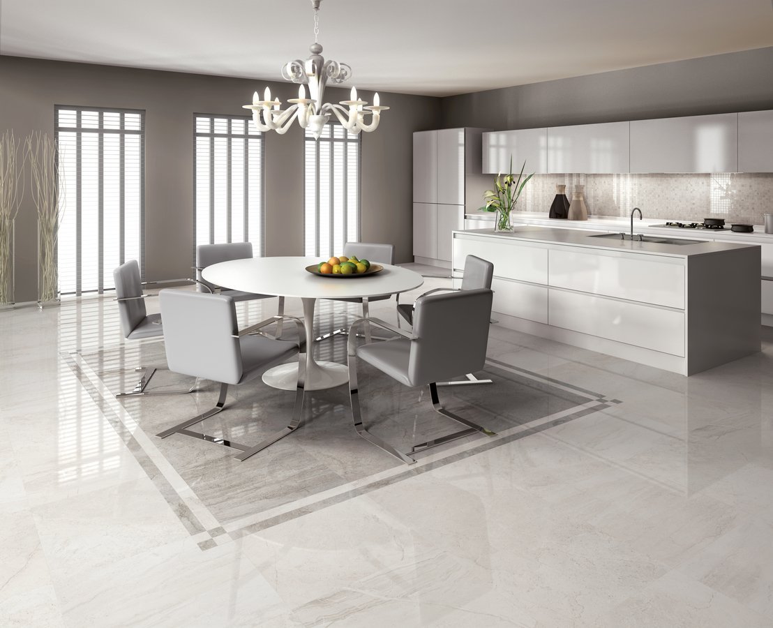 Белый мраморный пол в интерьере кухни