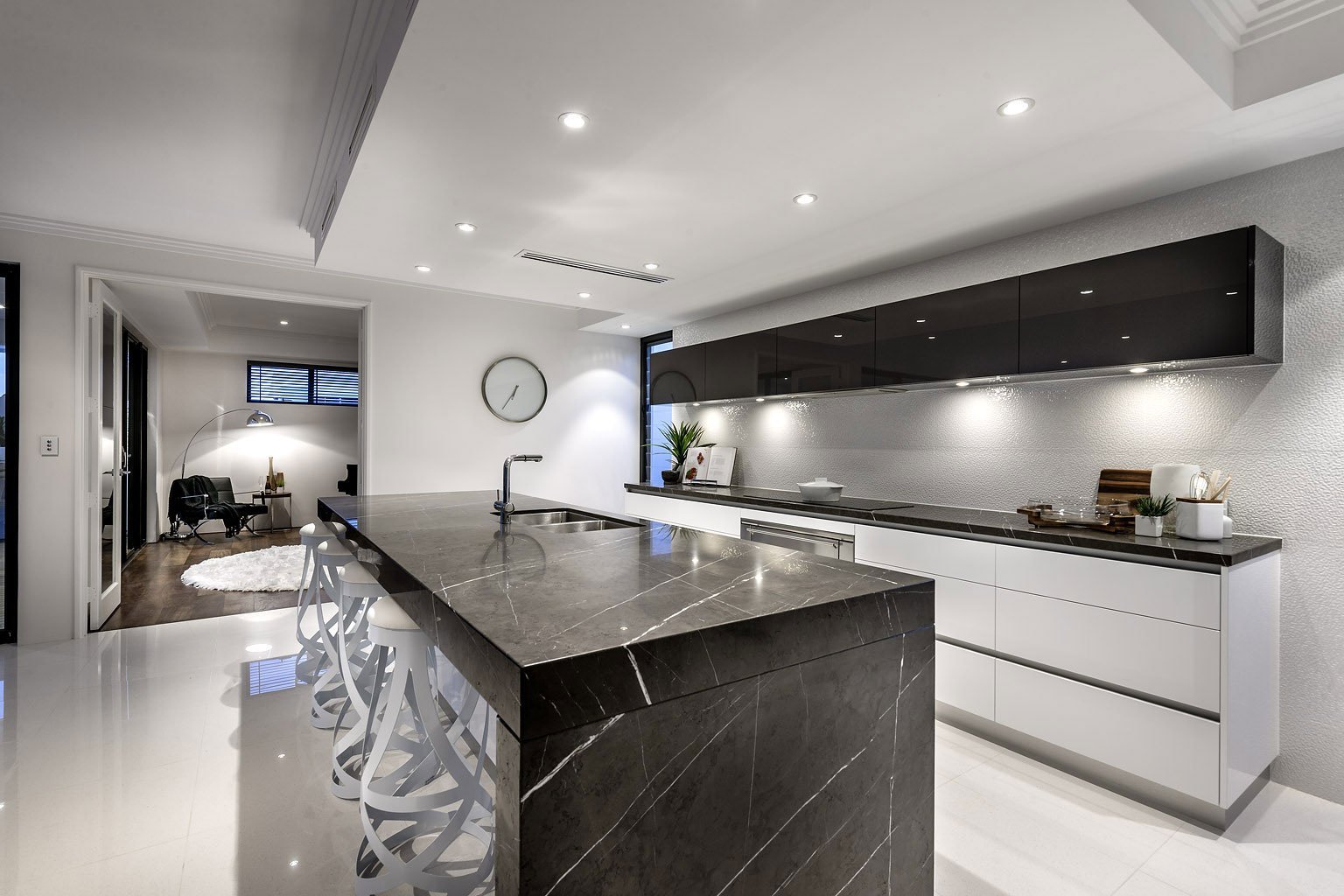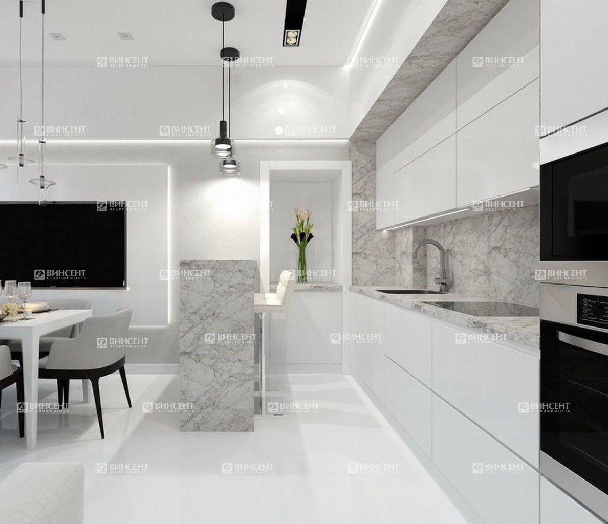 Кухня гостиная с белым мраморным полом