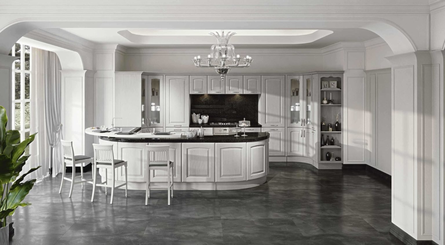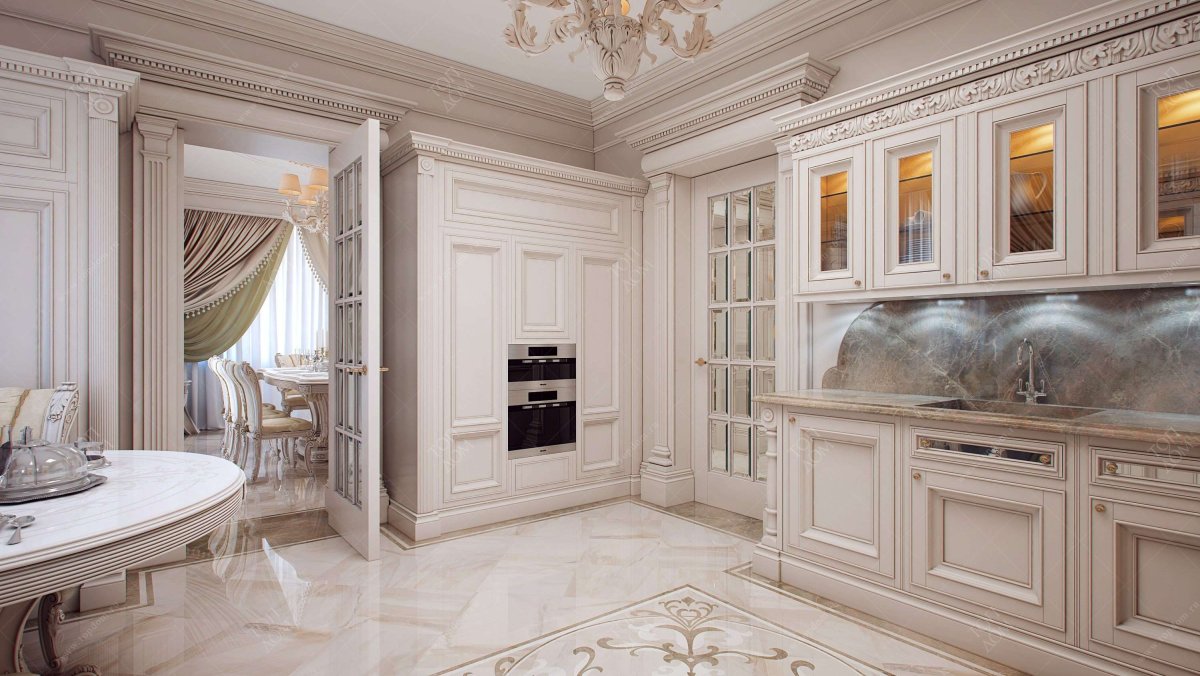 Кухня Неоклассика белая пол белый мрамор