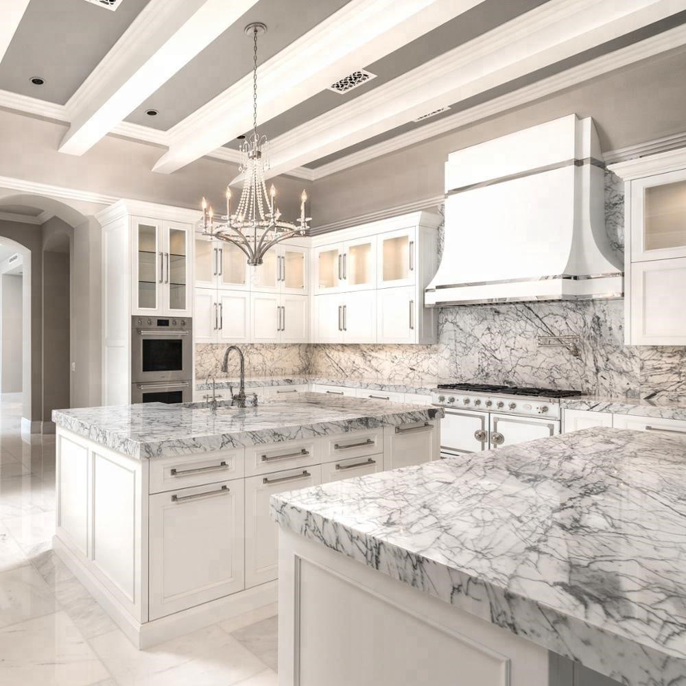 Белая кухня с мраморной столешницей
