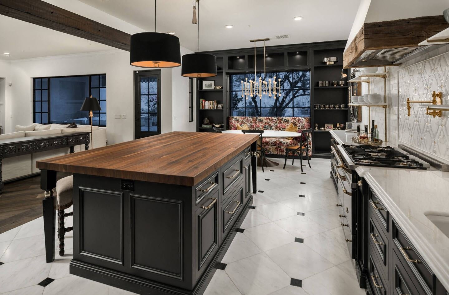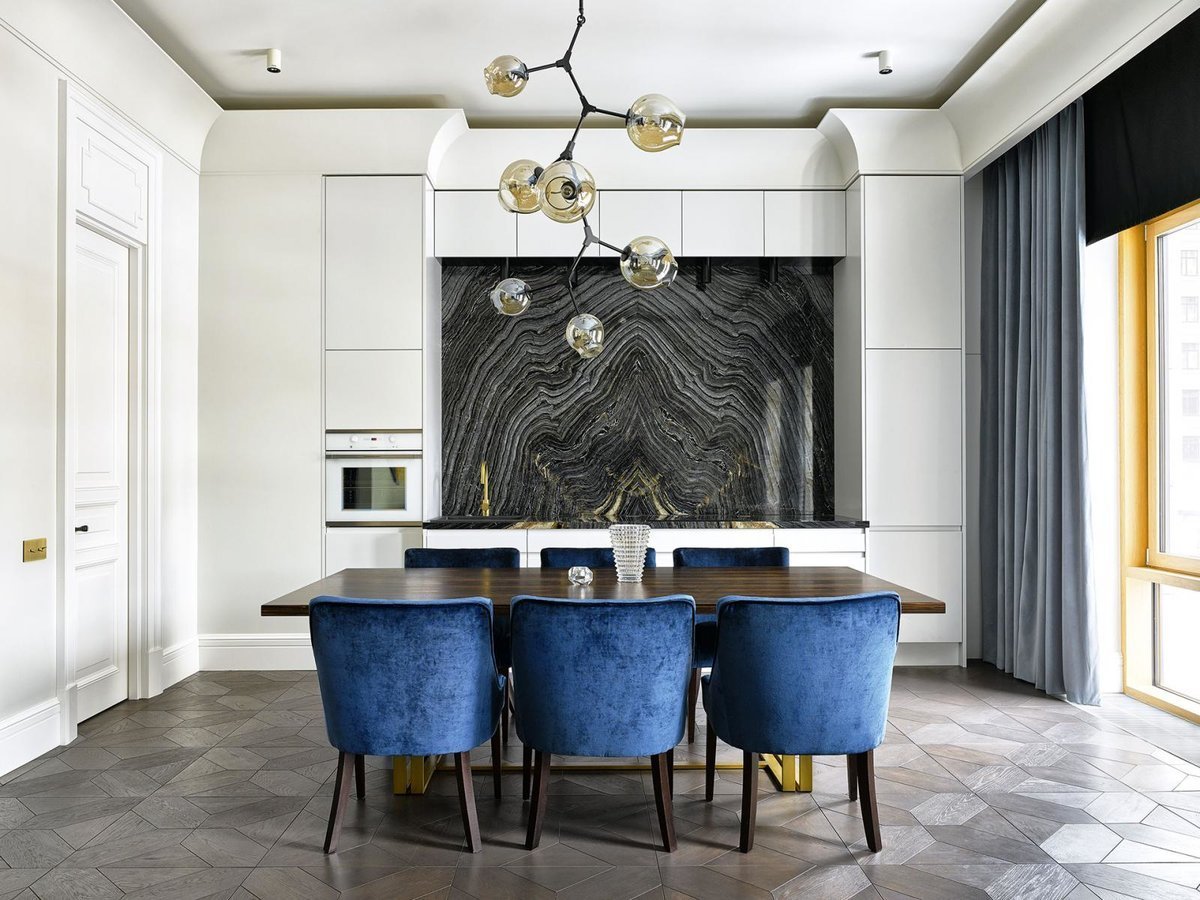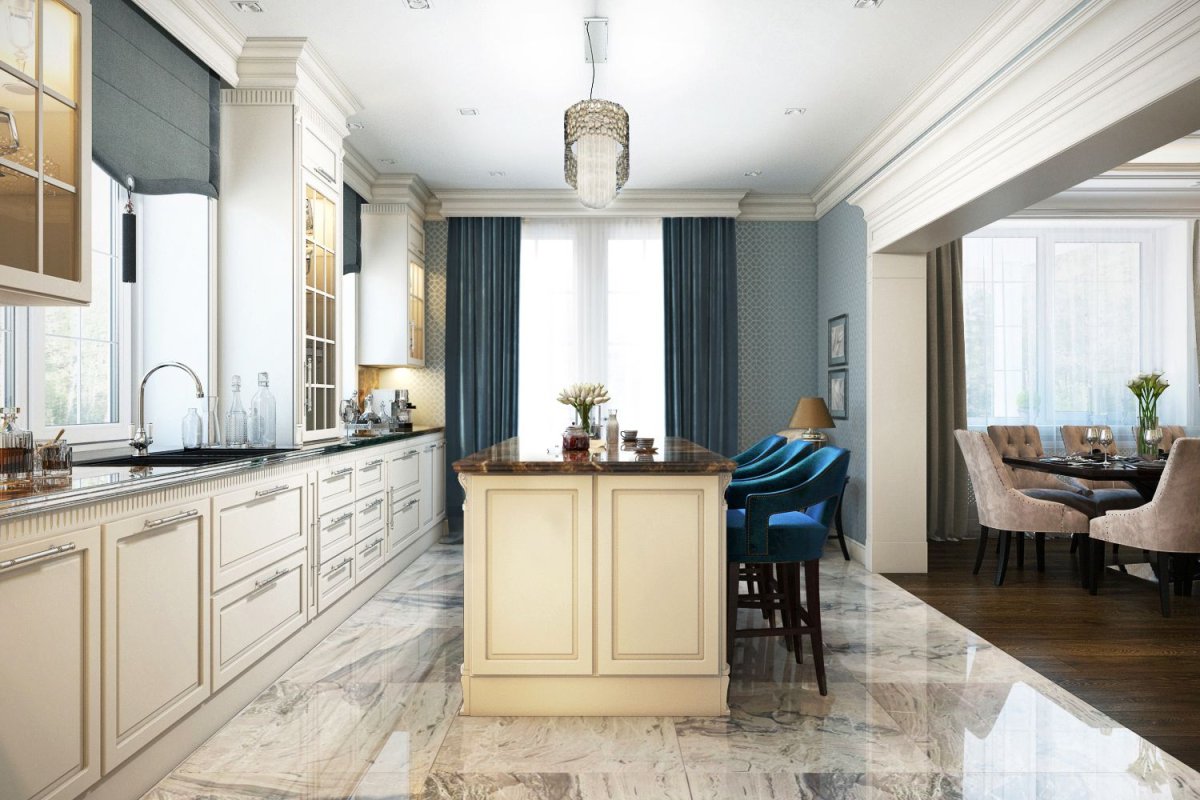 Интерьер кухни с мраморным полом