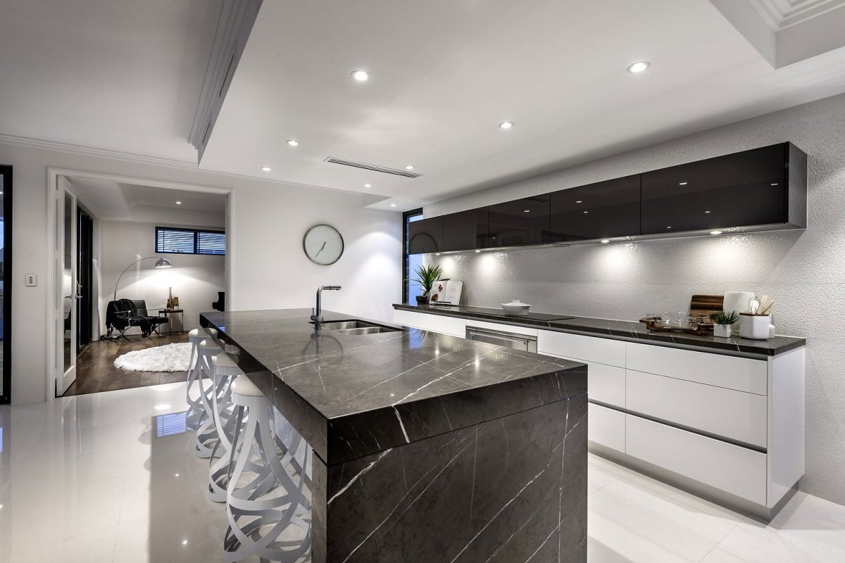Серый мрамор в интерьере кухни
