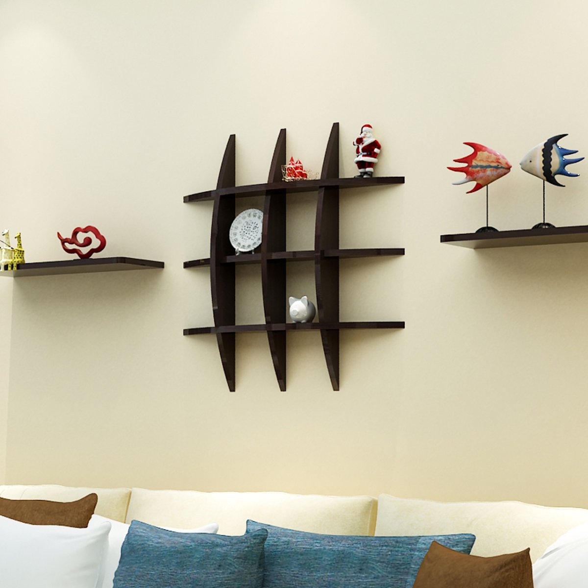 Полочки над диваном в гостиной