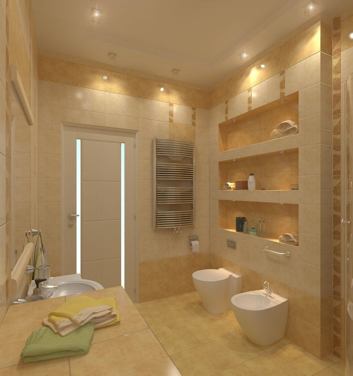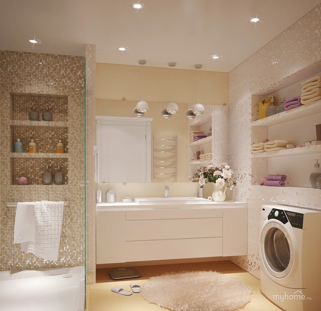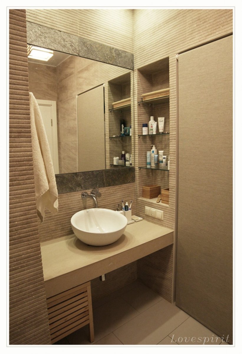 Ванная комната с встроенными полками в бежевом цвете