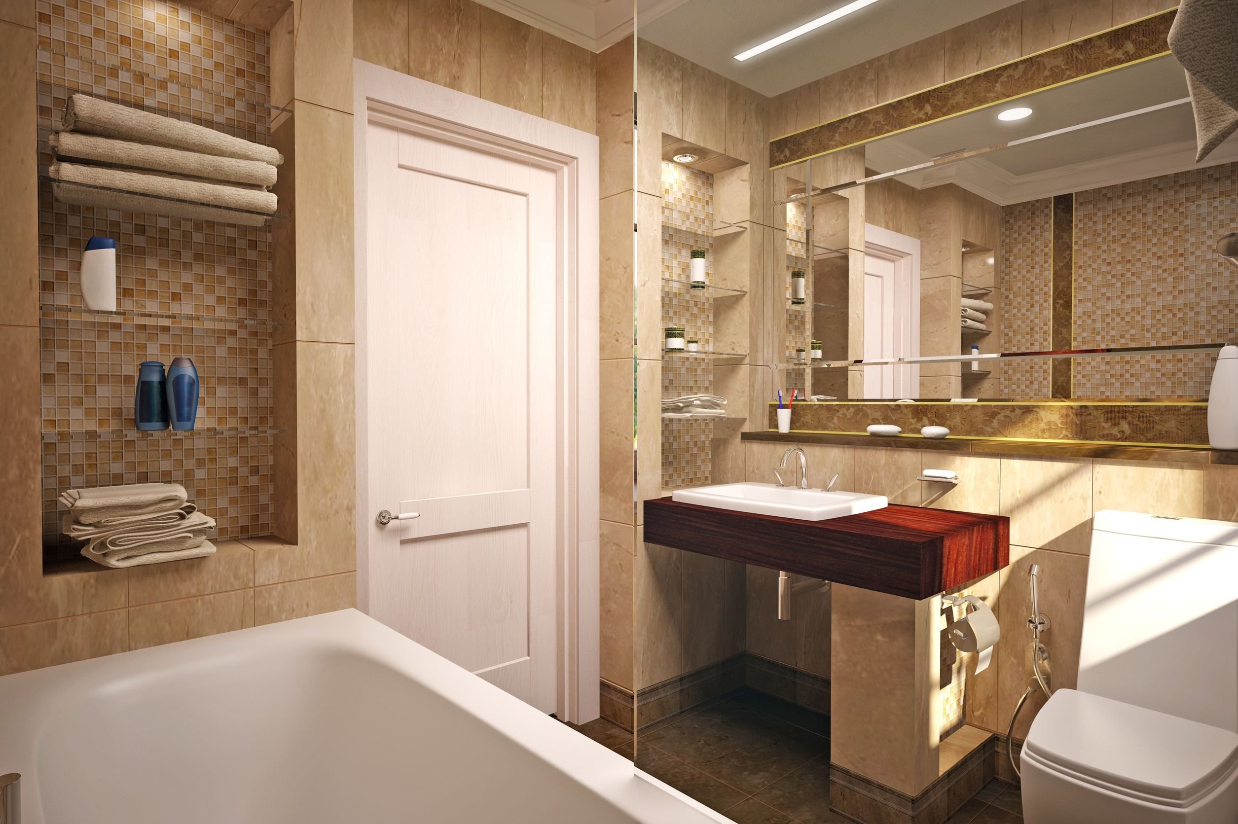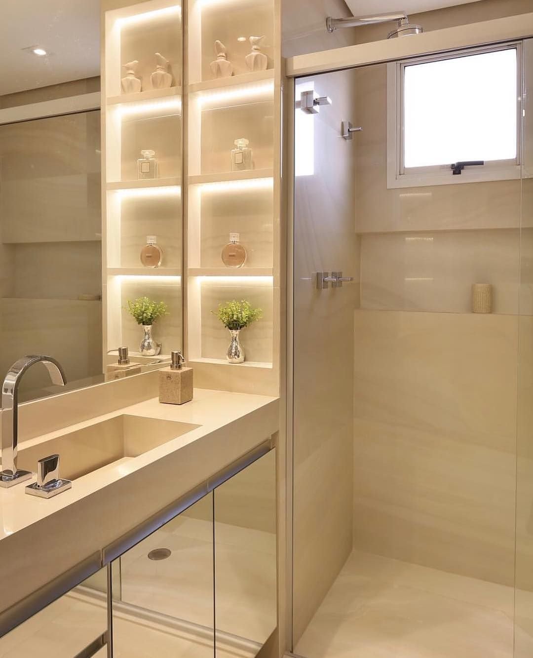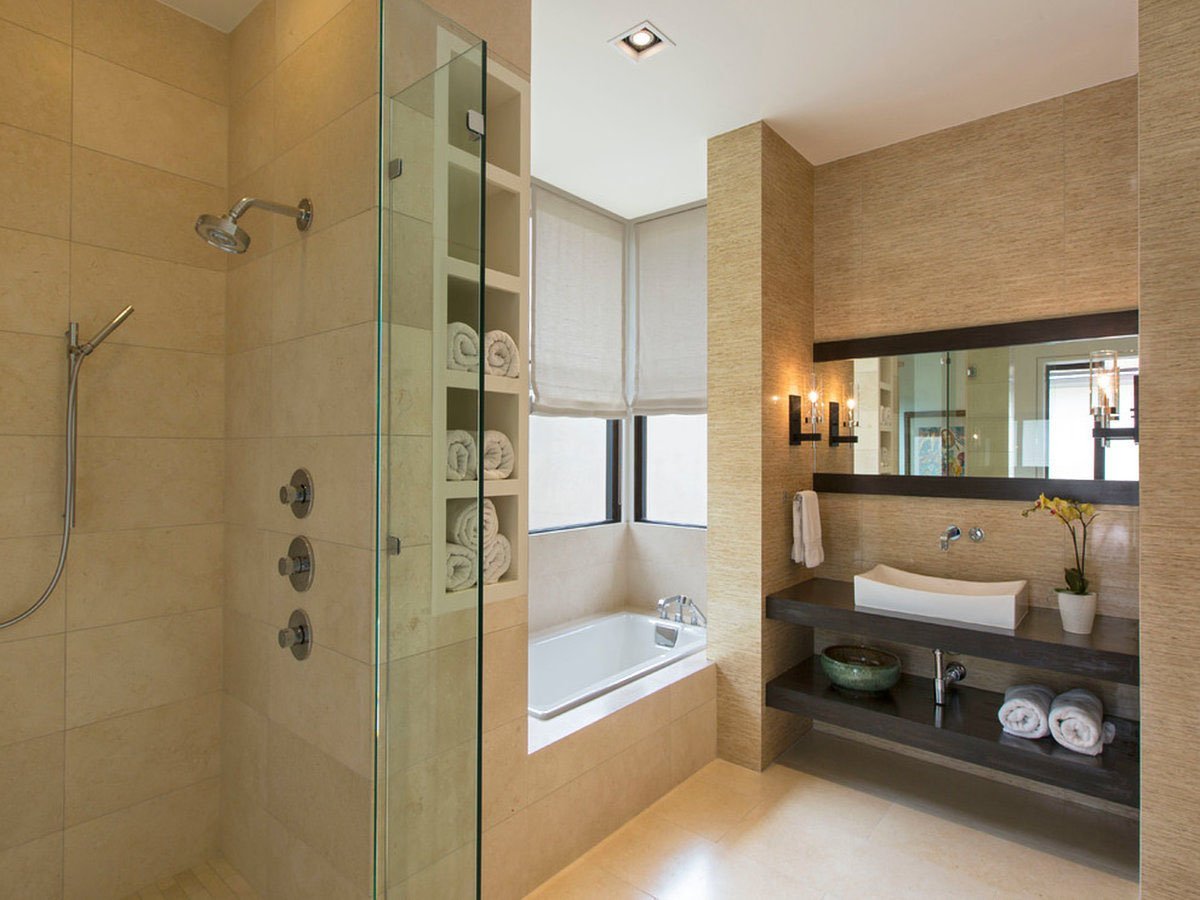 Ванная комната с встроенными полками в бежевом цвете