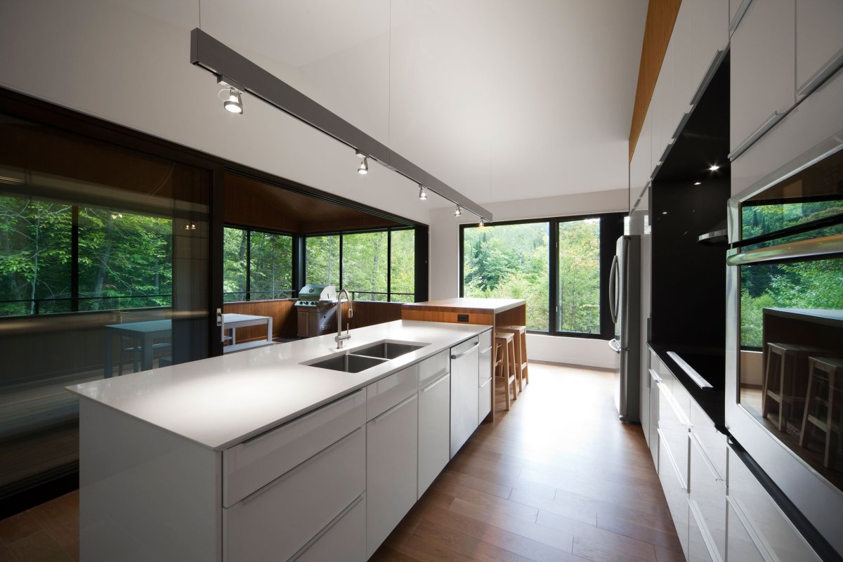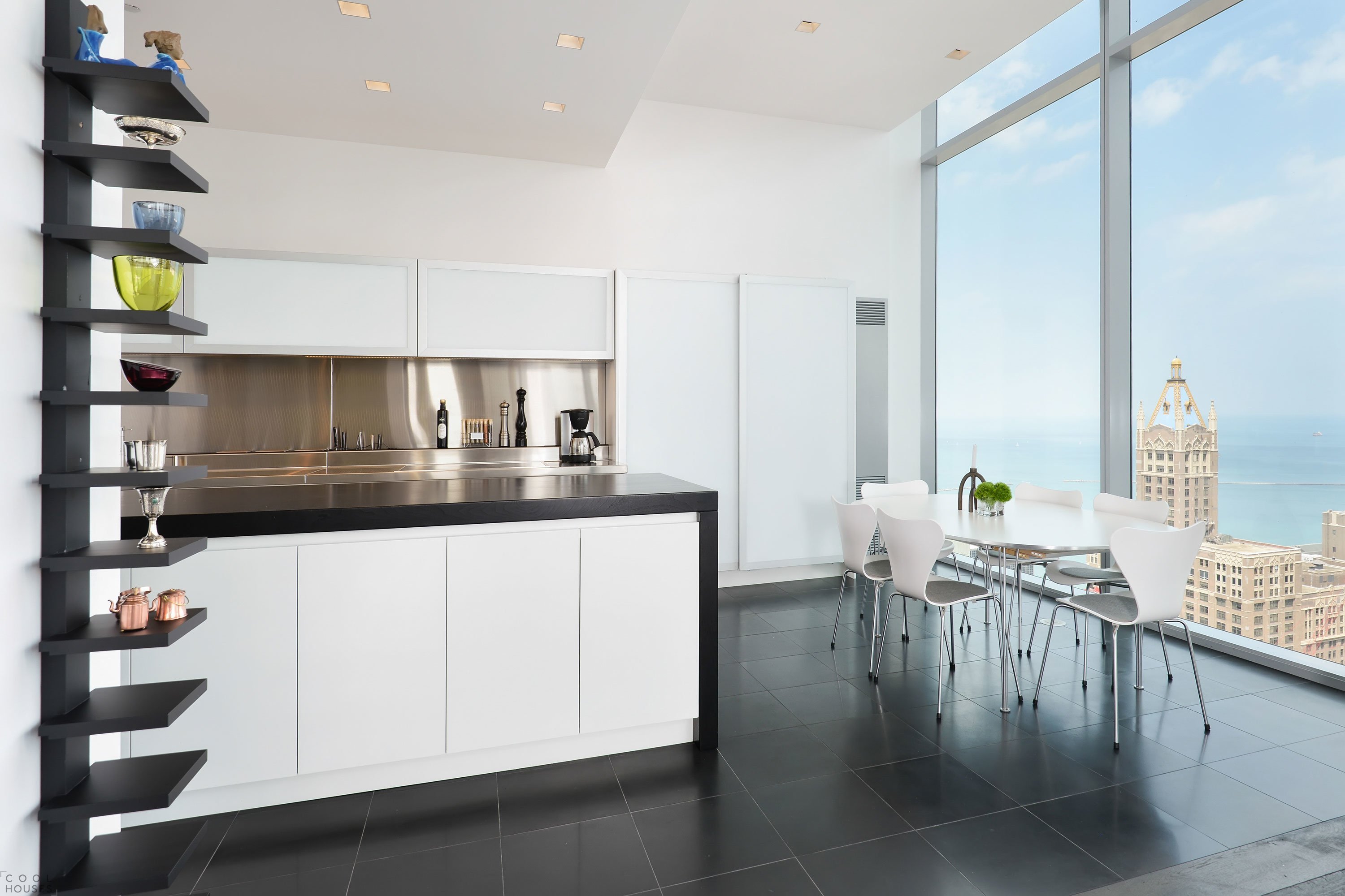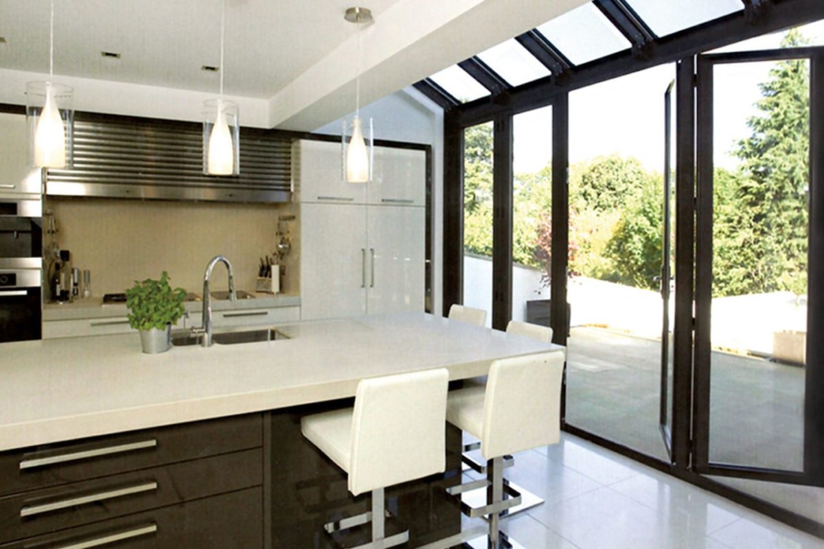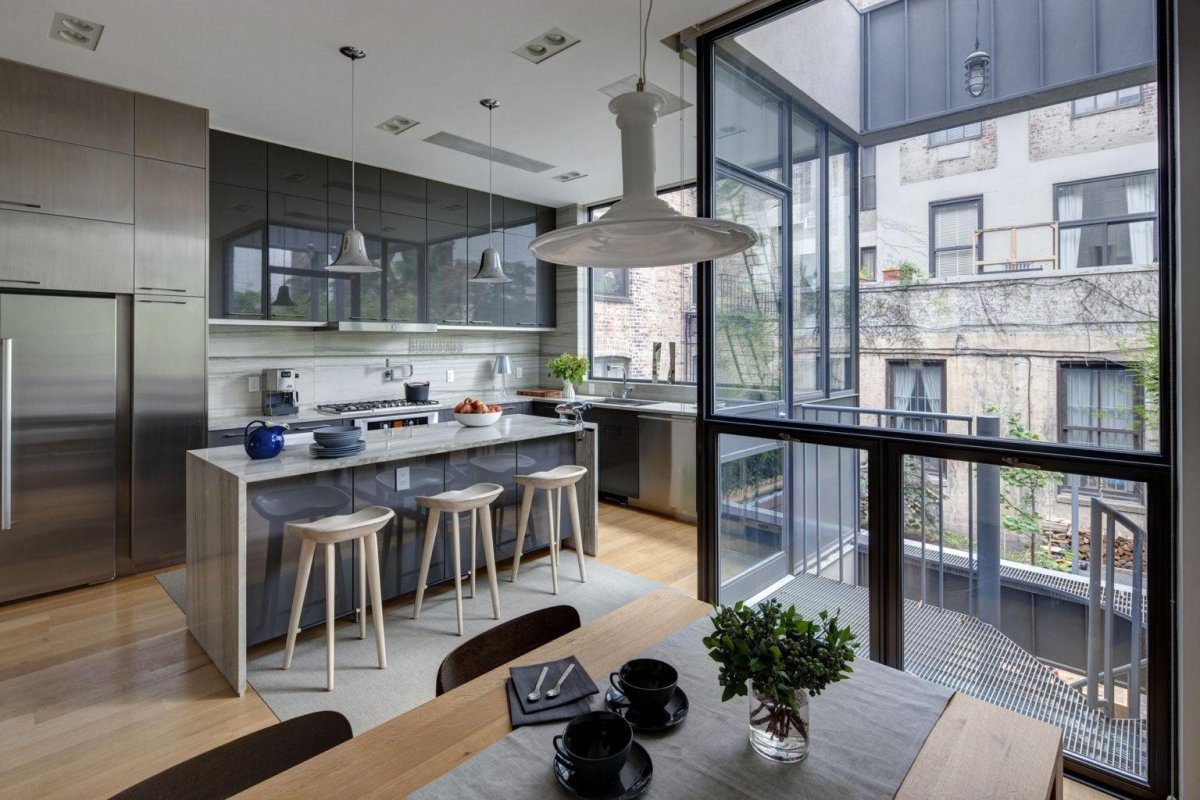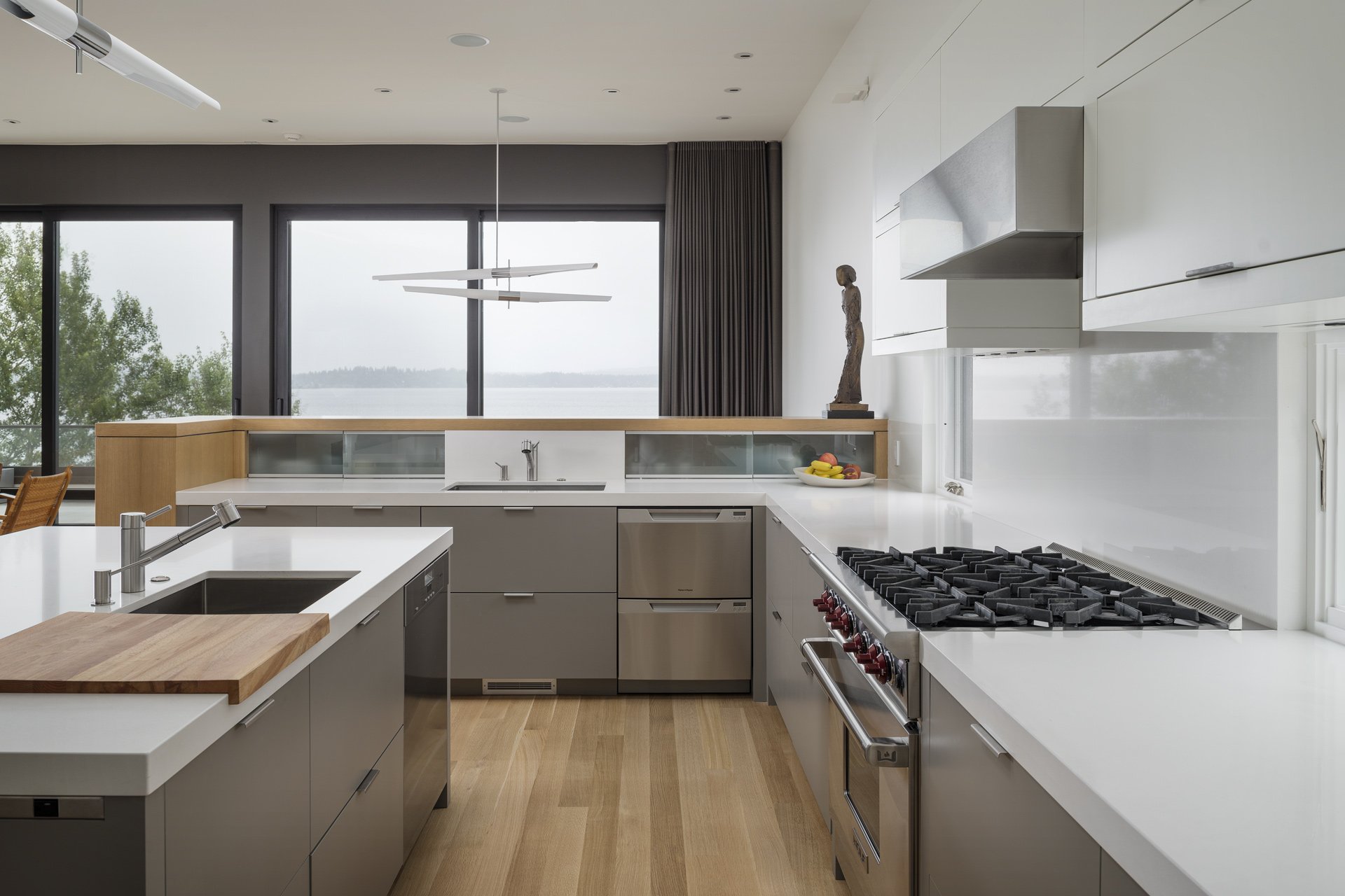 Кухни в стиле Модерн с барной стойкой и панорамными окнами