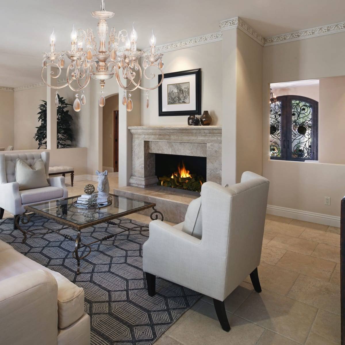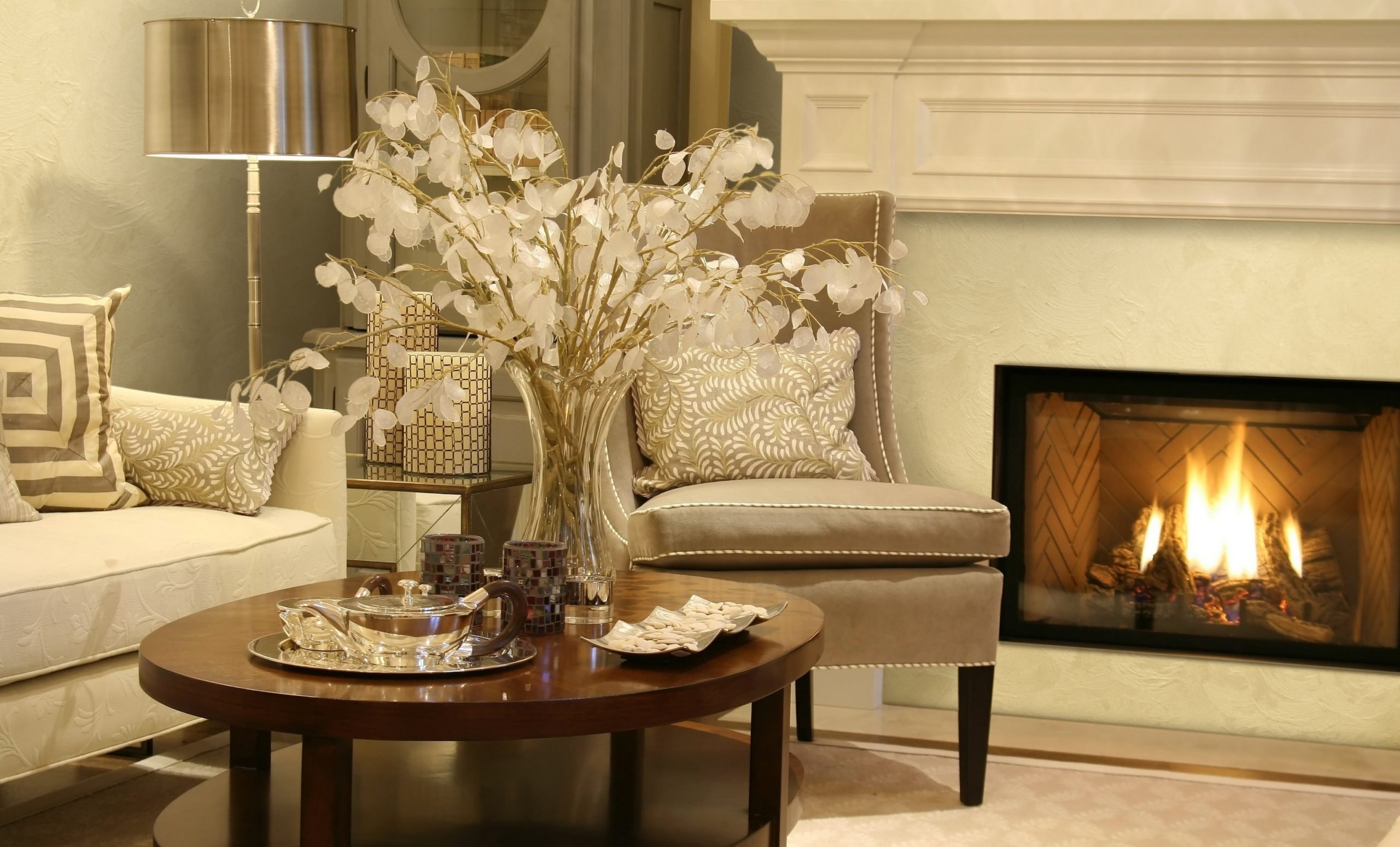 Бежевая гостиная с камином