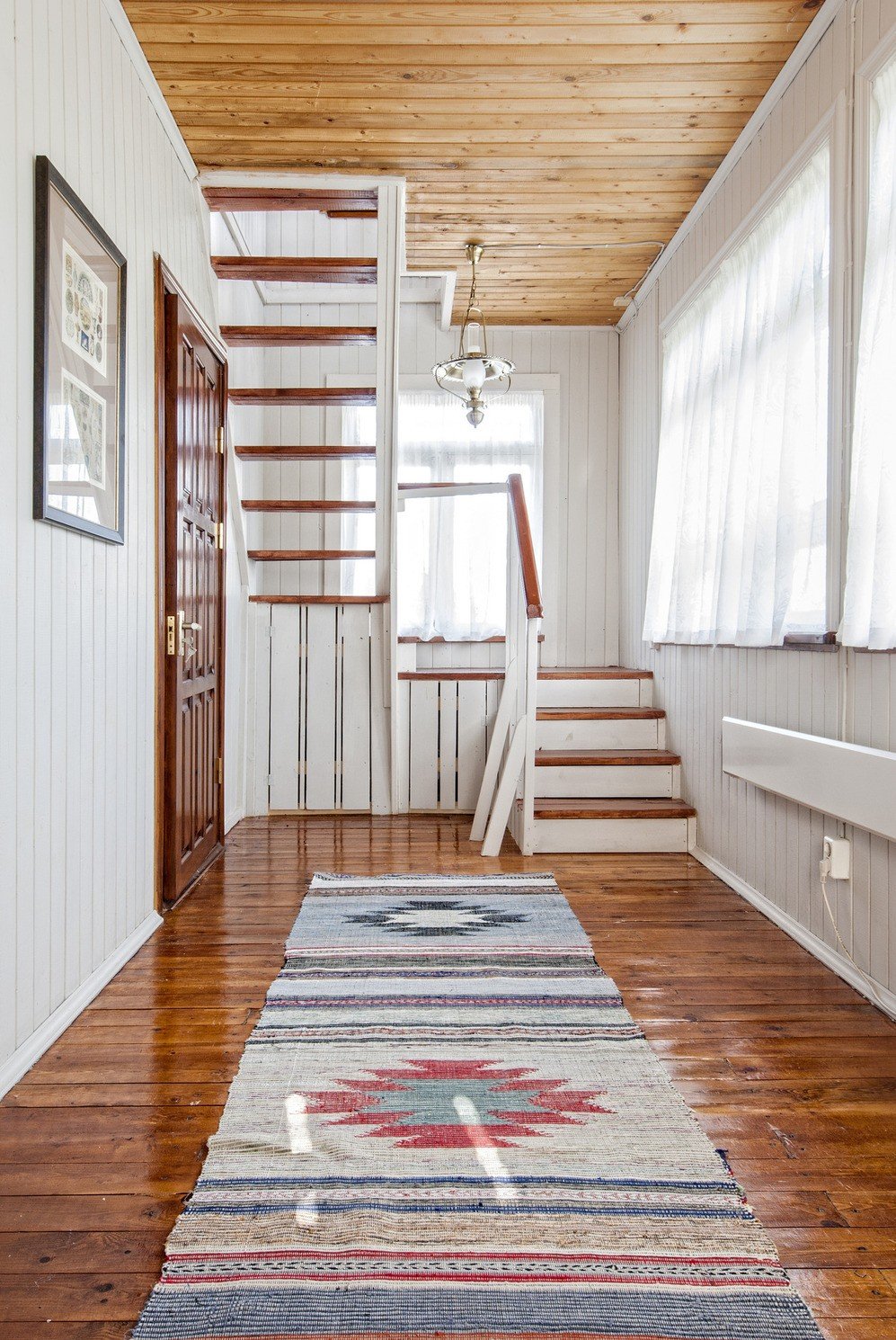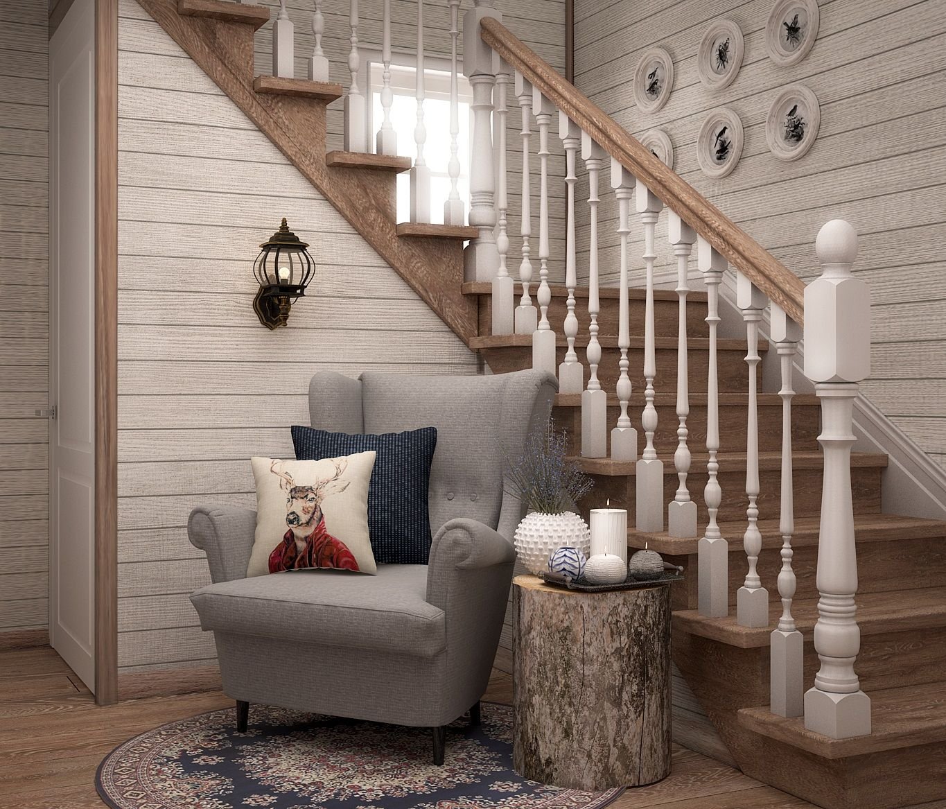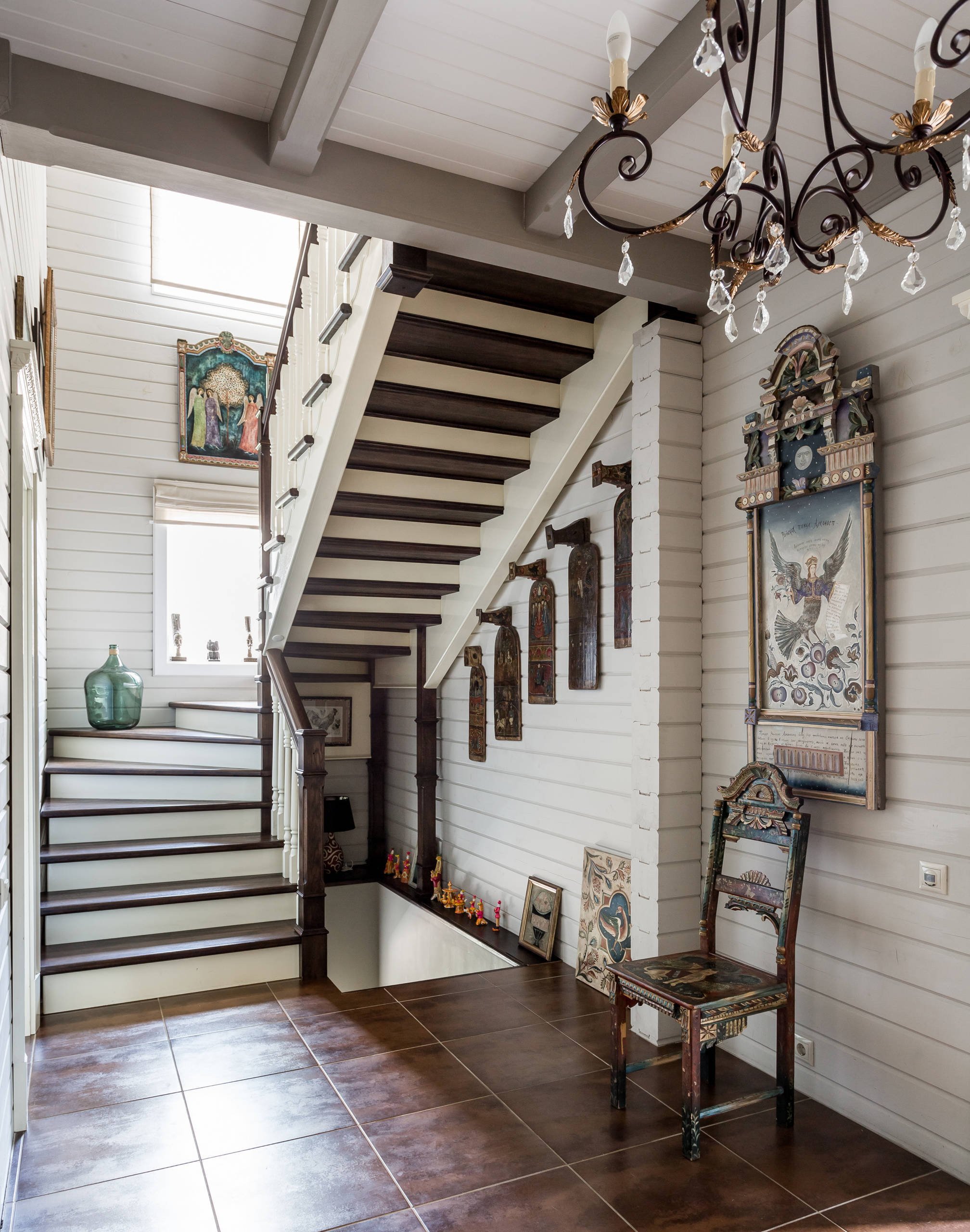 Прихожая в деревянном доме с лестницей